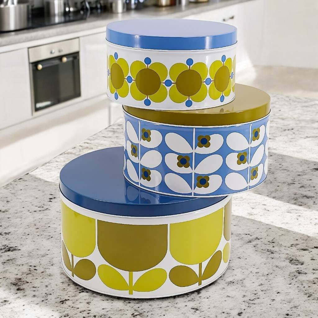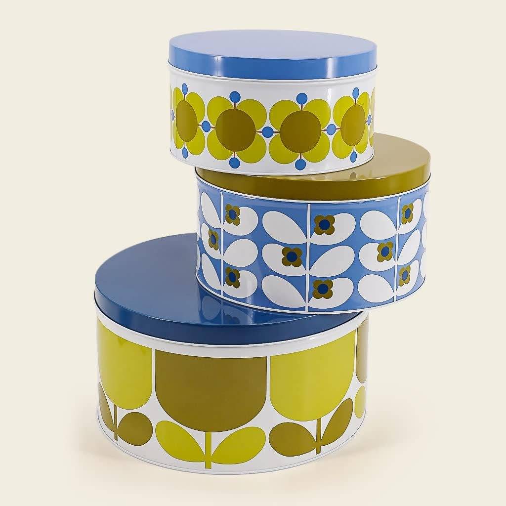 From one the world's top fashion designers Orla Kiely, comes these set of three metal cake storage tins three differrnt designs.