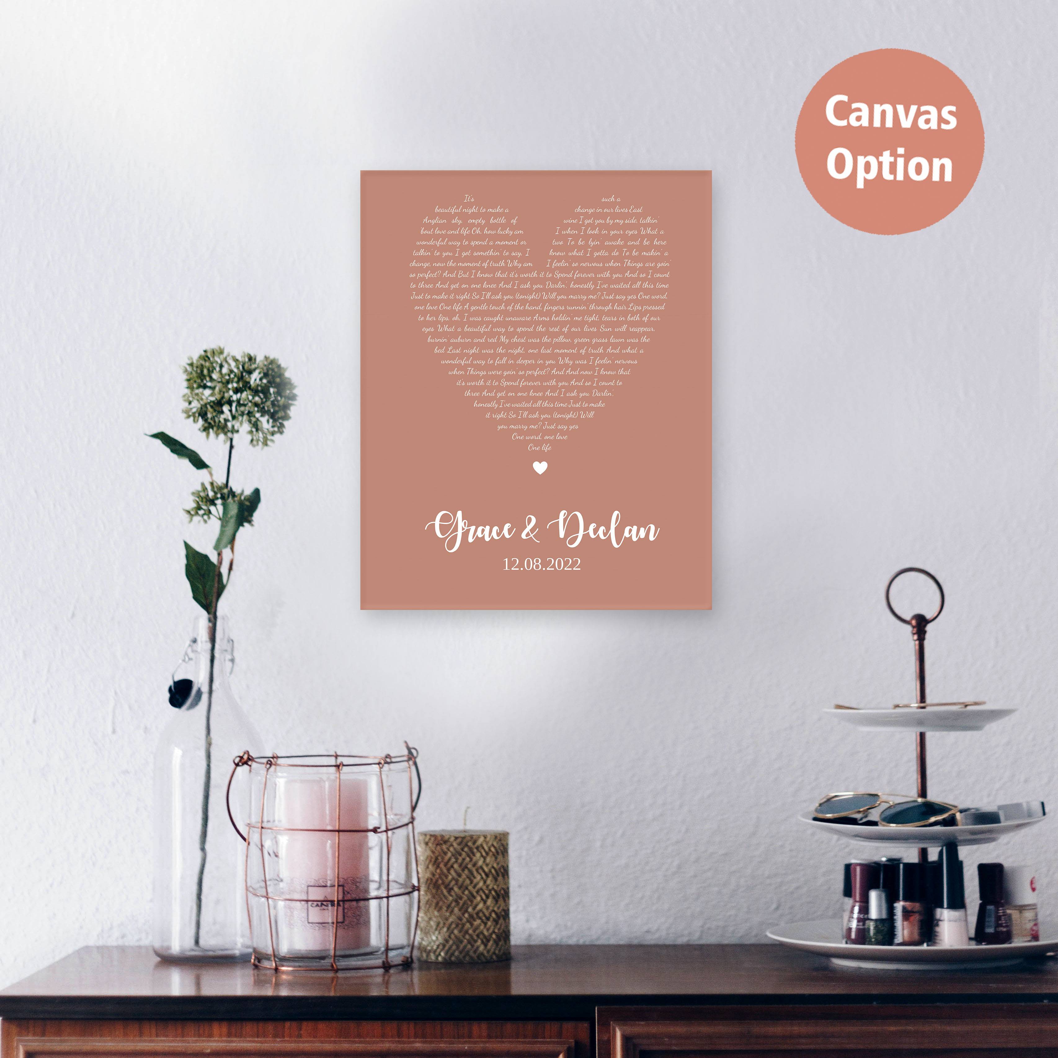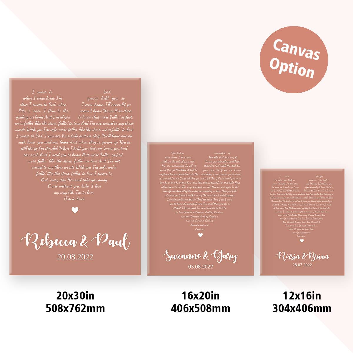 Our First Dance Lyrics Canvas - a romantic, heart-shaped artwork with your special song's lyrics written in elegant lettering. Perfect for anniversaries, Valentine's Day, or any special occasion. A timeless gift that your loved one will cherish forever.