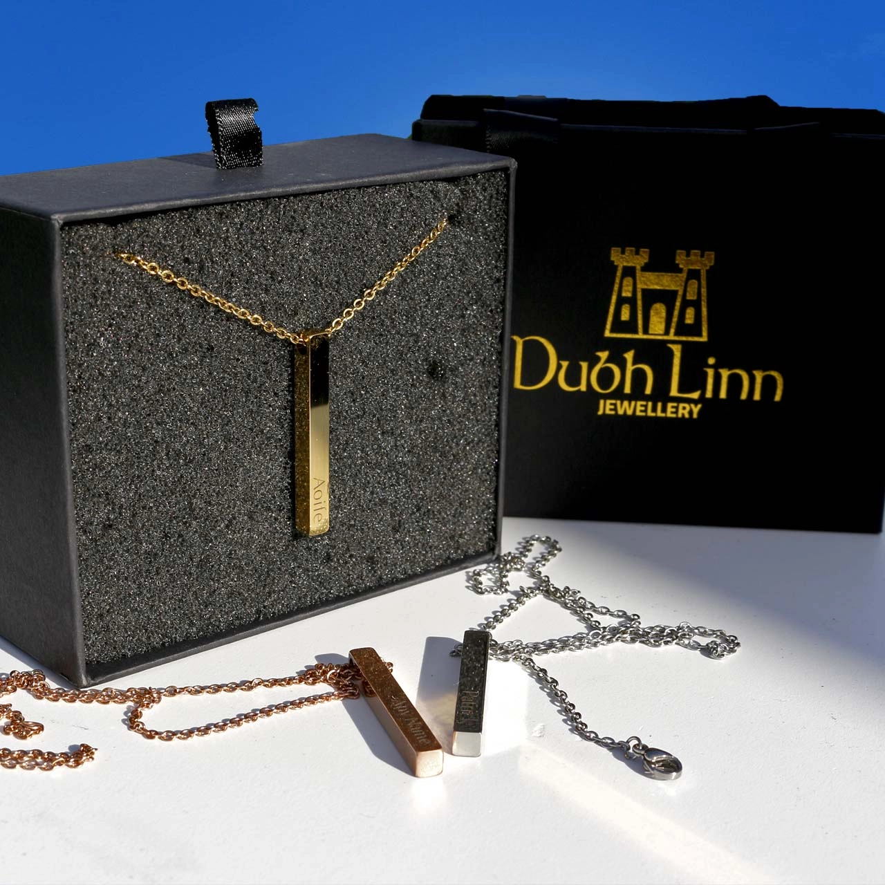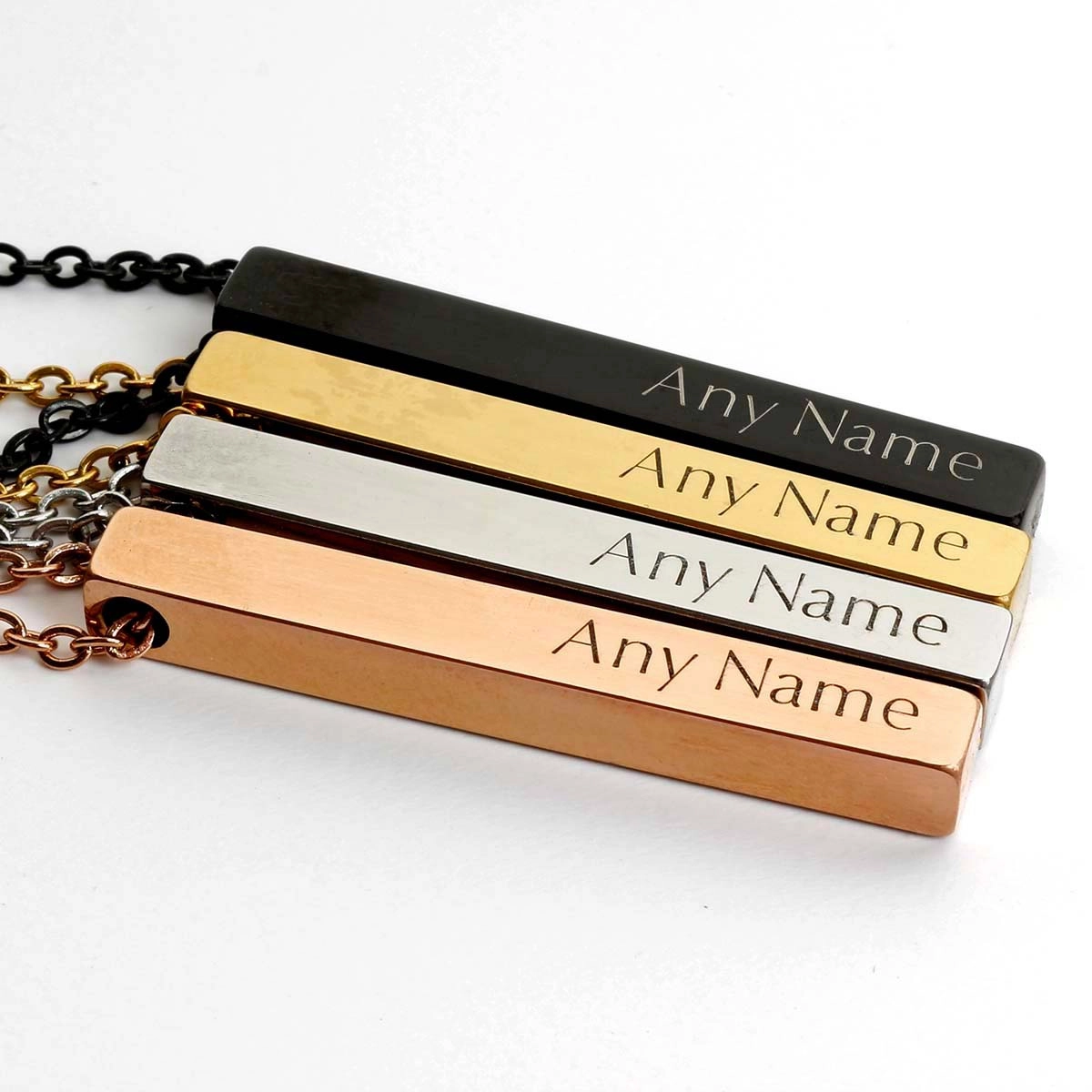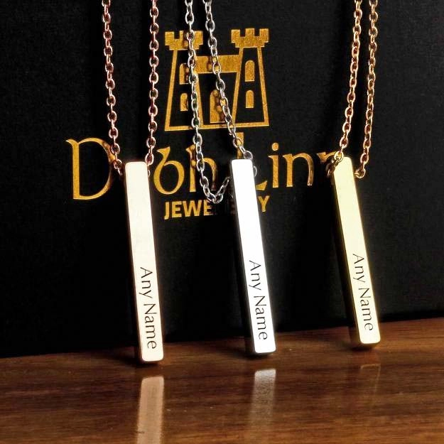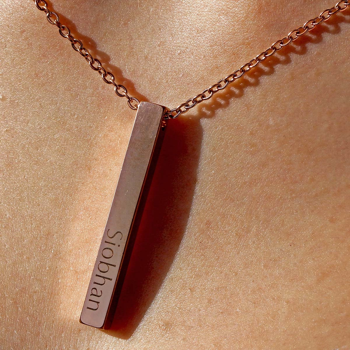 The Personalised Vertical Bar Pendant hanging from a Box chain, makes the perfect accessory for any occasion. See what else our Personalised Bar Necklaces Collection has to offer.