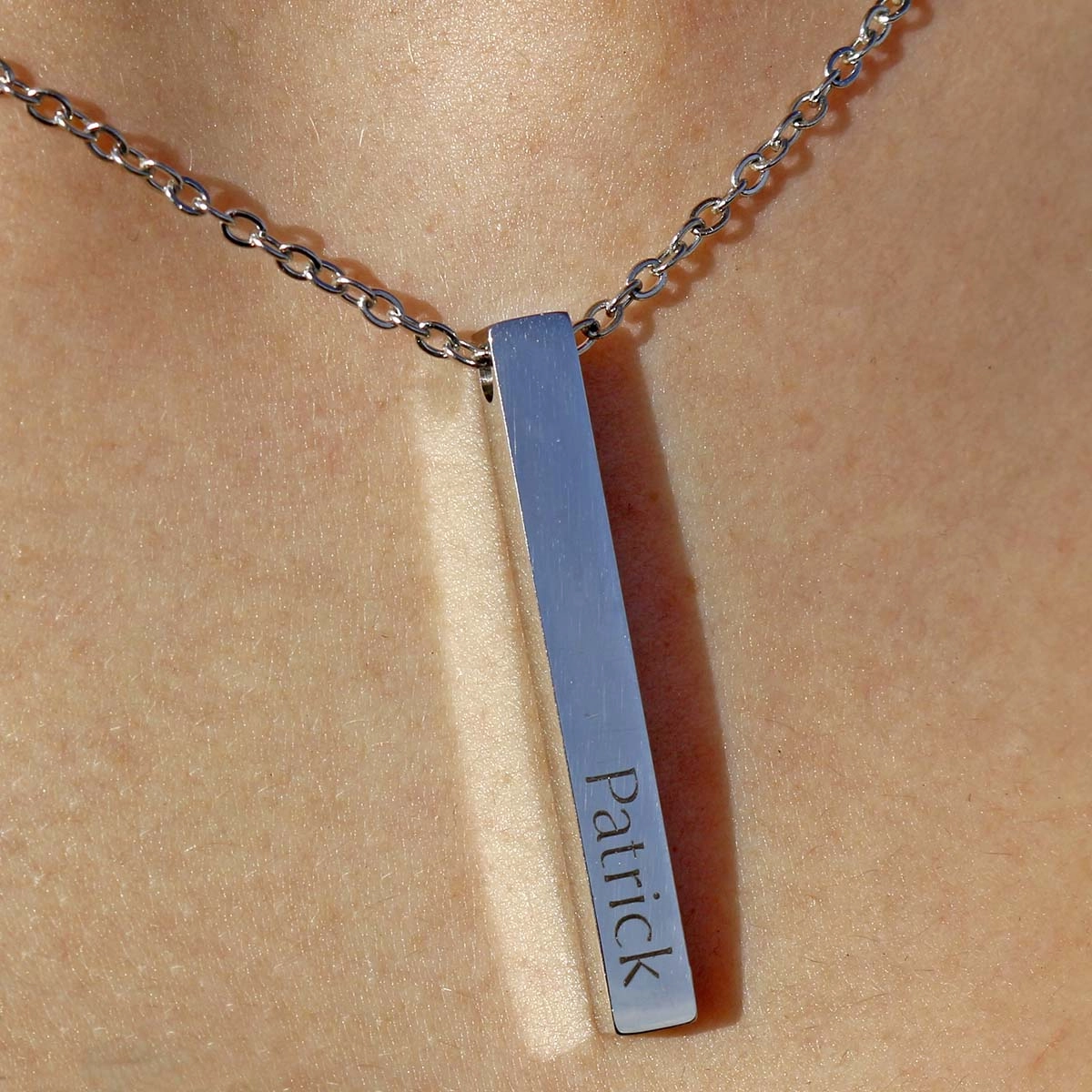 The Personalised Vertical Bar Pendant hanging from a Box chain, makes the perfect accessory for any occasion. See what else our Personalised Bar Necklaces Collection has to offer.
