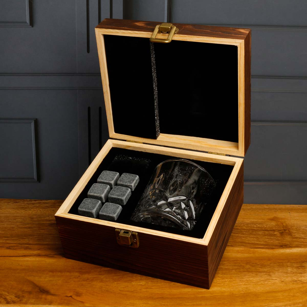 Wooden boxed Whiskey set comprising of 4 stones, Bag and Glass.