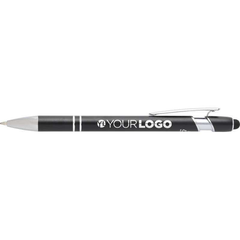 The Kish ballpoint pen features a recycled aluminium barrel with a silver finish and a silicone stylus tip. Using recycled aluminium helps reduce waste and conserve natural resources. Black ink, 800 m writing length, 1.0 mm nib. Length: 14.4 cm | Diameter: 1 cm | Weight: 17.2 g.