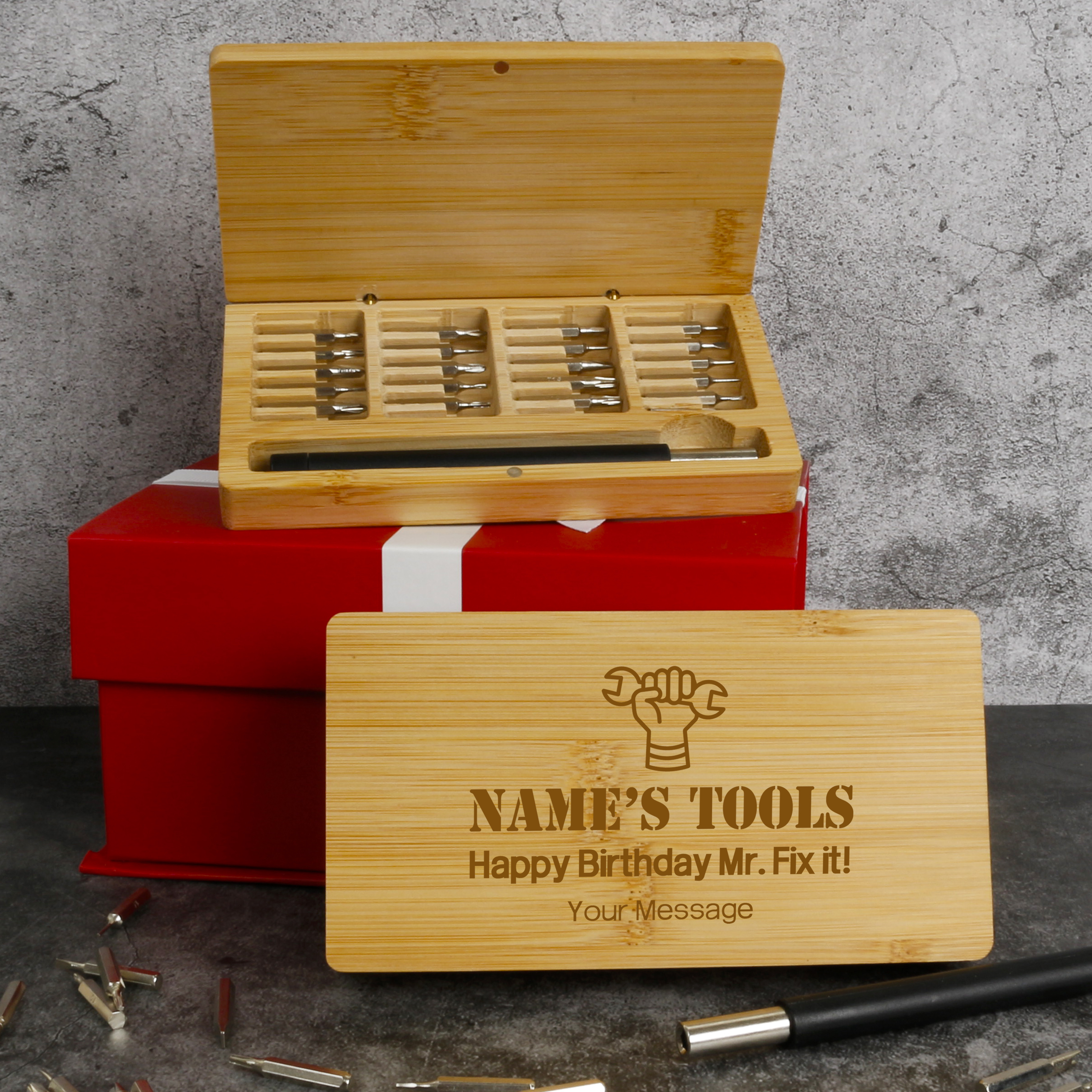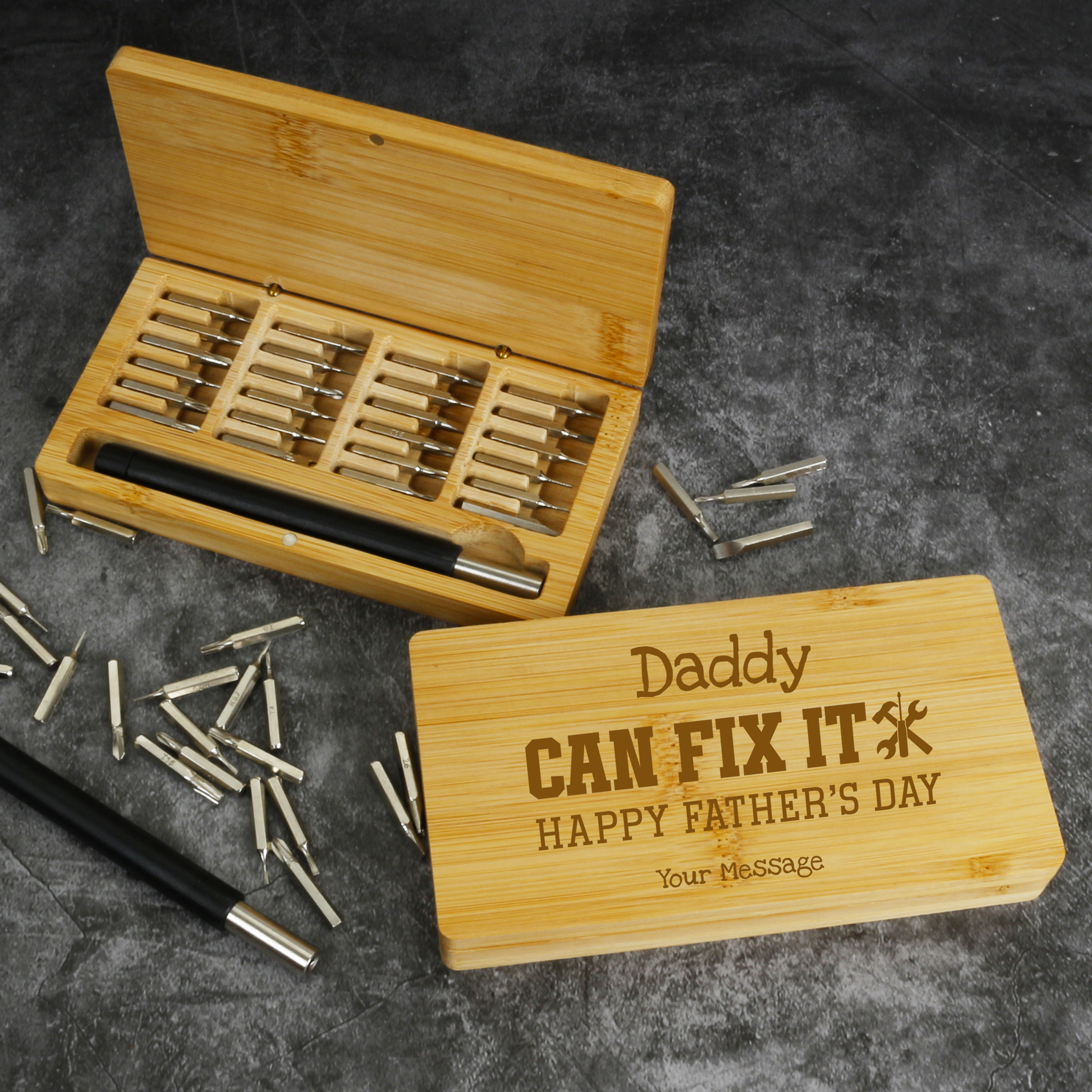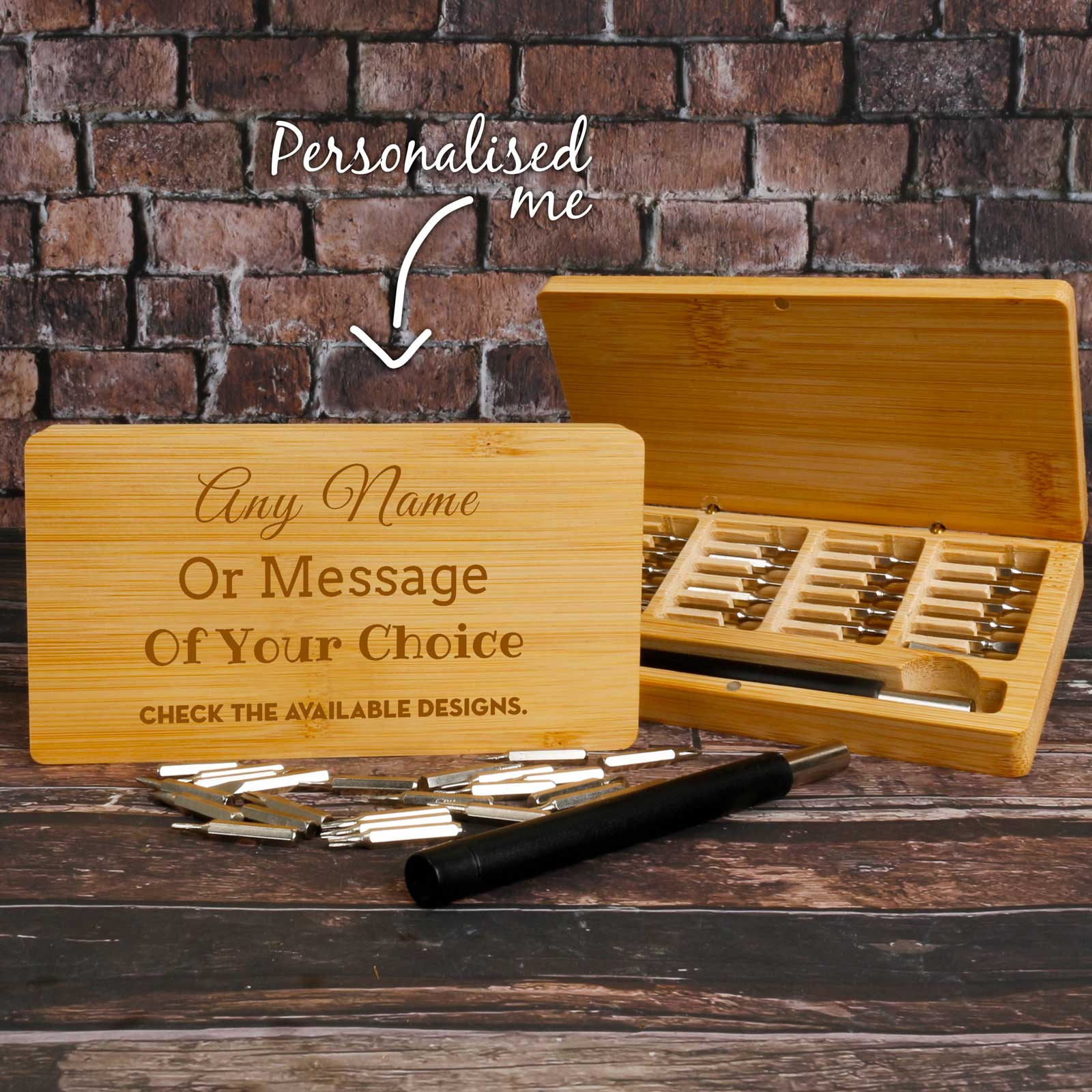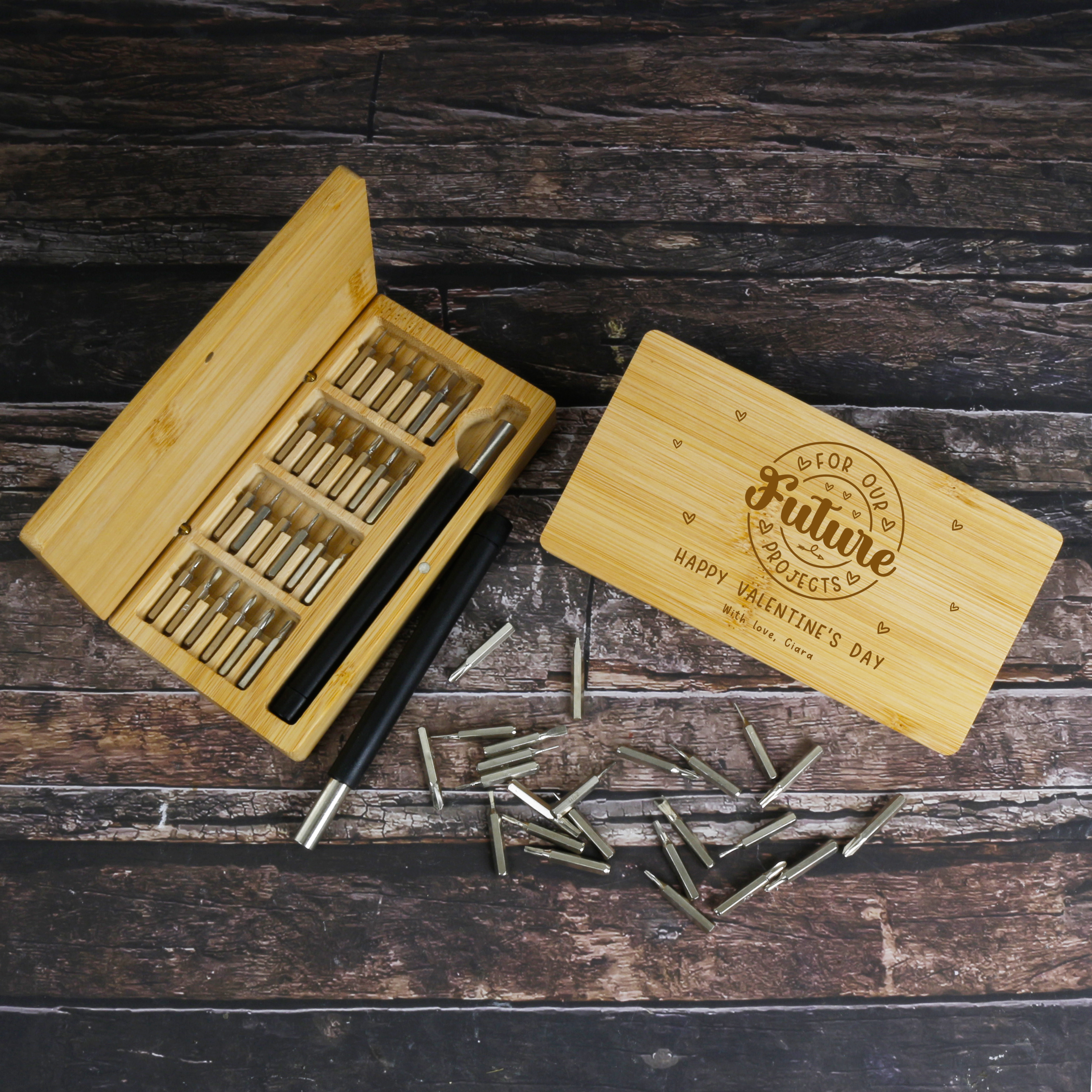 The bamboo box can be personalised, making it a thoughtful gift for DIY enthusiasts, tech lovers, or anyone who appreciates quality craftsmanship.