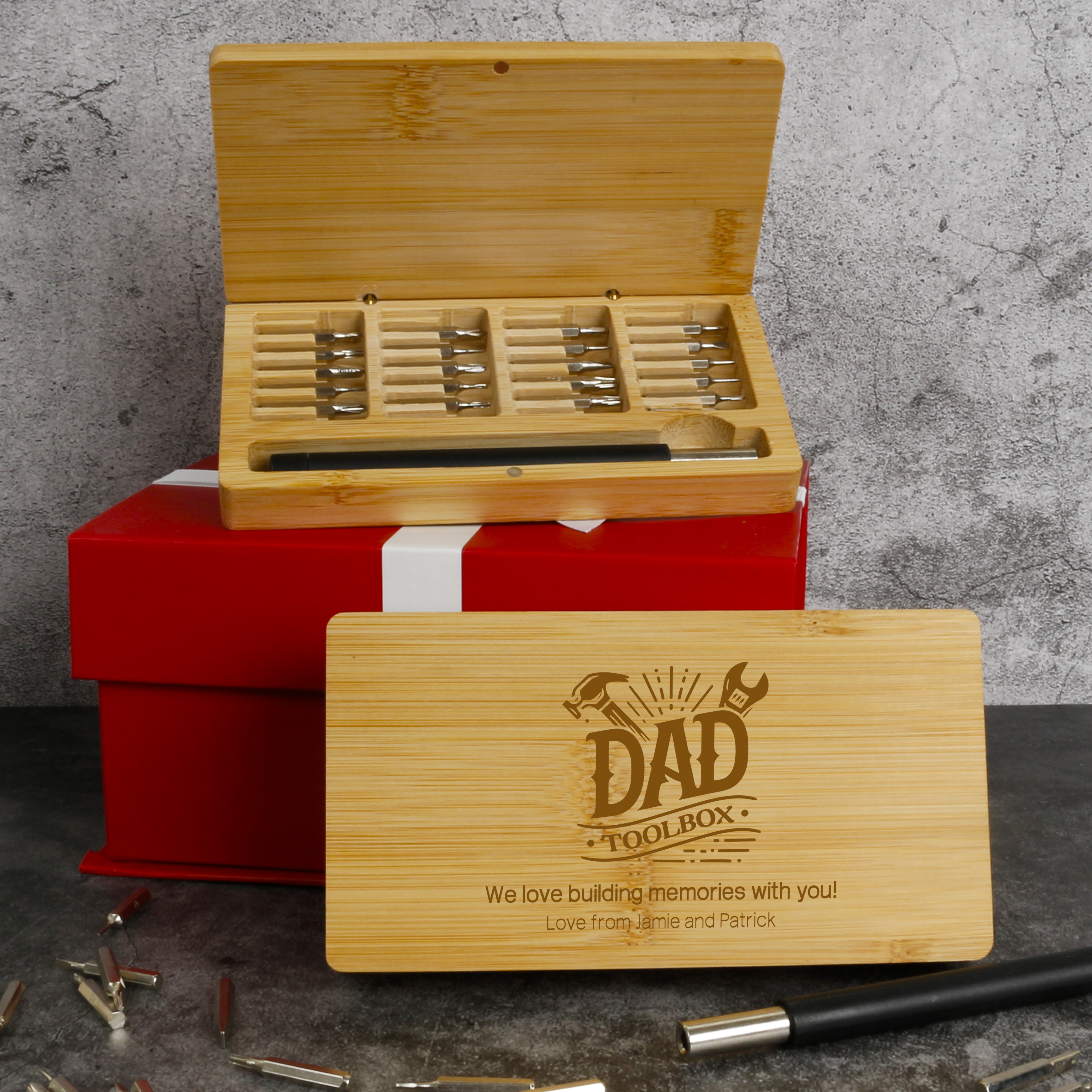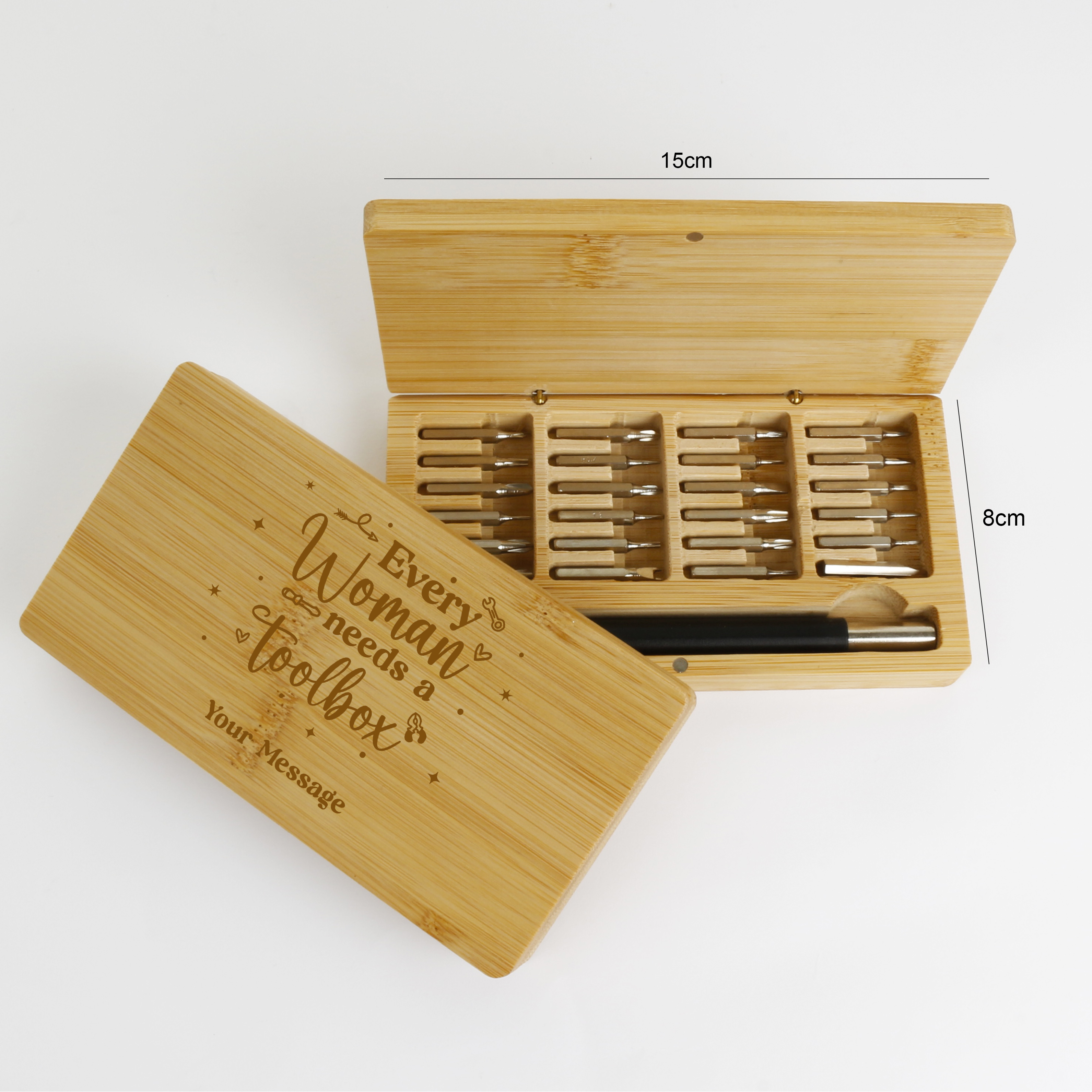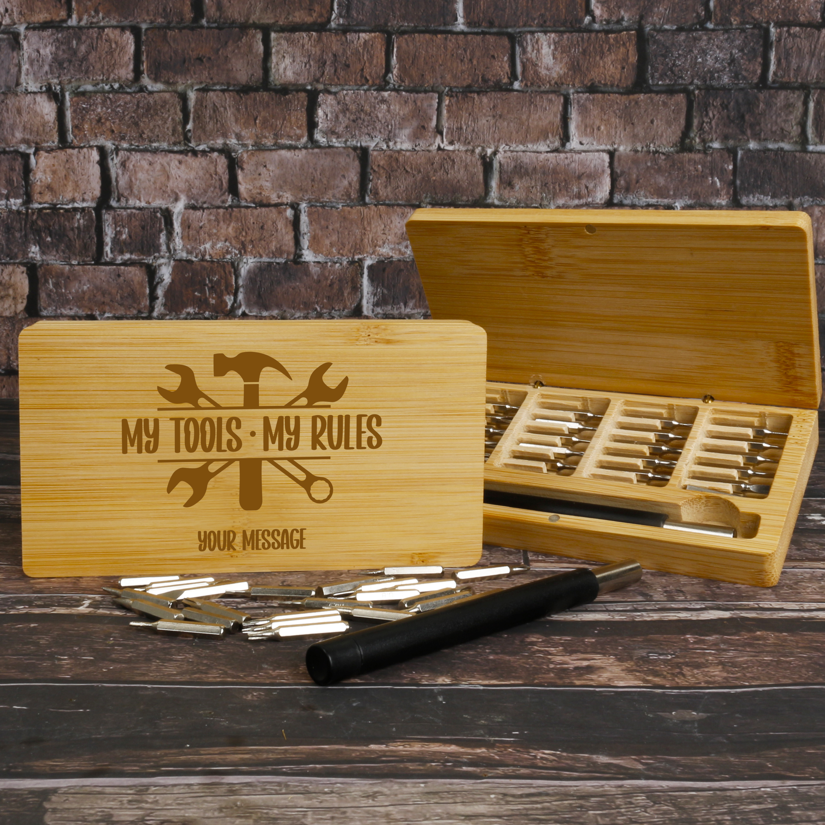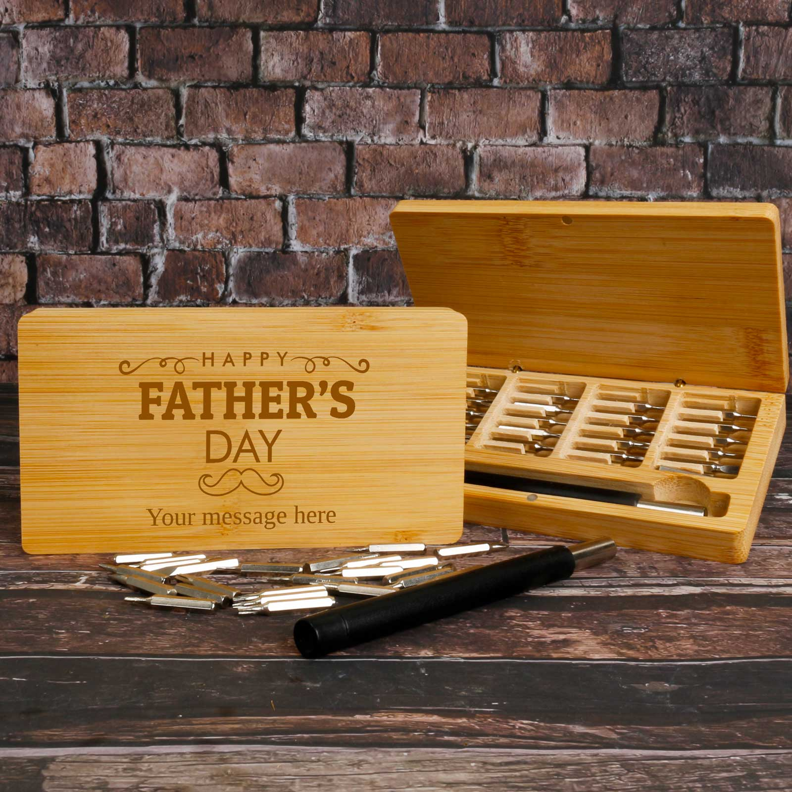 The bamboo box can be personalised, making it a thoughtful gift for DIY enthusiasts, tech lovers, or anyone who appreciates quality craftsmanship.