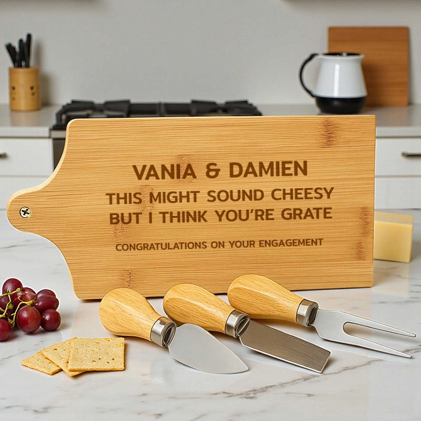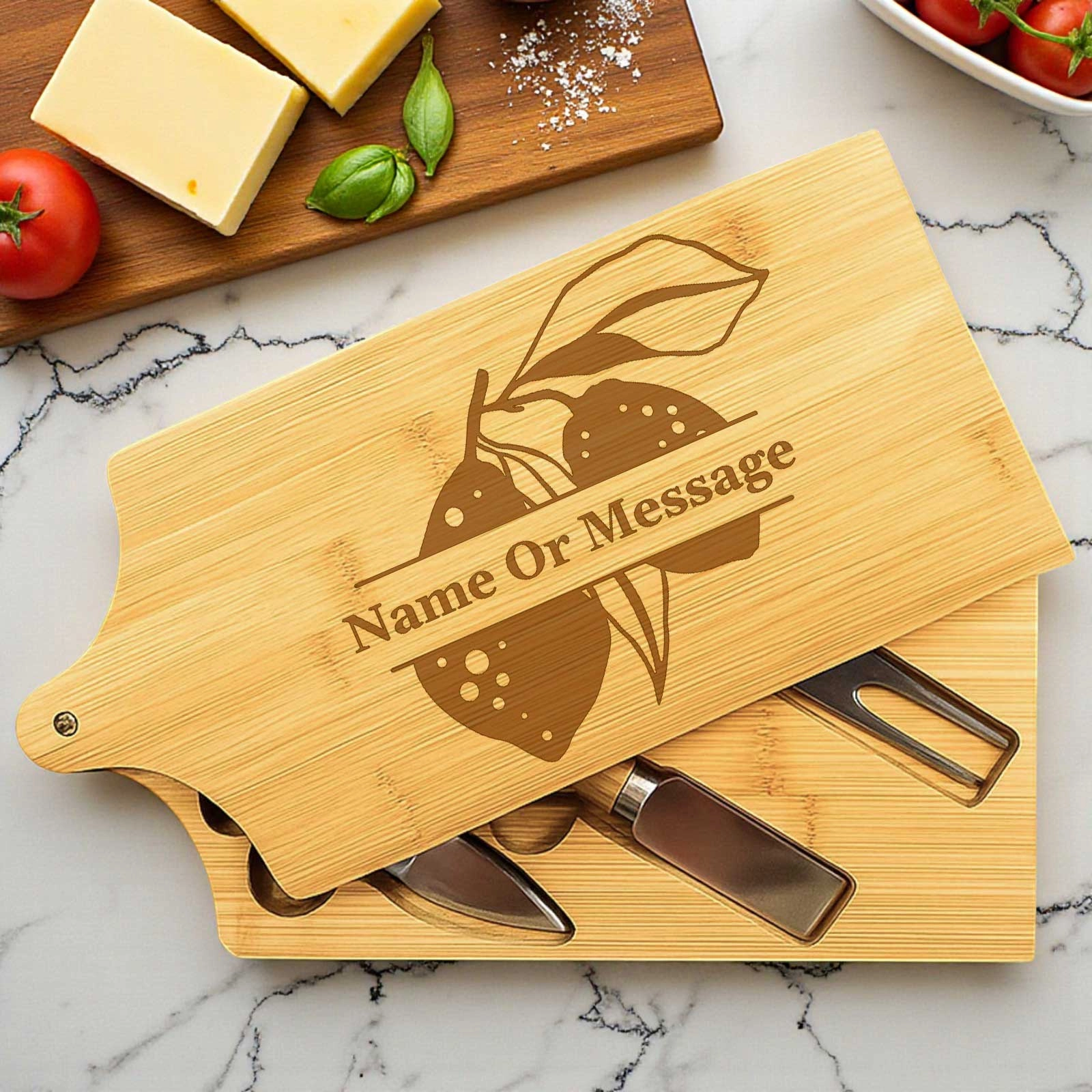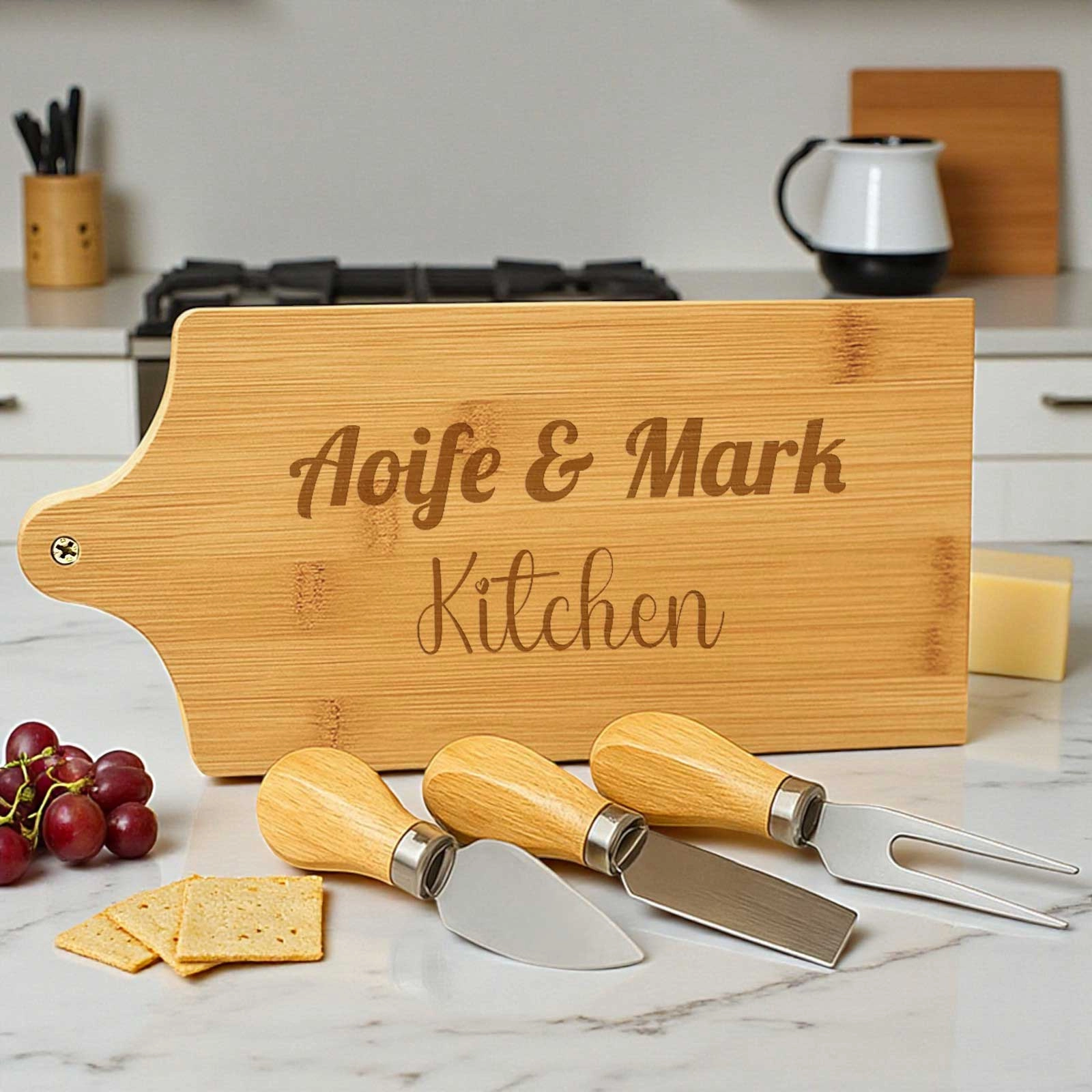 Gift the joy of personalised entertaining and make every cheese platter a celebration with this unique bamboo cheeseboard set. Perfect for foodies, hosts, or anyone who appreciates the finer details in life.