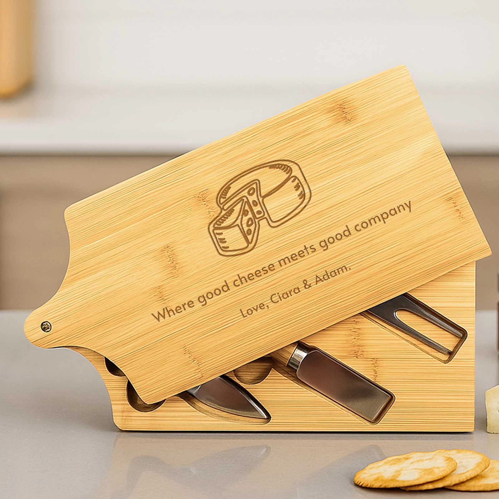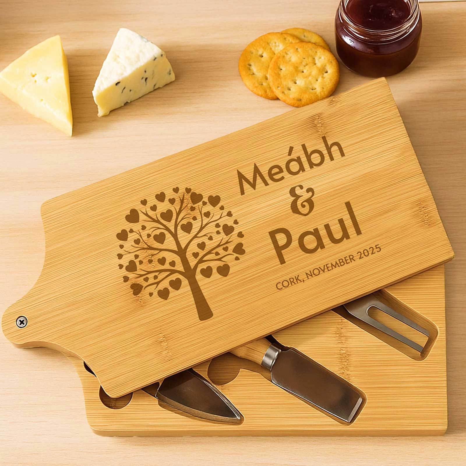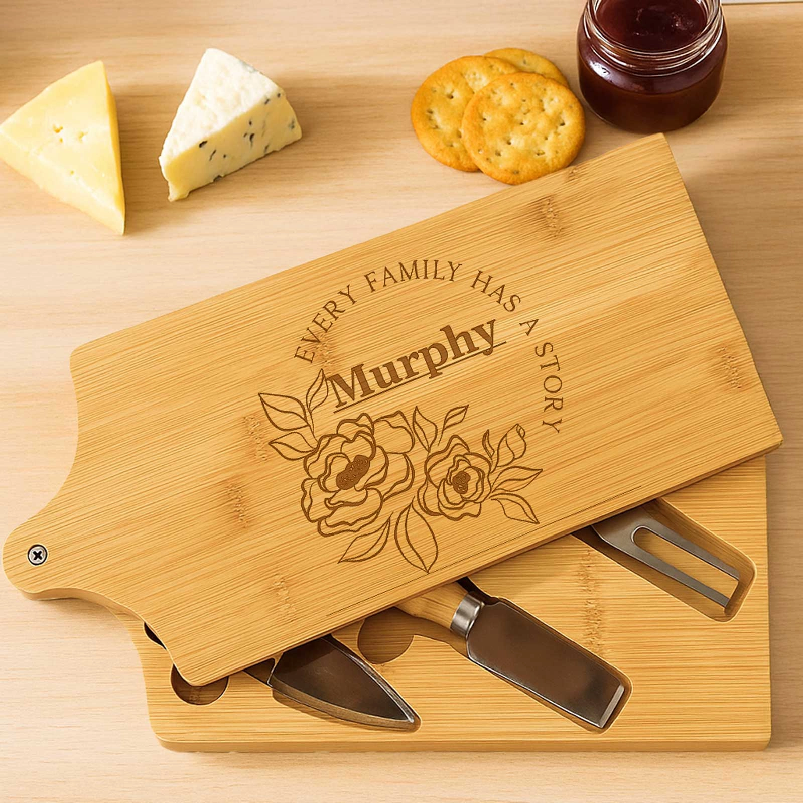 Gift the joy of personalised entertaining and make every cheese platter a celebration with this unique bamboo cheeseboard set. Perfect for foodies, hosts, or anyone who appreciates the finer details in life.