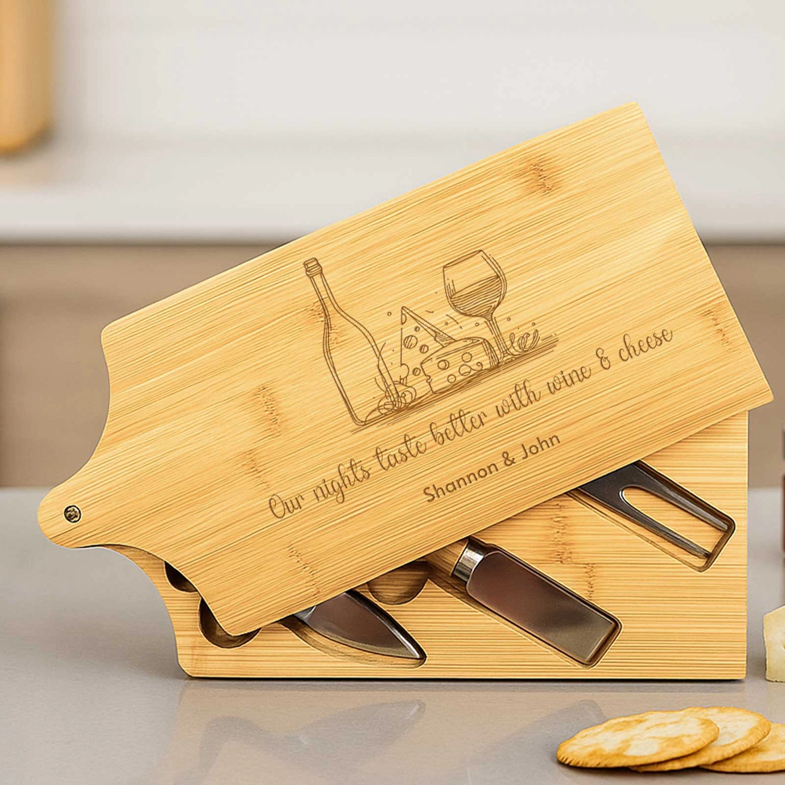 Gift the joy of personalised entertaining and make every cheese platter a celebration with this unique bamboo cheeseboard set. Perfect for foodies, hosts, or anyone who appreciates the finer details in life.