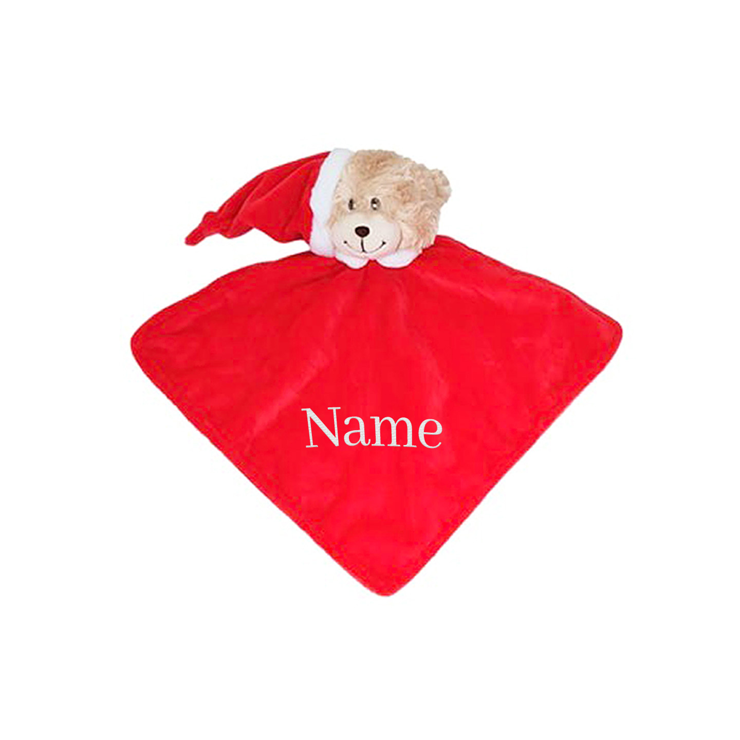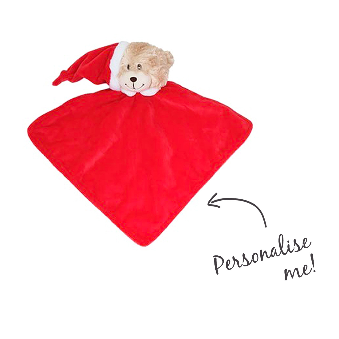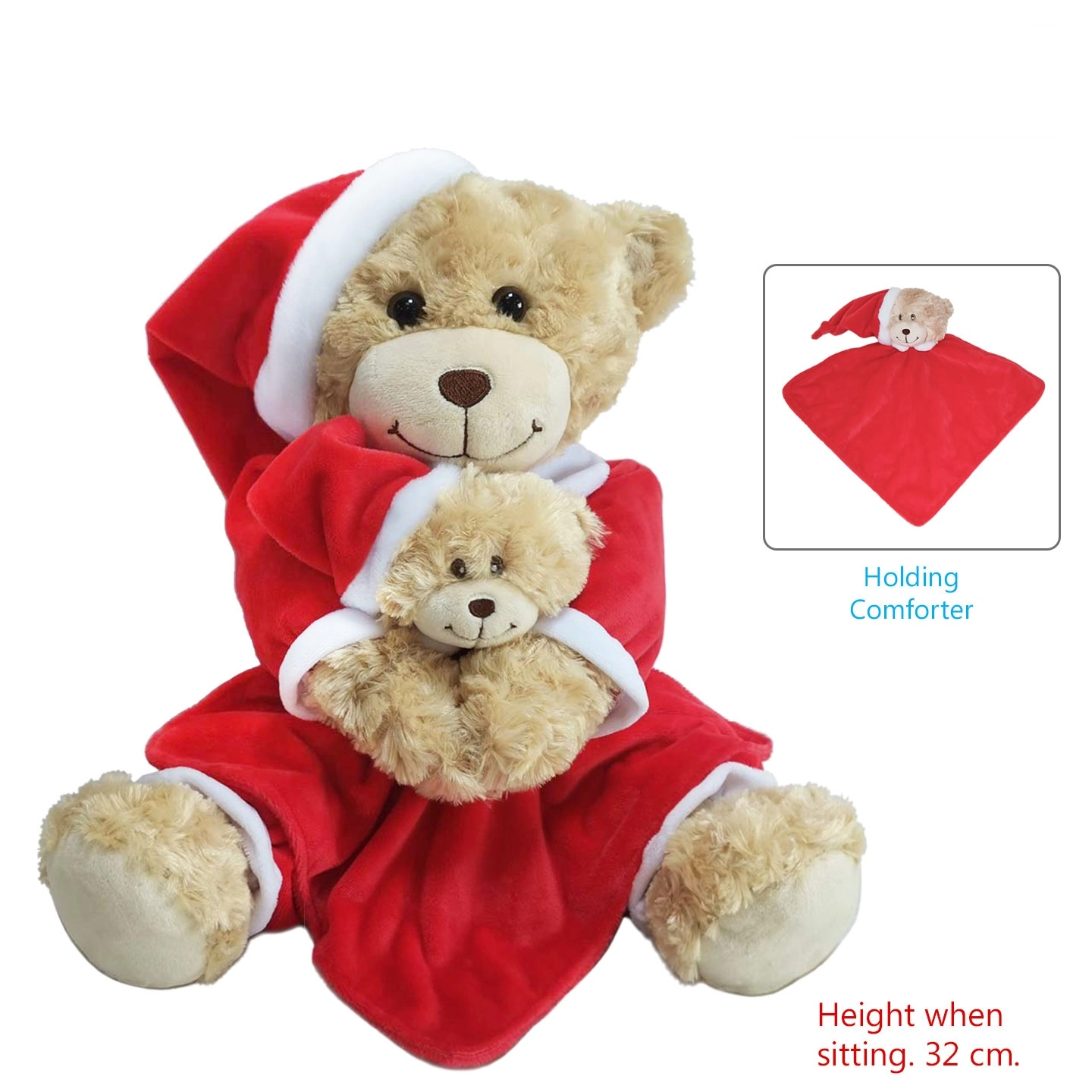 Bedtime Bear, holding a twin layer soft velour comforter.
