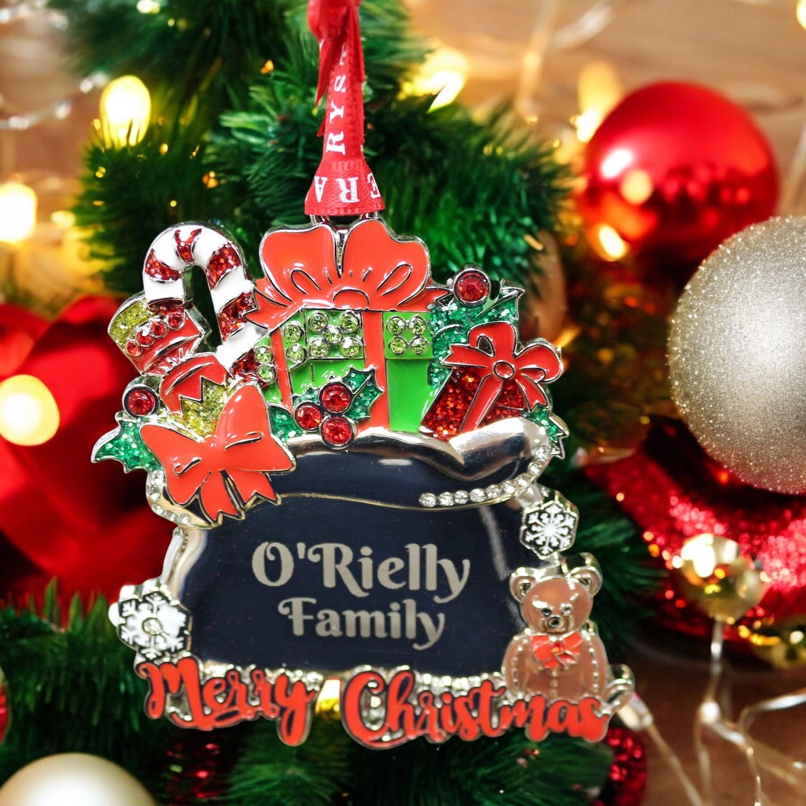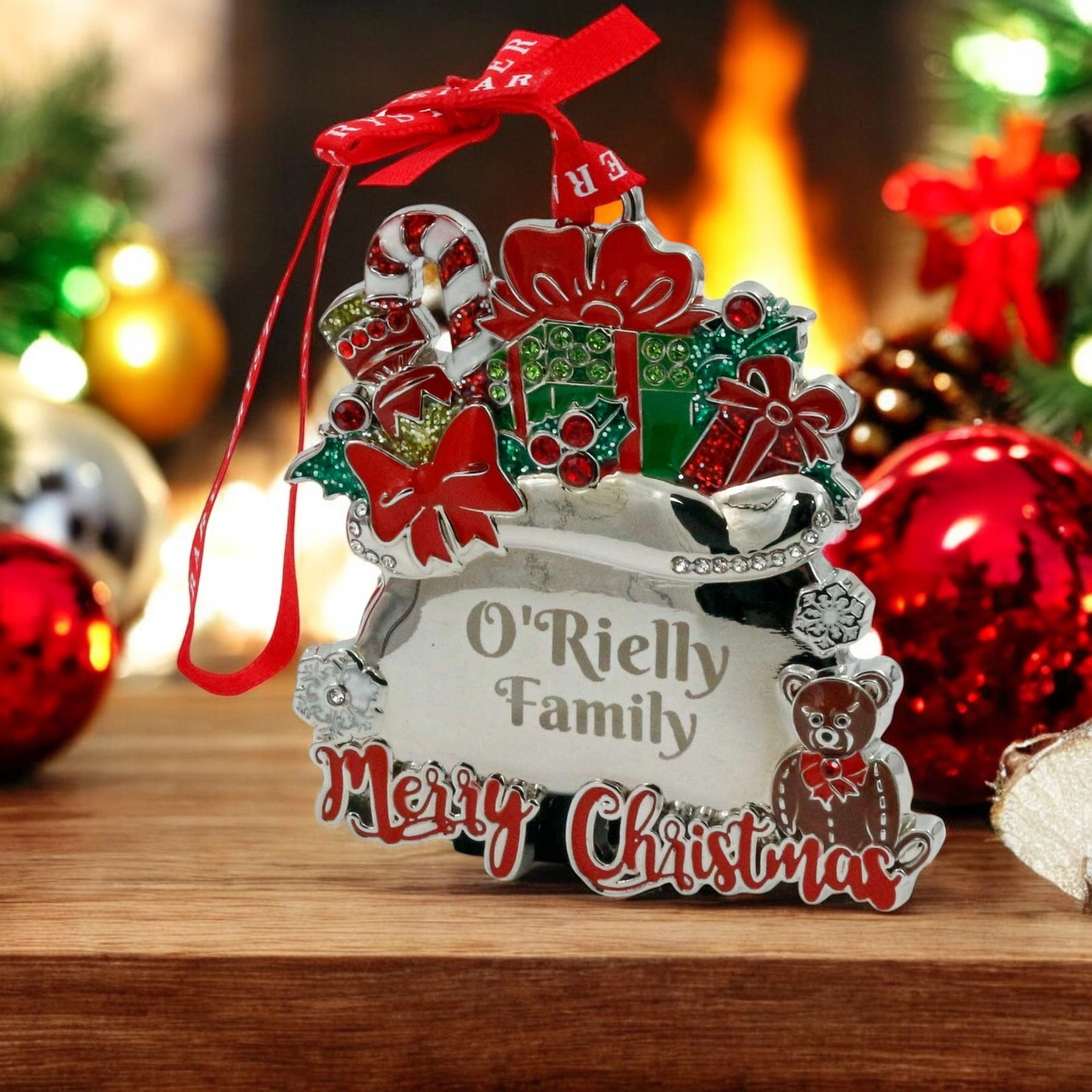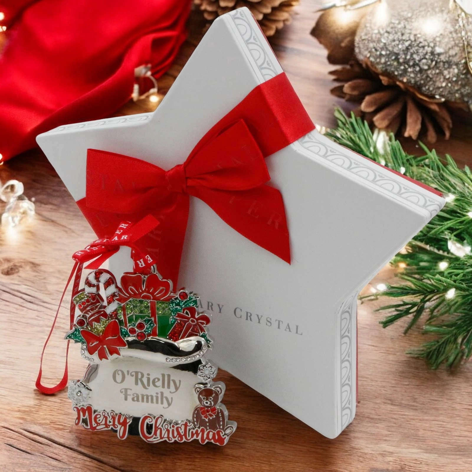 Celebrate the magic of Christmas with this exquisite Tipperary Crystal personalised Santa Sack decoration. Expertly crafted with sparkling coloured accents and delightful detailing, it features a festive Santa sack bursting with gifts, candy canes, bows, holly, and a charming teddy bear. The perfect personalised touch adds your family name, giving your Christmas tree a unique and heartwarming sparkle.