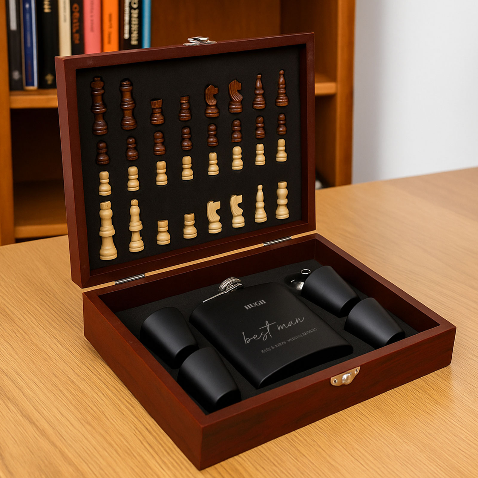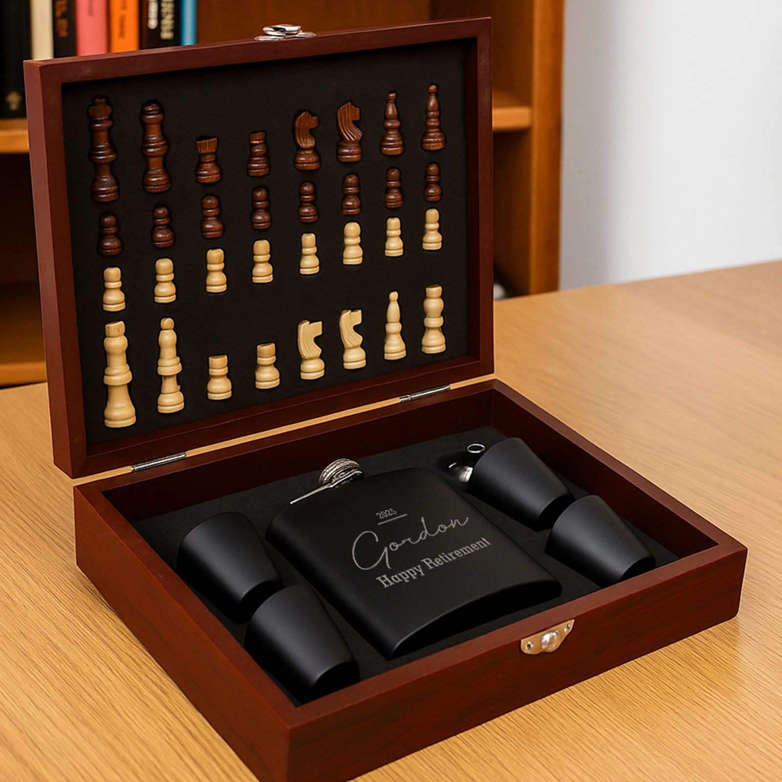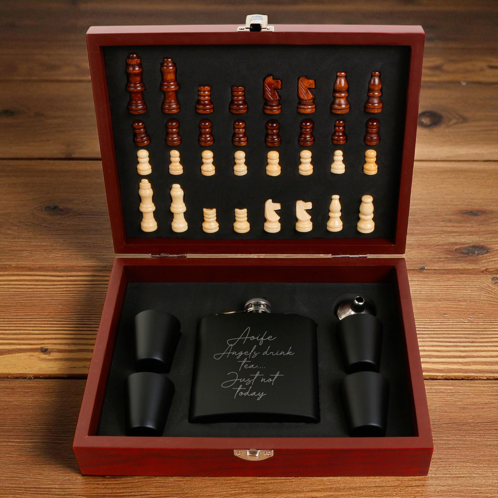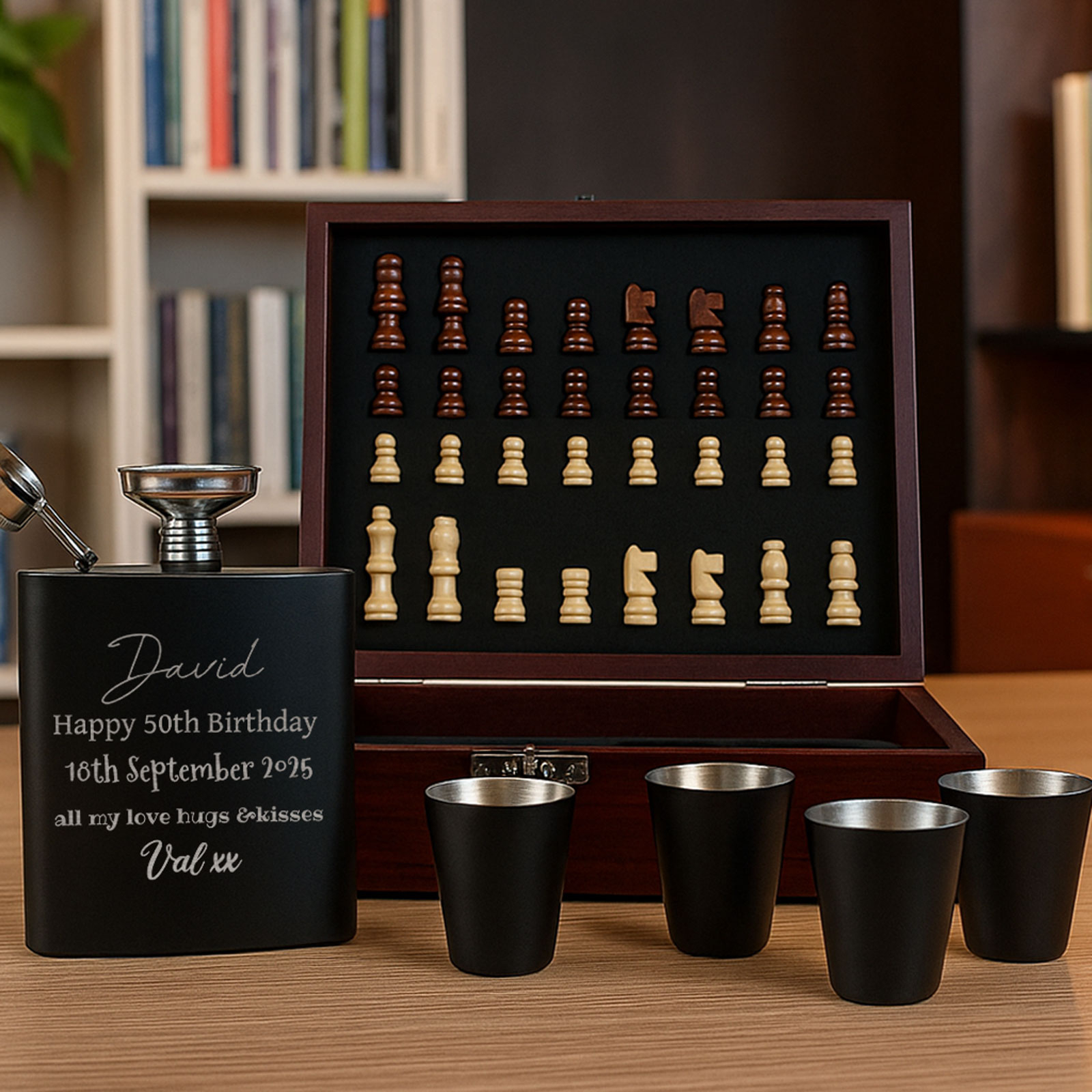 The 6oz hip flask can be engraved with any name, message, or special date, making it a thoughtful and personalised gift. Paired with four matching cups, a pouring funnel, and a full chess set, it’s a unique gift idea that stands out from the rest.