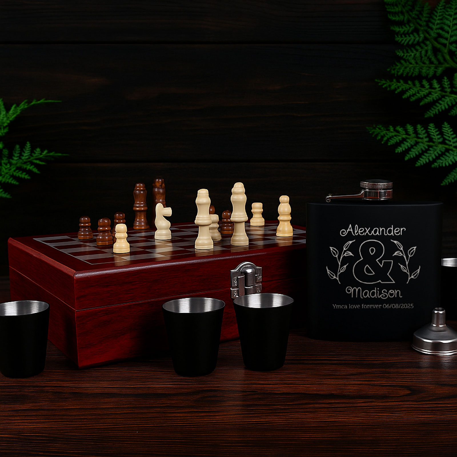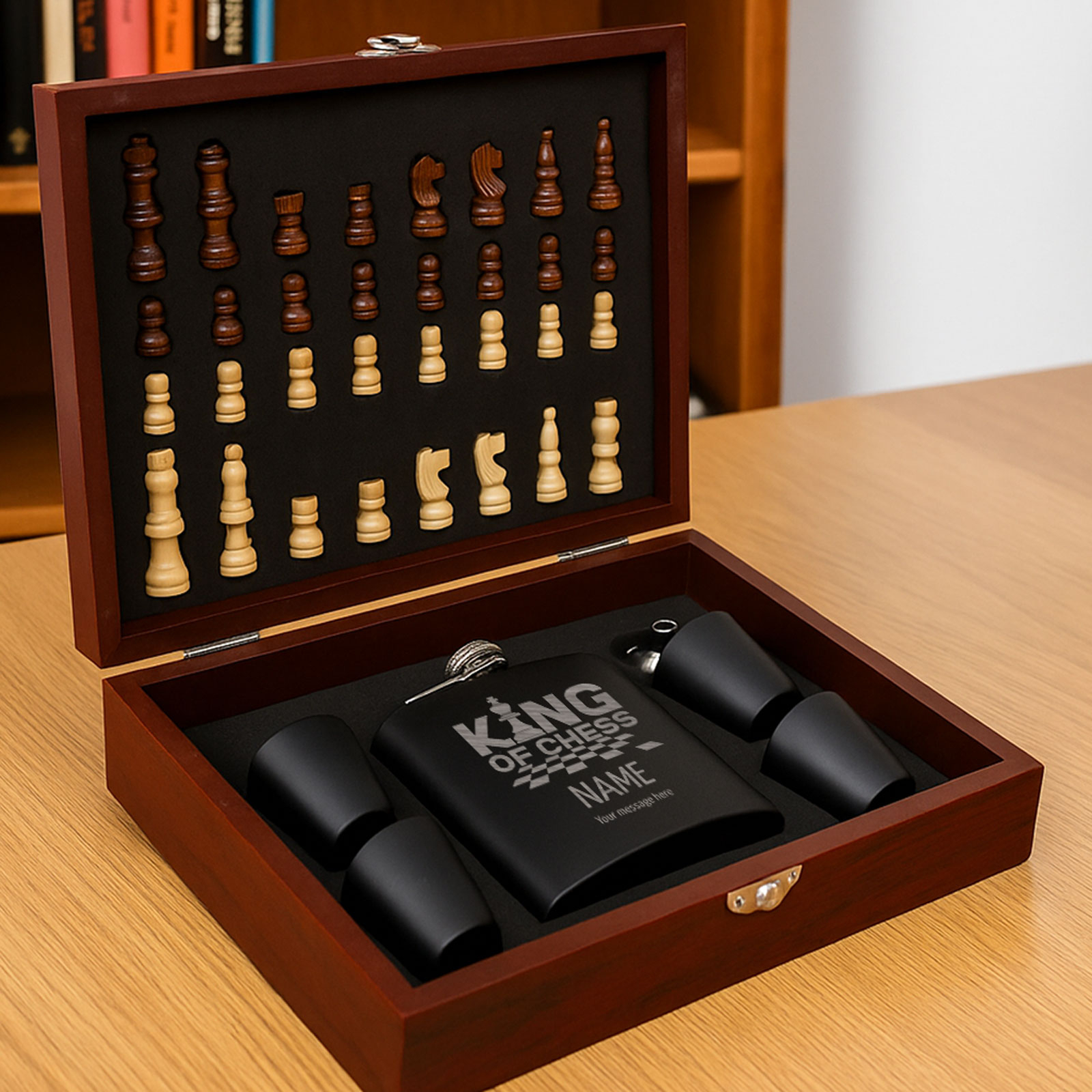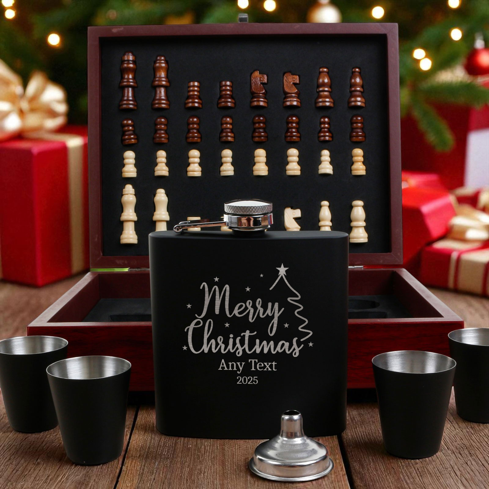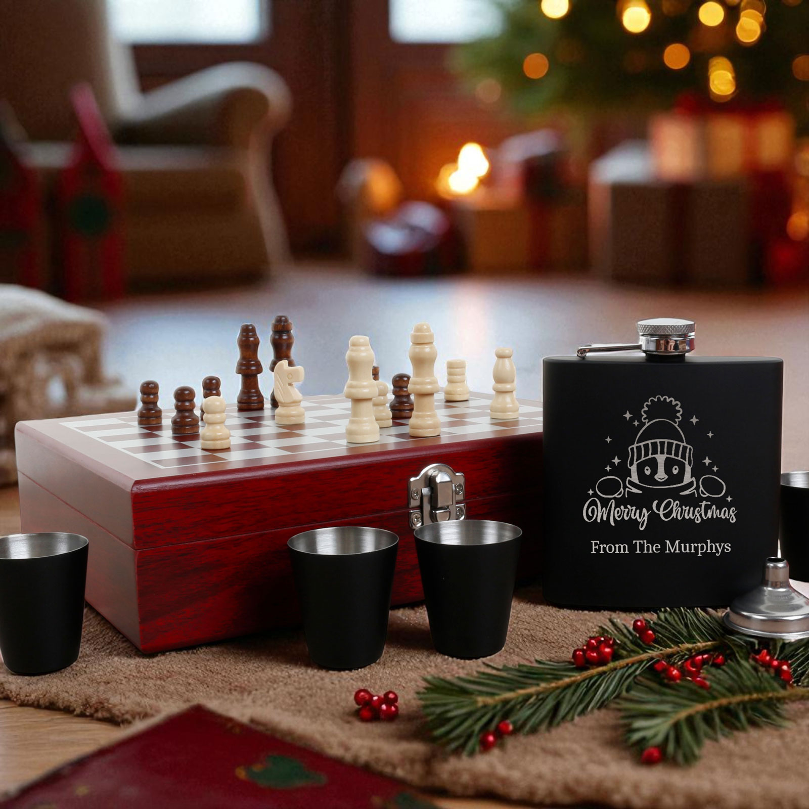 The 6oz hip flask can be engraved with any name, message, or special date, making it a thoughtful and personalised gift. Paired with four matching cups, a pouring funnel, and a full chess set, it’s a unique gift idea that stands out from the rest.