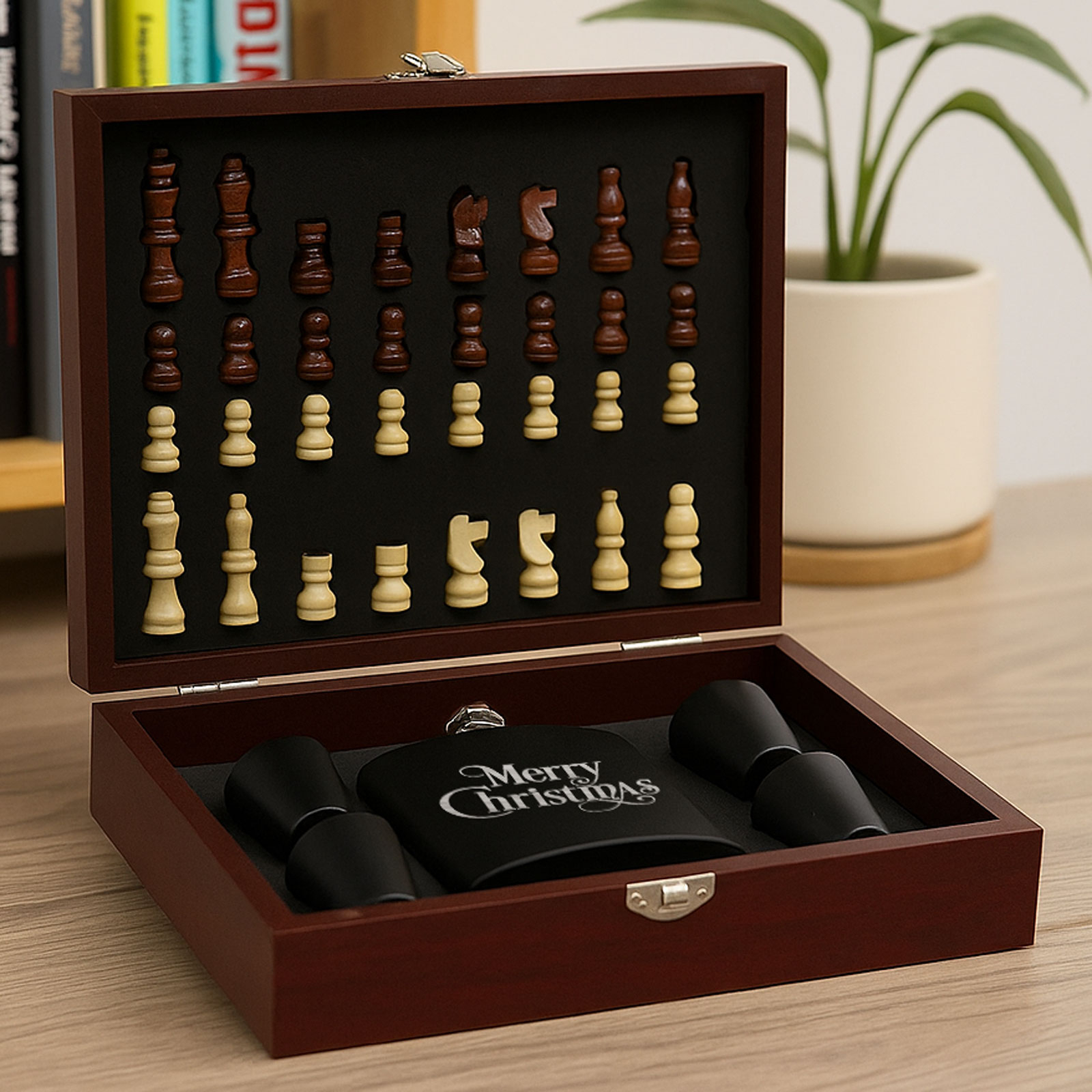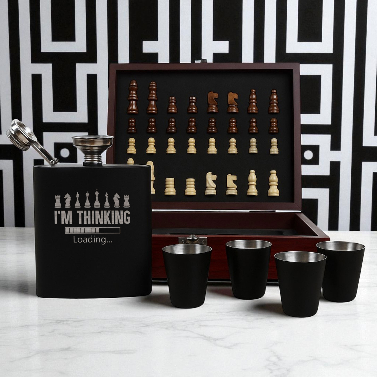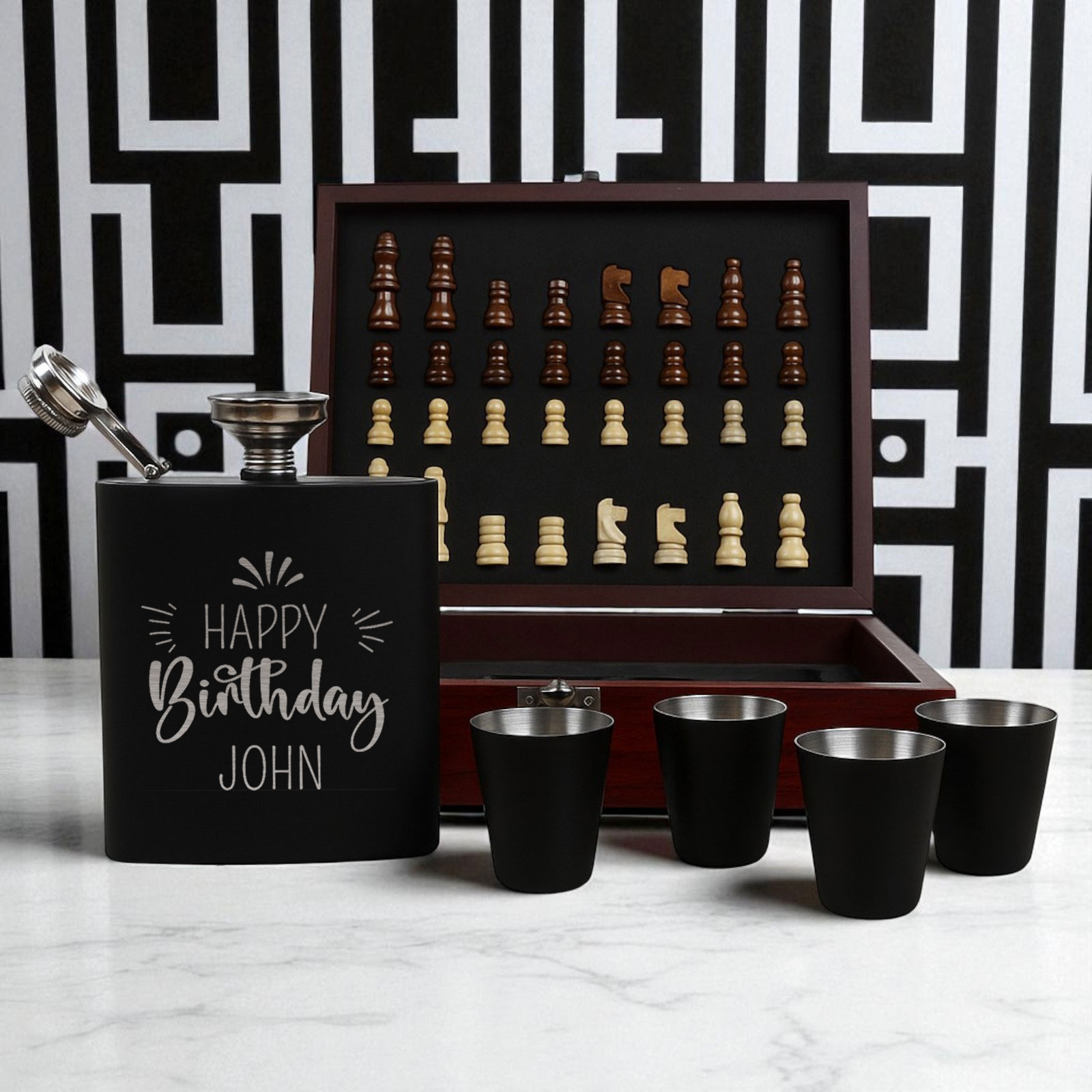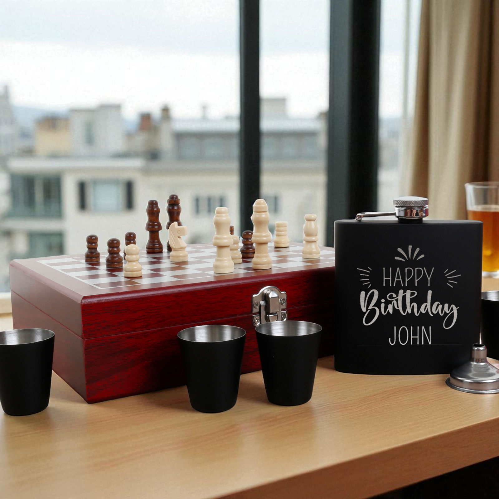 The 6oz hip flask can be engraved with any name, message, or special date, making it a thoughtful and personalised gift. Paired with four matching cups, a pouring funnel, and a full chess set, it’s a unique gift idea that stands out from the rest.
