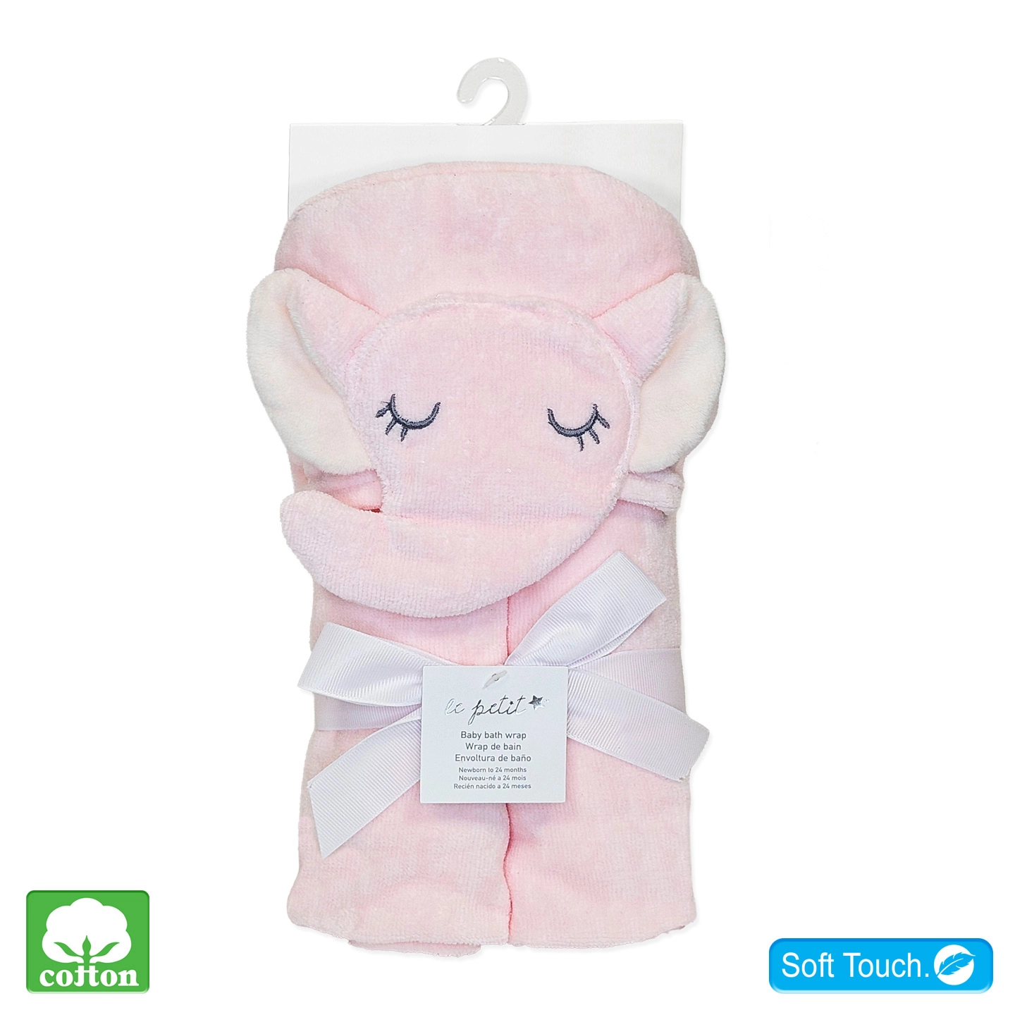 An adorable pink elephant baby wrap, 3D Dino detail on the hood, embroidered eyes.