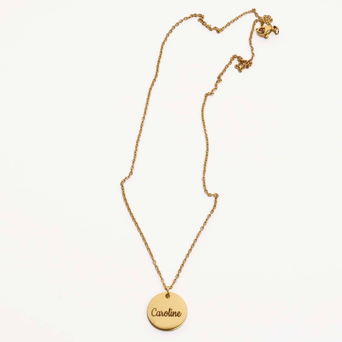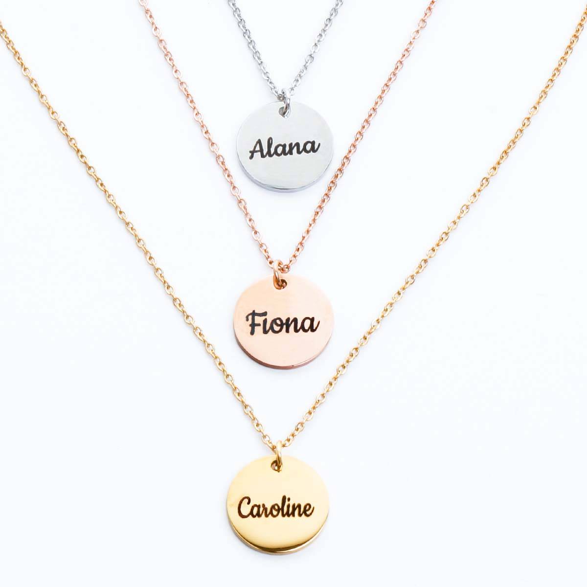 The Personalised Round Pendant hanging from a Box chain, makes the perfect accessory for any occasion.