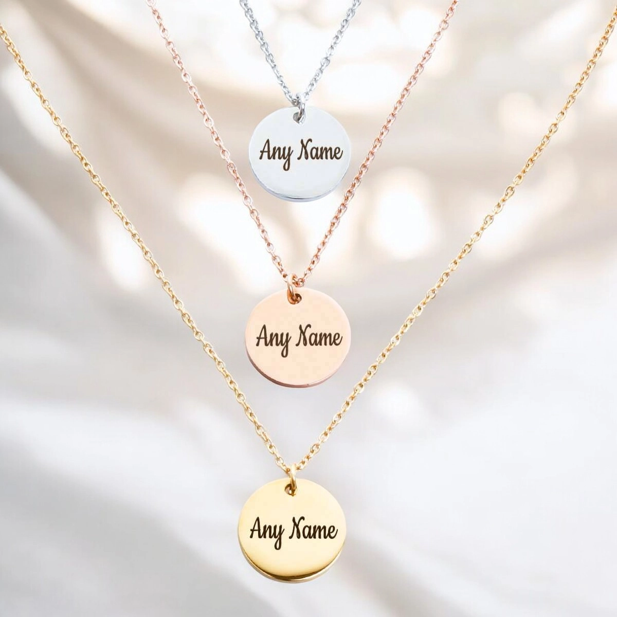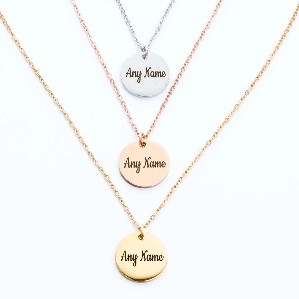 The Personalised Round Pendant hanging from a Box chain, makes the perfect accessory for any occasion.
