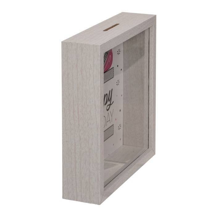 - Interactive shadow box design with a clear glass front lets you watch your savings grow and provides a visual goal that keeps motivation high.