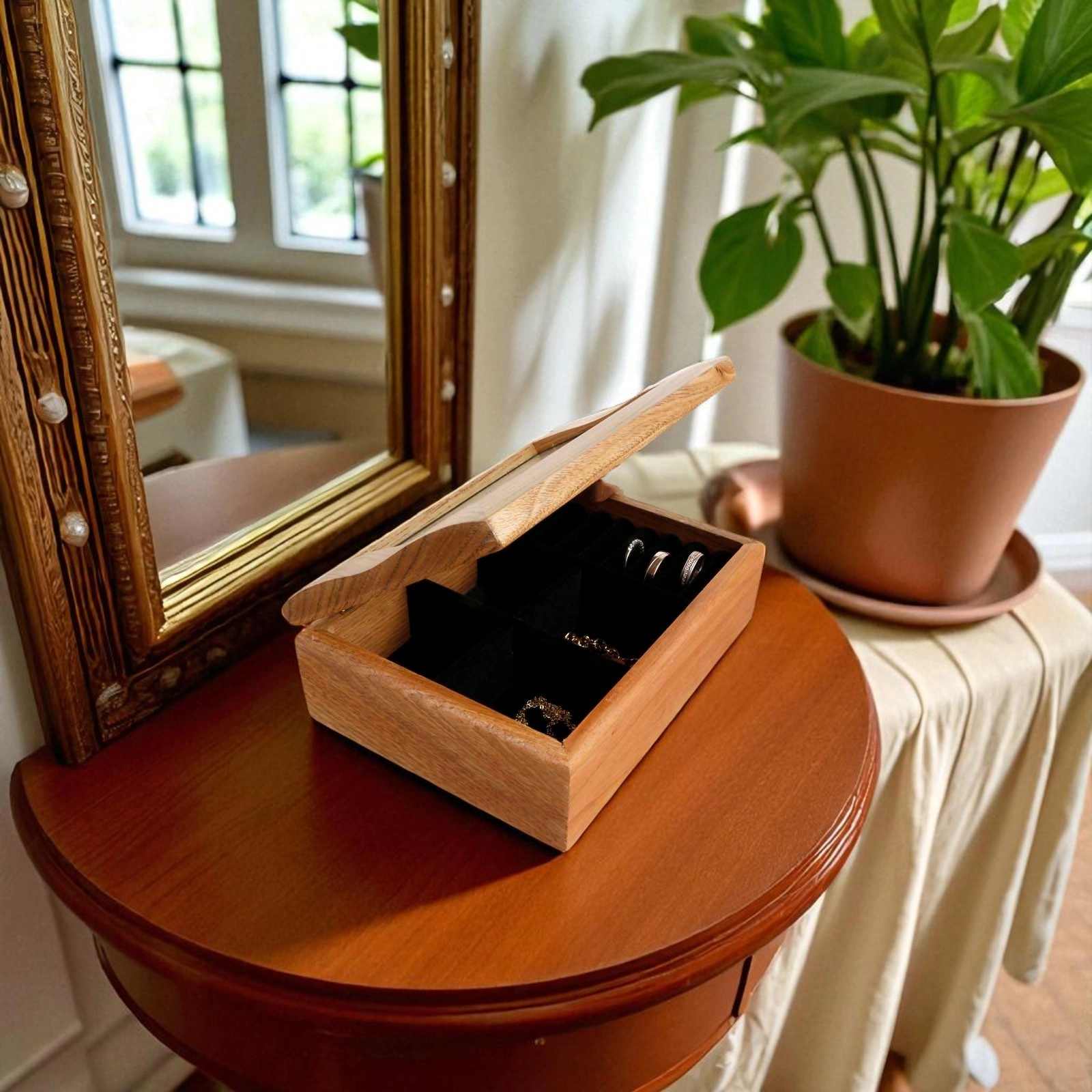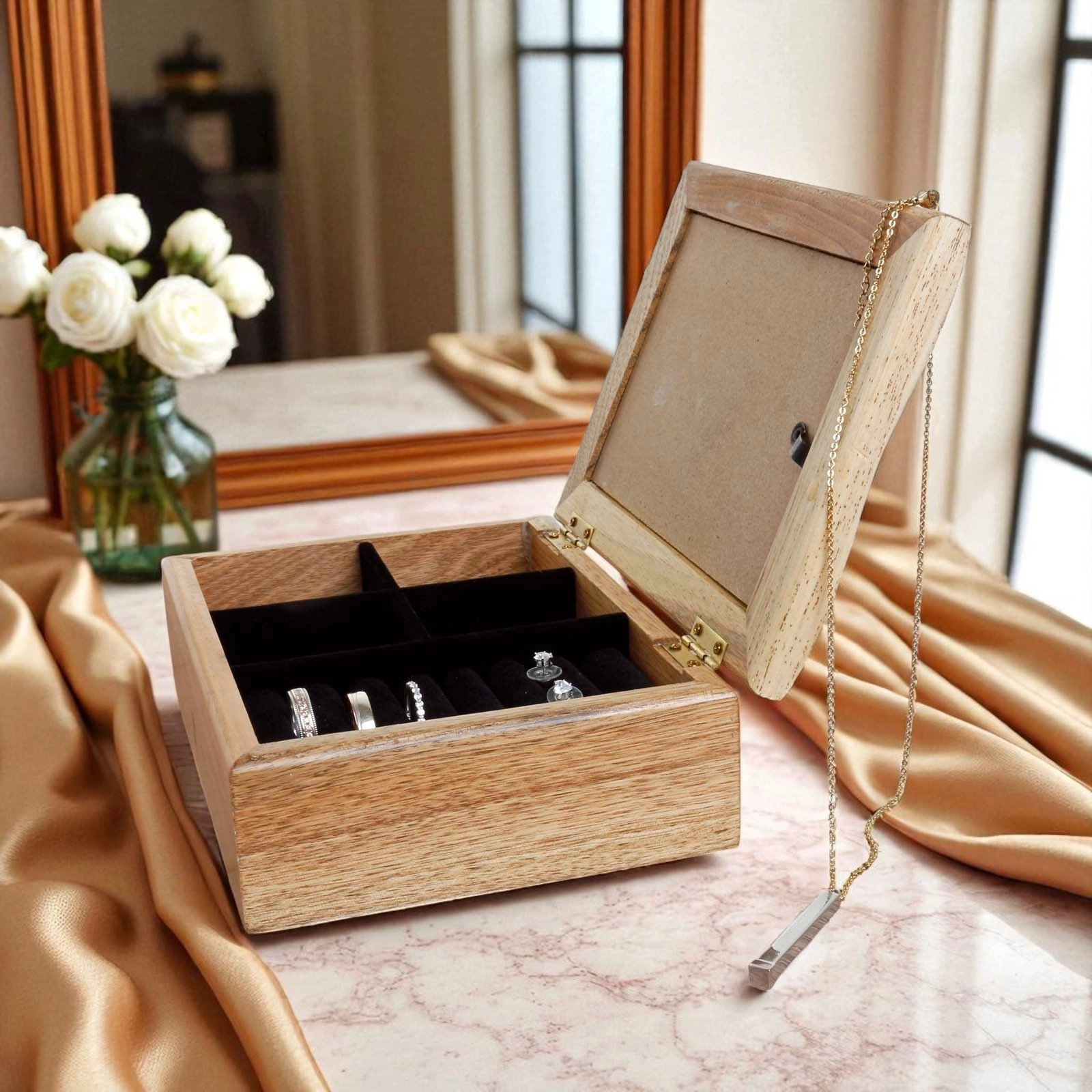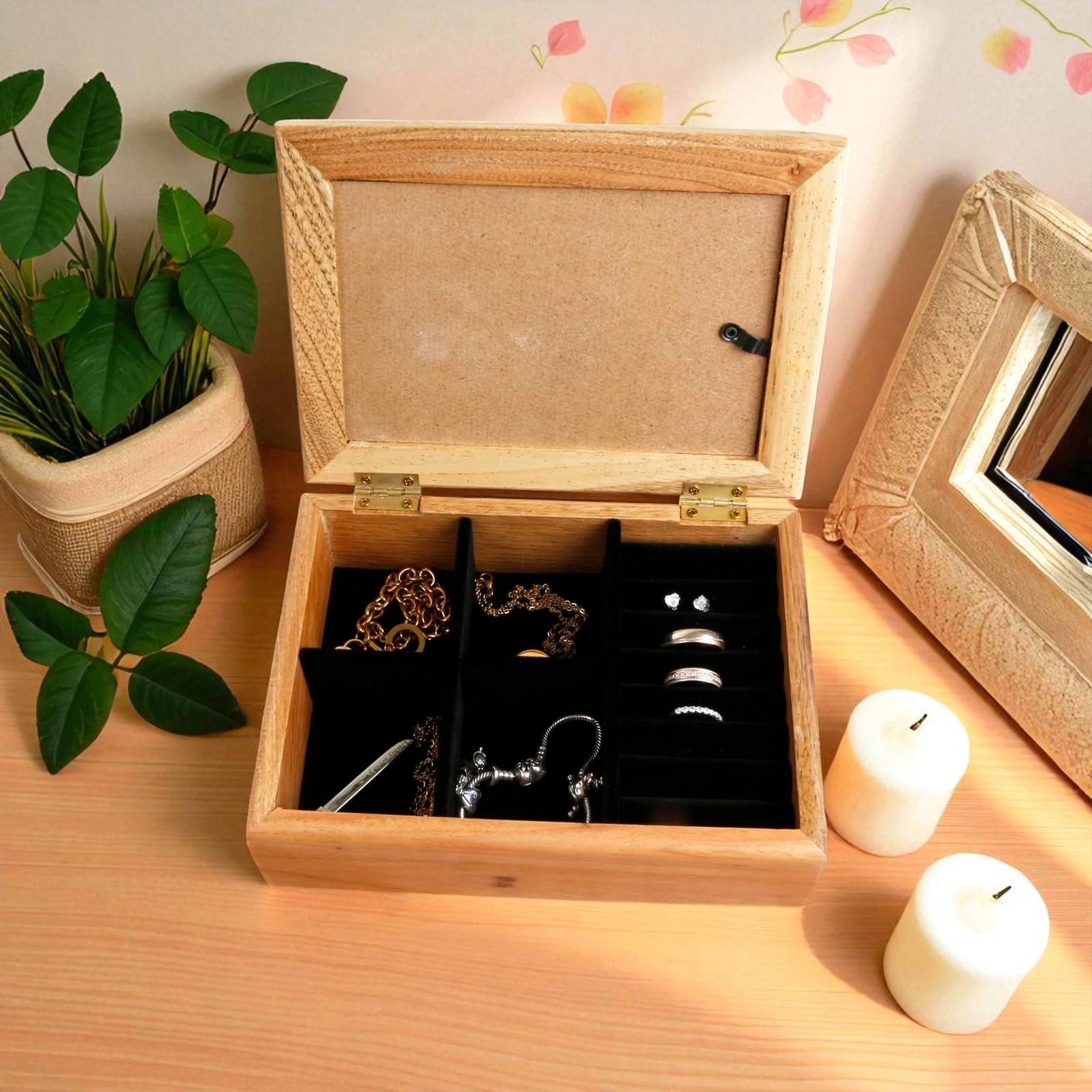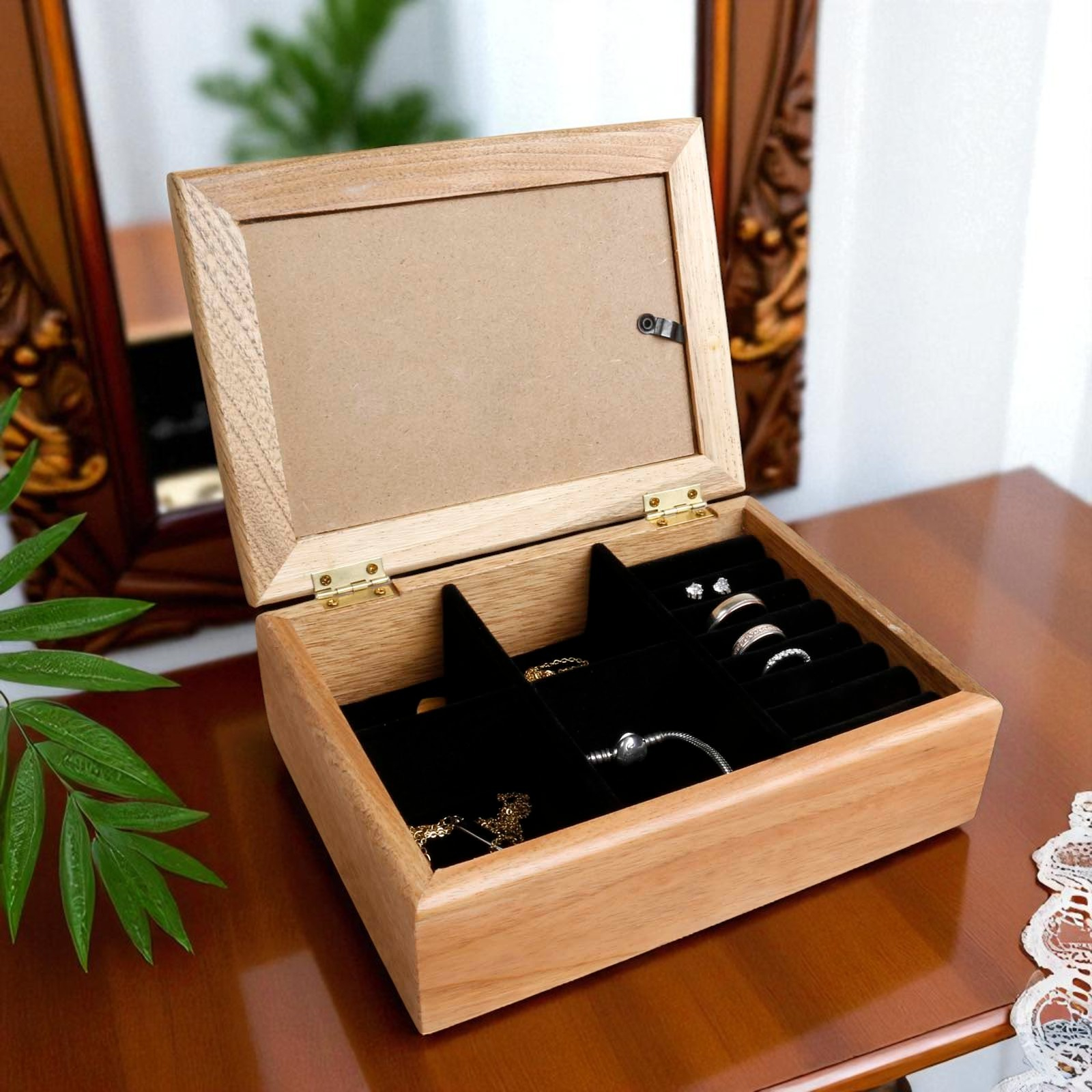 Inside, you’ll find a soft black velvet-style compartment divider to neatly hold rings, earrings, bracelets, or necklaces, keeping everything organised and tangle-free.
