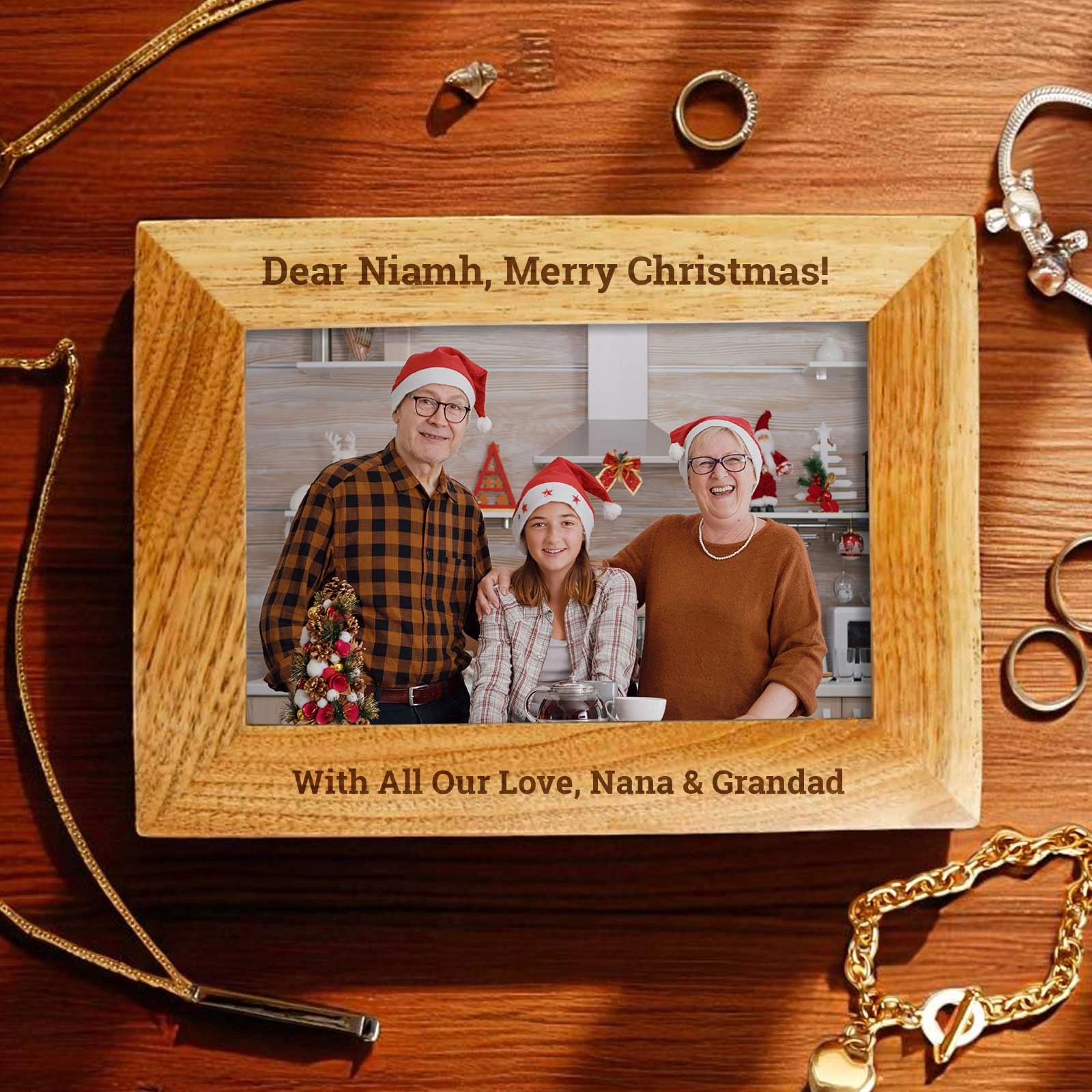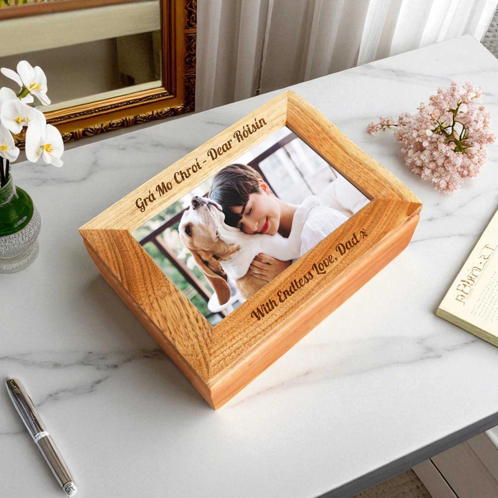 A stunning blend of sentiment and style, this Personalised Wooden Jewellery Box is more than just a place to store precious pieces — it’s a memory keeper. Crafted from beautiful natural wood, it features a 6x4” photo slot on the lid and space for your custom engraved message above and below the frame.