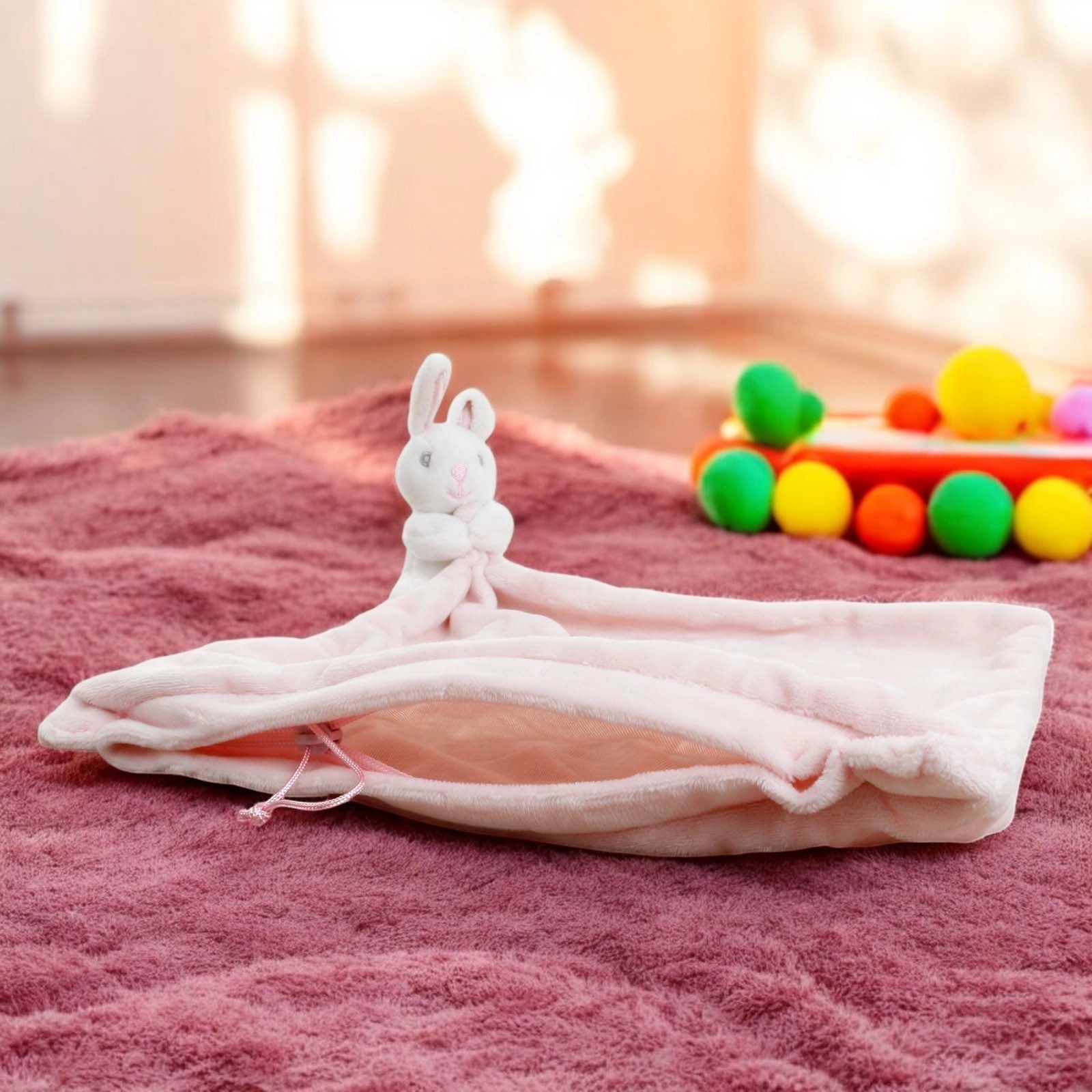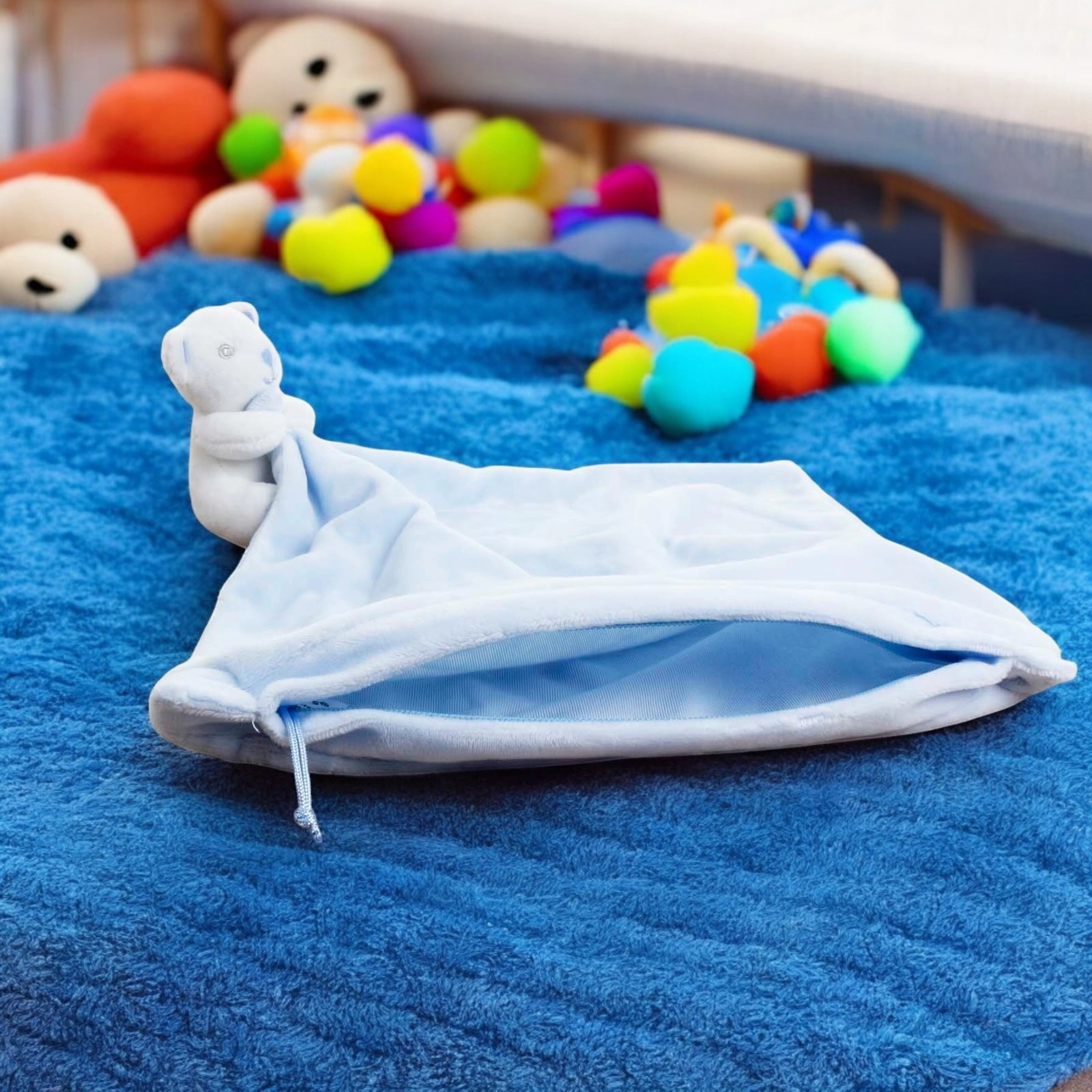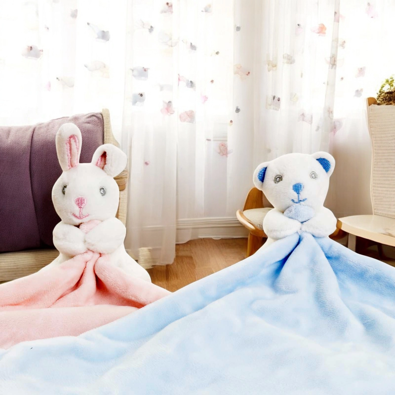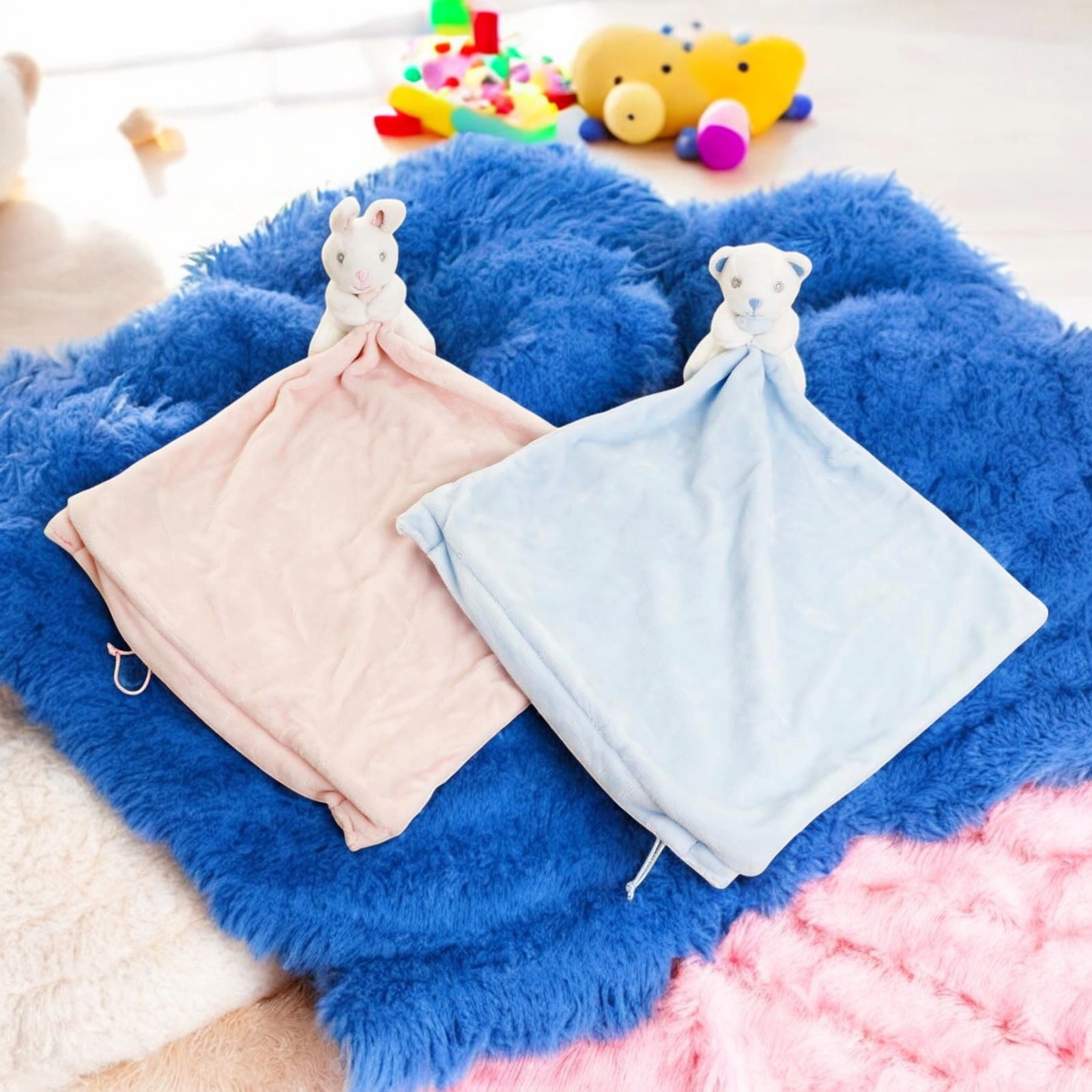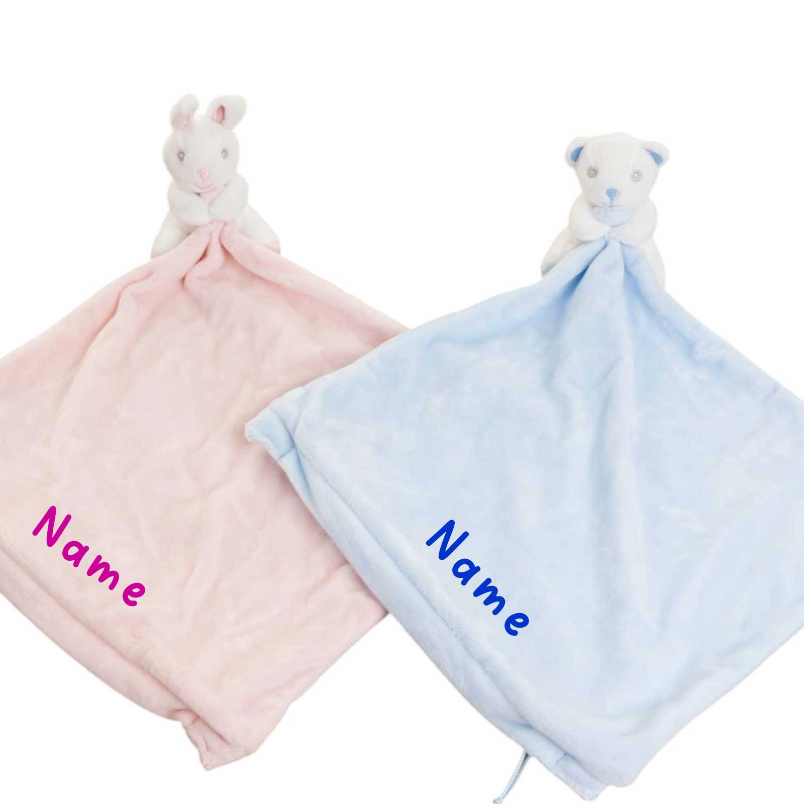 This ultra-soft baby comforter features a cuddly bunny (pink) or teddy (blue) with a gentle rattle for extra comfort. Personalised with a name (up to 15 characters) in matching pink or blue thread, it’s the perfect keepsake for newborns, baby showers, or christenings.