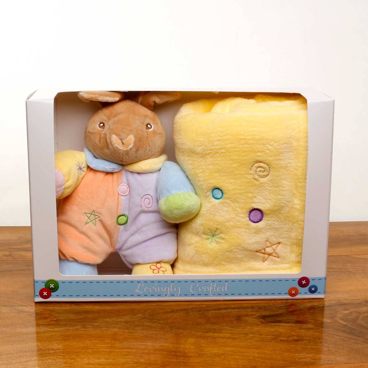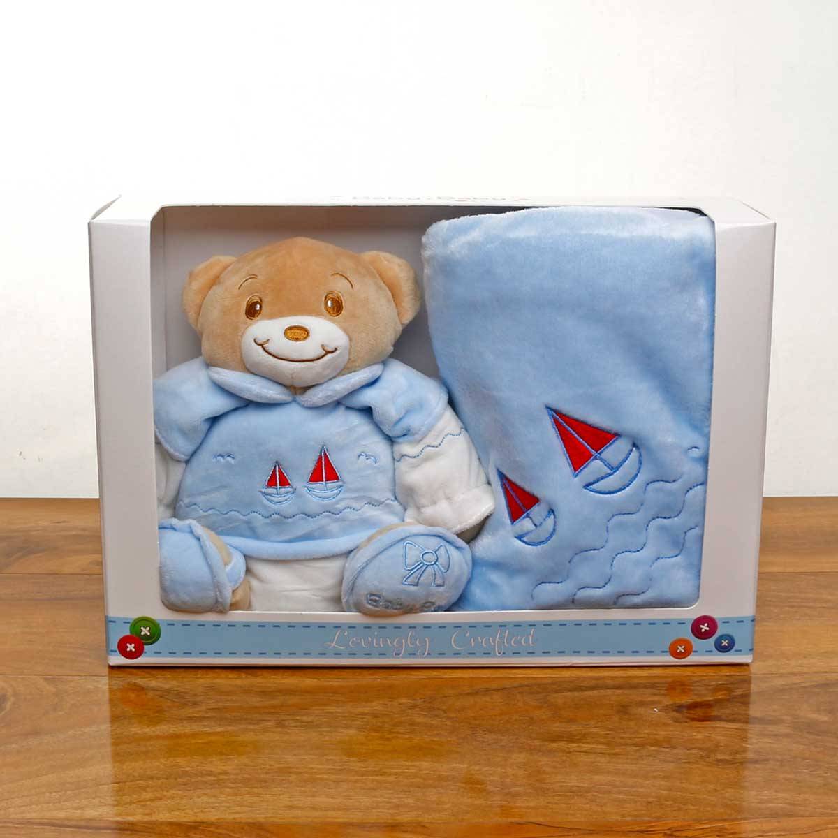 Ultra soft plush teddy with soft matching blanket.