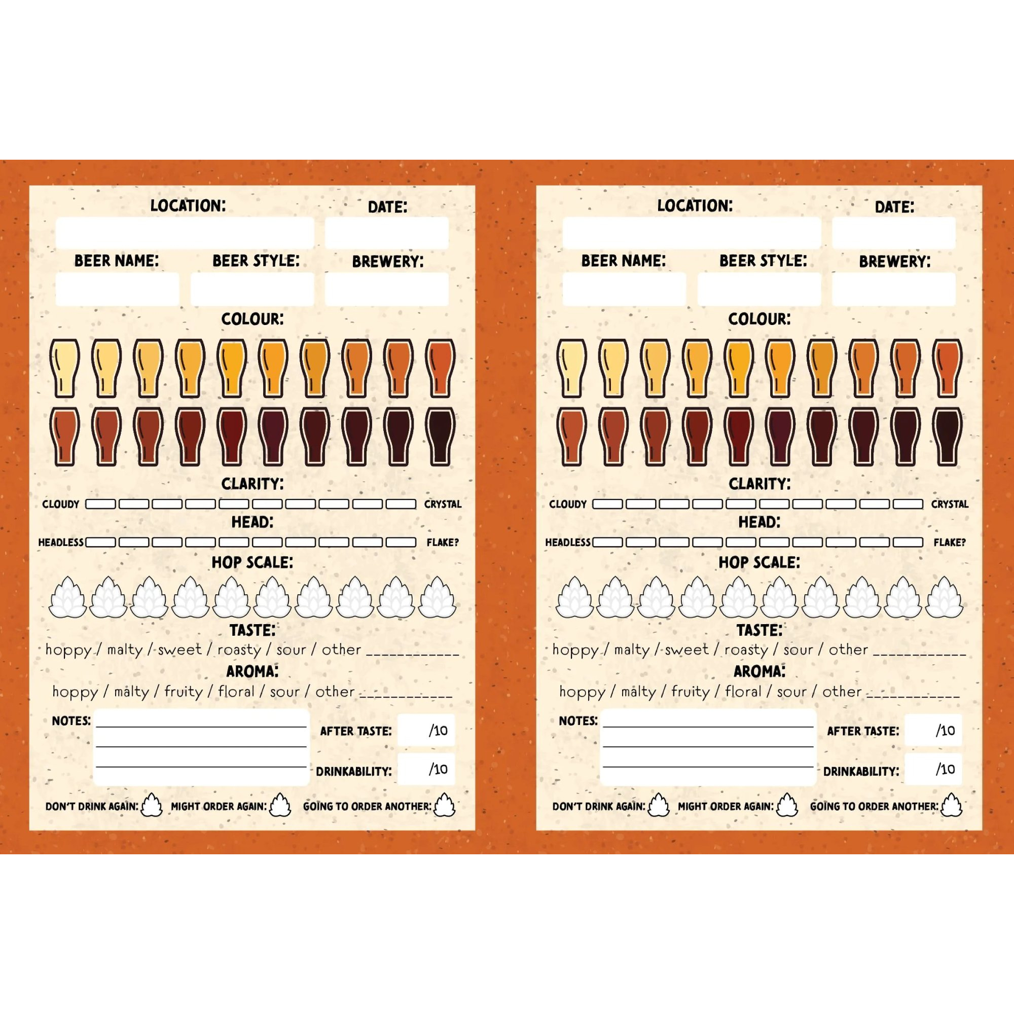 - Detailed Rating System: Track colour, clarity, head retention, hop level, taste, aroma, and overall drinkability with easy-to-use graphic rating pages.