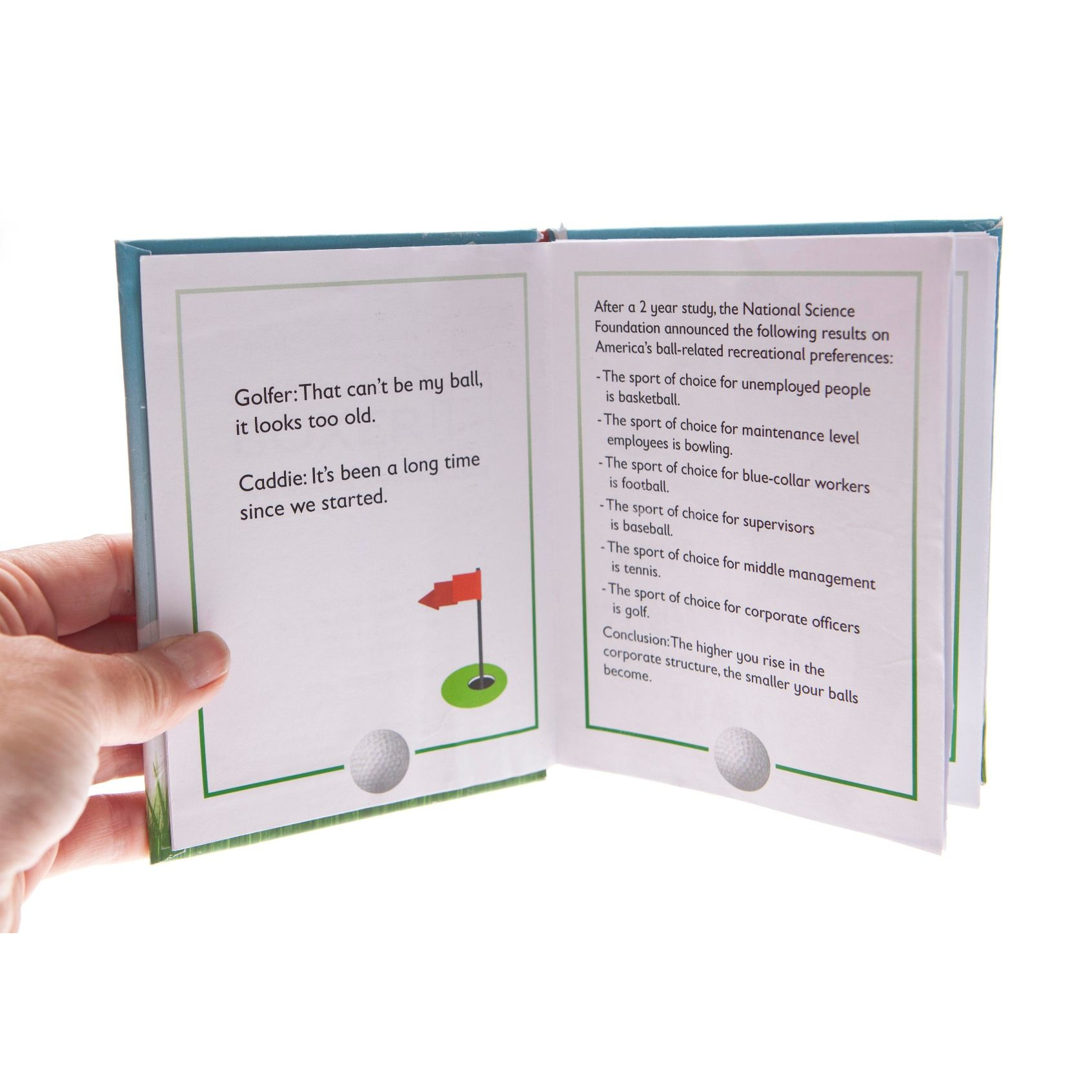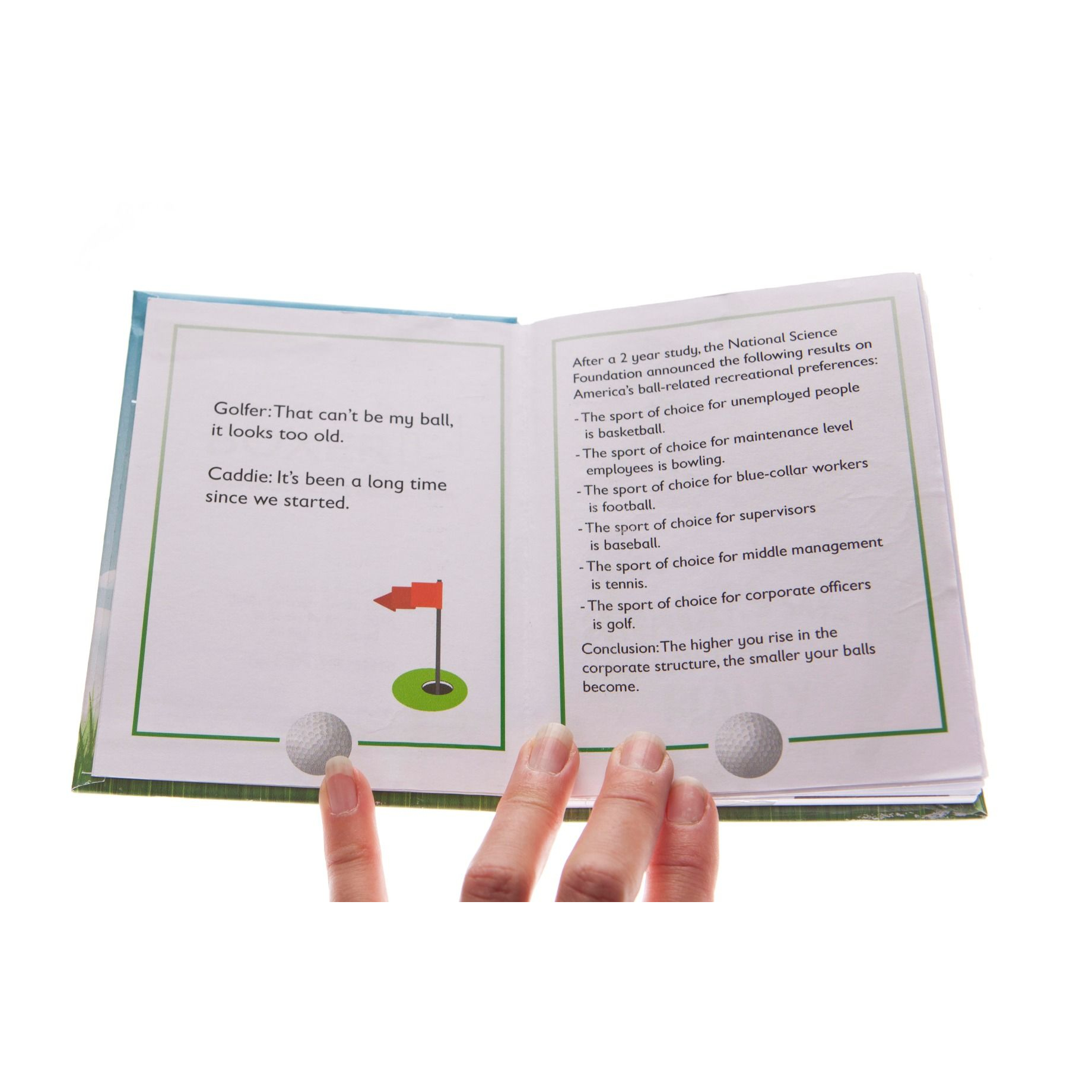 "In need of some classic jokes to impress your fellow golfers at the club? Become the big shot of the fairway with this hilarious collection of pocket sized golf jokes! With 96 pages full of golfing jokes, one liners and hole in puns, this hardback book is certain to putt a smile on your face and make you laugh your pars off. Perfect for a golfing fanatic. (It beats socks… you always get a hole in one!) Example Jokes: An avid golfer goes to see a fortune teller to enquire if there are any golf courses in heaven. “Well, I have good news and bad news” she tells the golfer. “What’s the good news?” asks the golfer. “The good news sir is that the courses in heaven are spectacular, without a doubt better than anything you have EVER seen on earth.” “What’s the bad news then?” he asks. “You have a tee time at 8:30 tomorrow morning.” Golfer: This is the worst golf course I’ve ever played on! Caddie: This isn’t the golf course sir, we left that an hour ago."