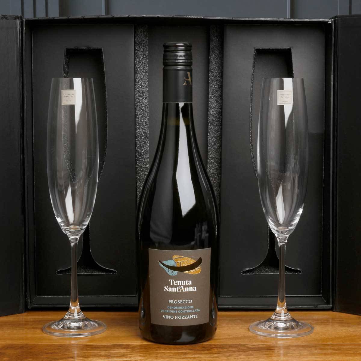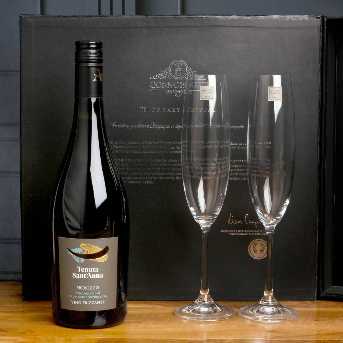 A delightful bottle of Prosecco packed in a stunning Connoisseur Gift Box from Tipperary Crystal with two accompanying glasses - great gift to celebrate any occasion.