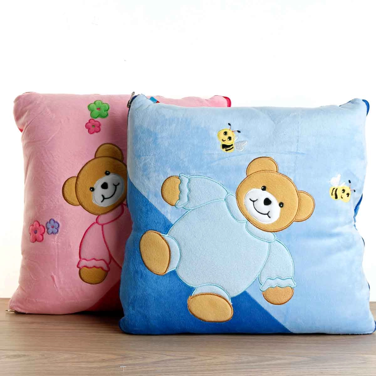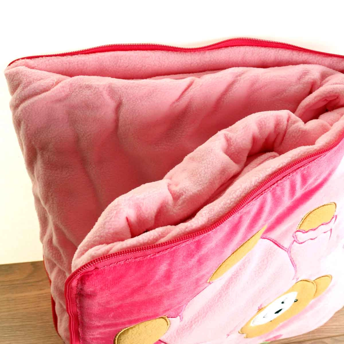 The soft pillow has a zip on three of its sides and when unziped, opens up into a large, soft quilt blanket.