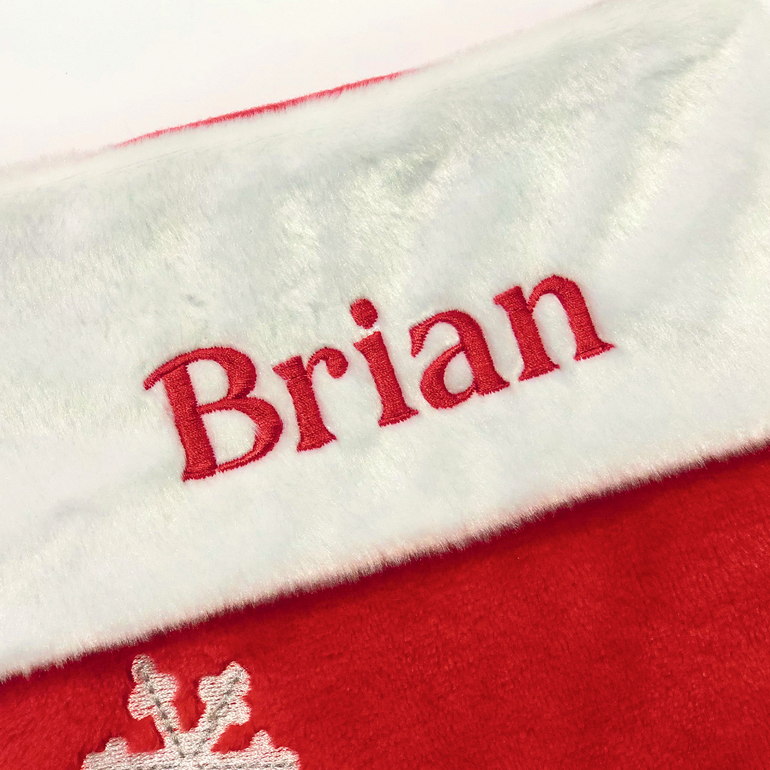 The name is embroidered in red thread.