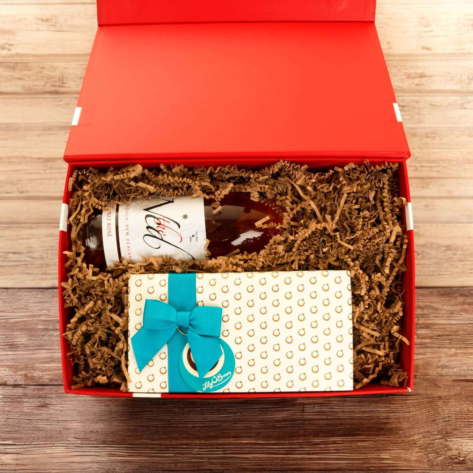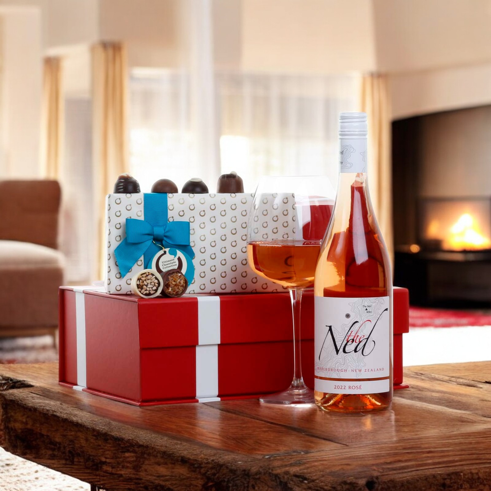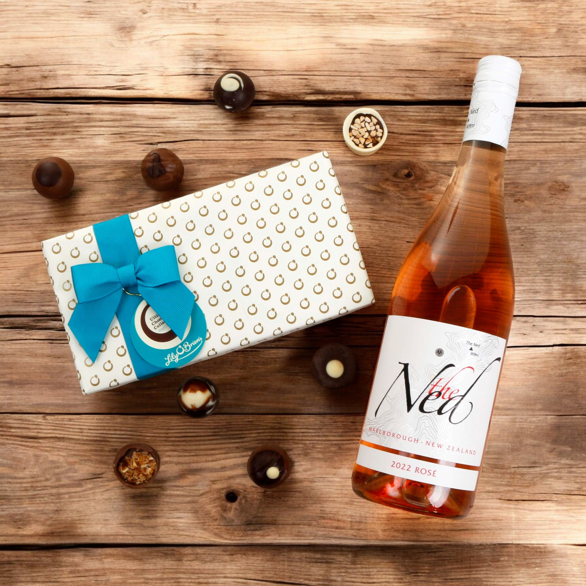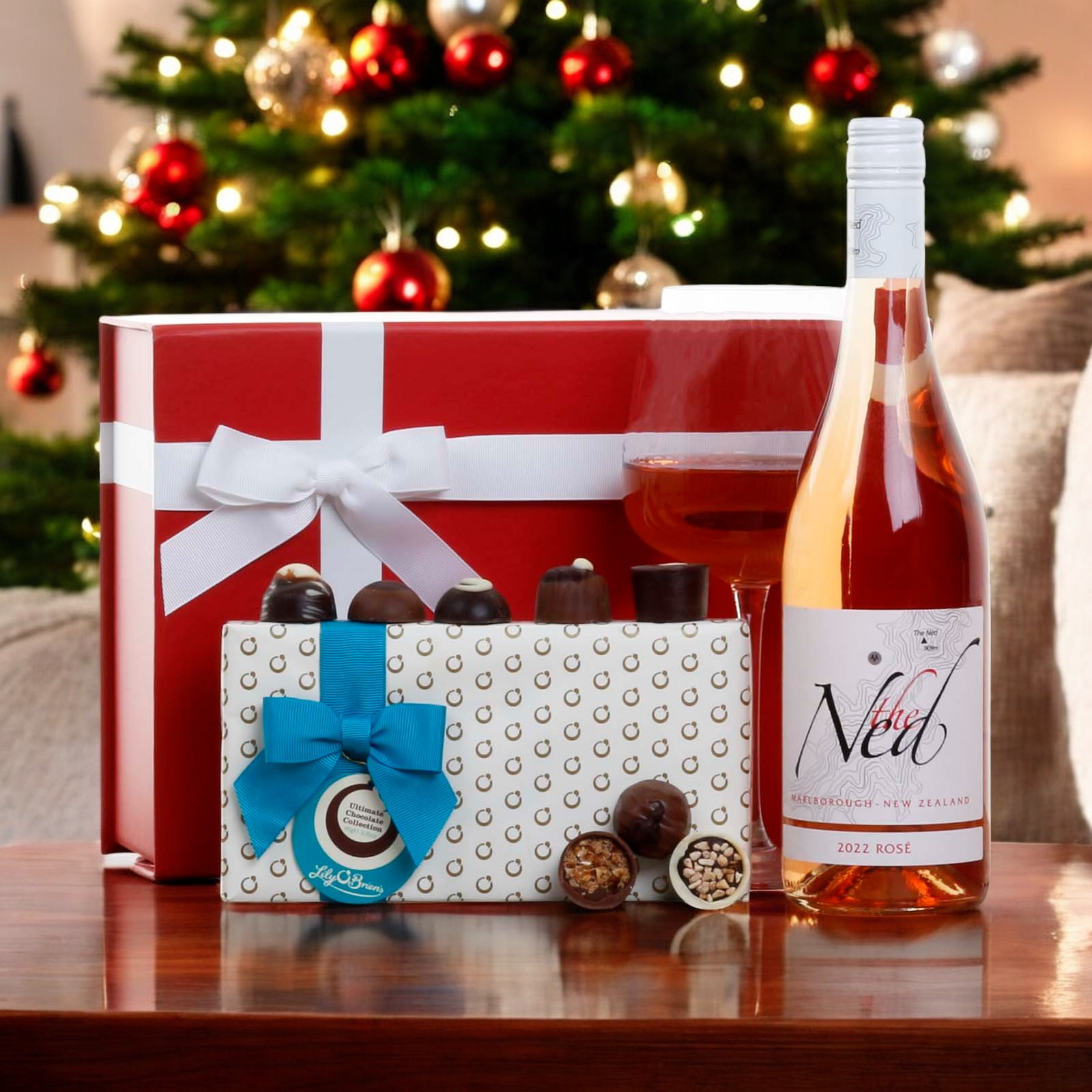 A box of luxury chocolates from the Irish producer Lily O'Brien's, coupled with a bottle of New Zealand Rosé.