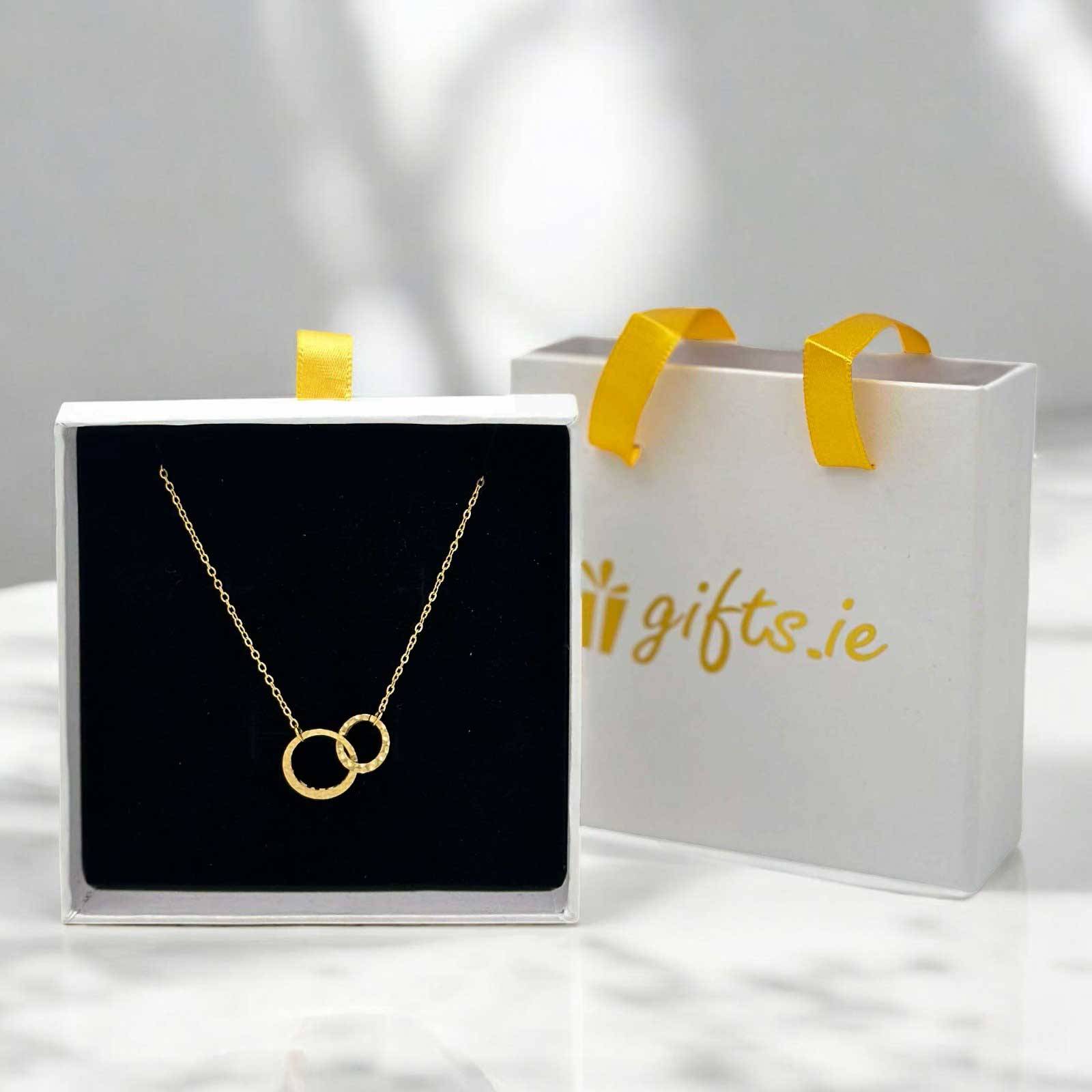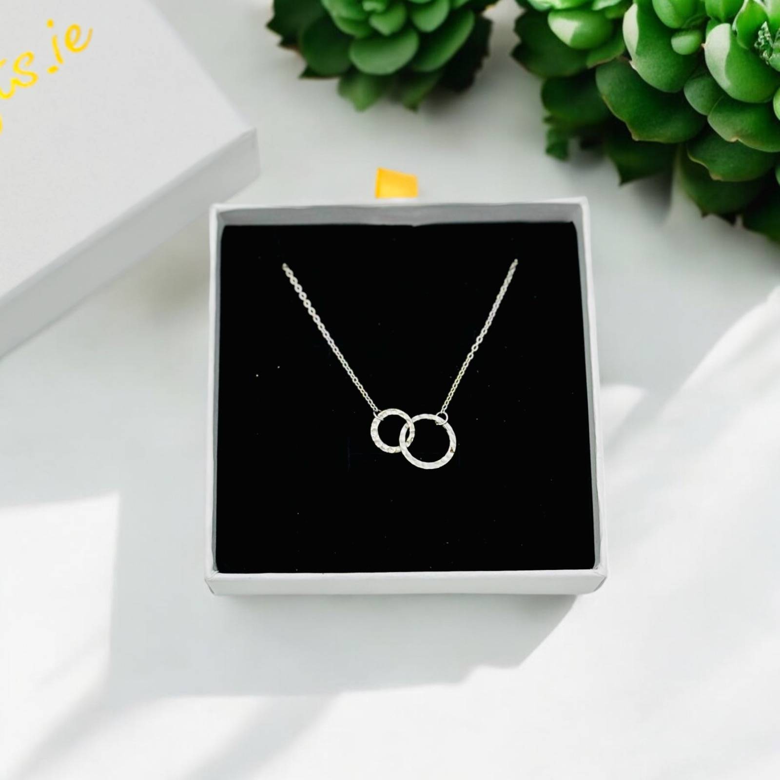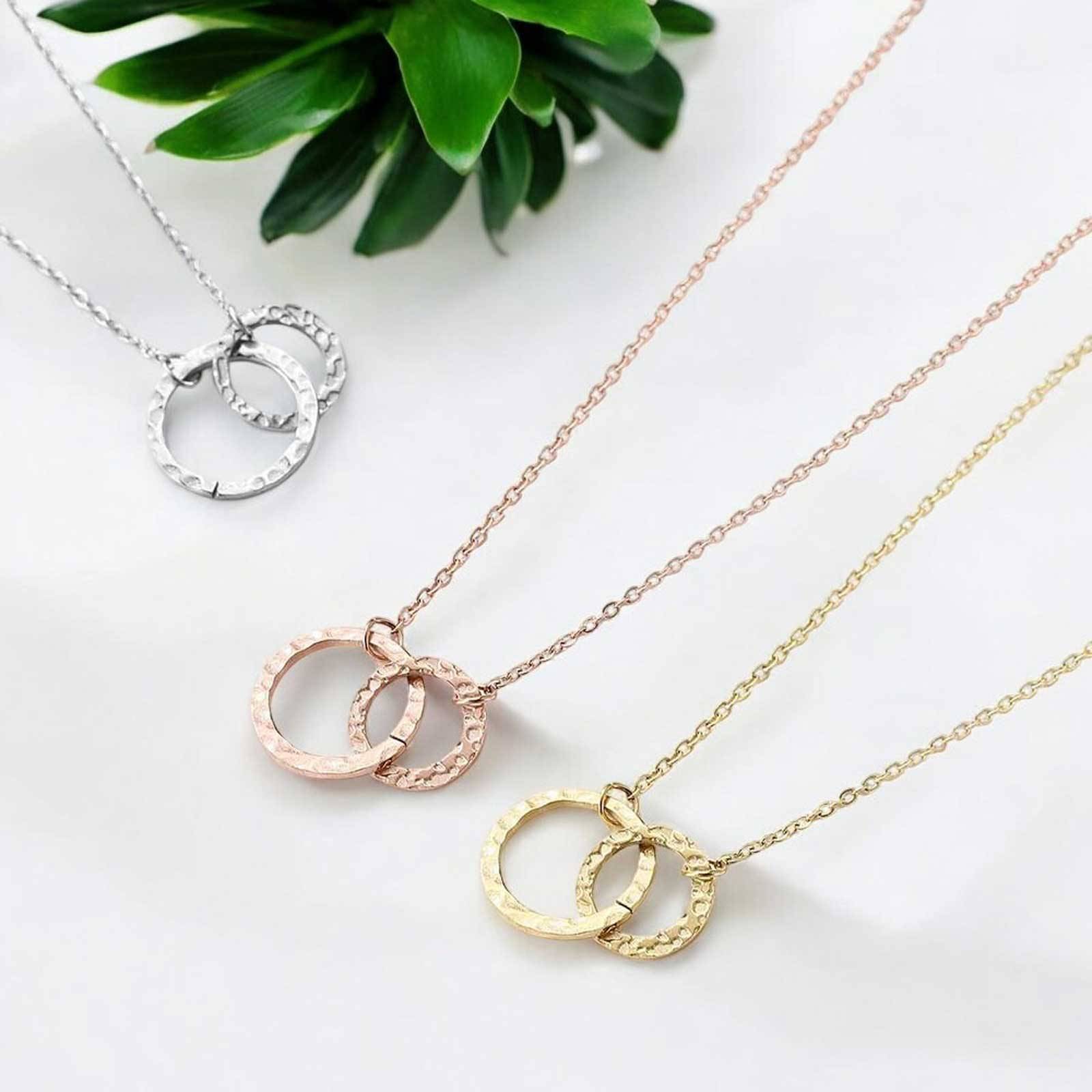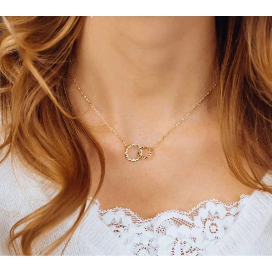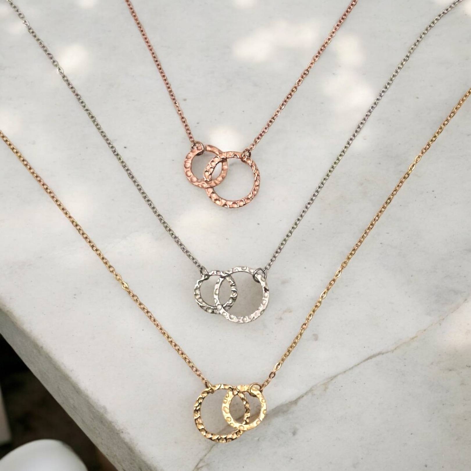 Our stunning Rose Gold interlink necklace features two hammered discs interlinked—perfect for everyday wear, worn alone or paired with other necklaces.