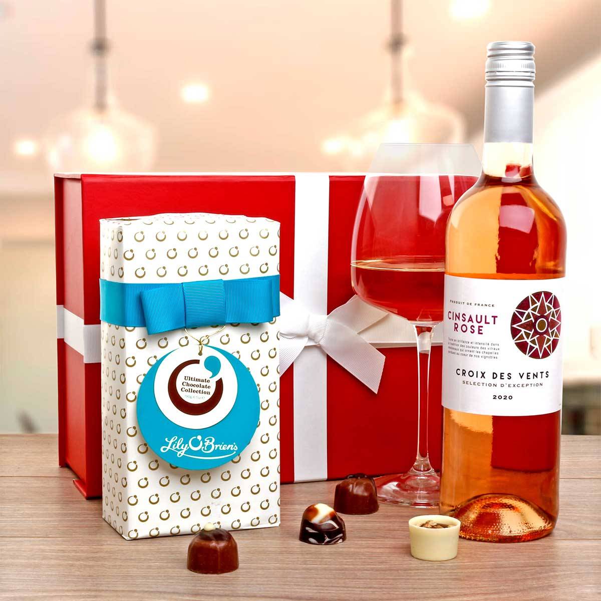 A box of luxury chocolates from Irish producer Lily O'Brien coupled with a bottle of French Rosé, from the Cinsault grape in the South of France.