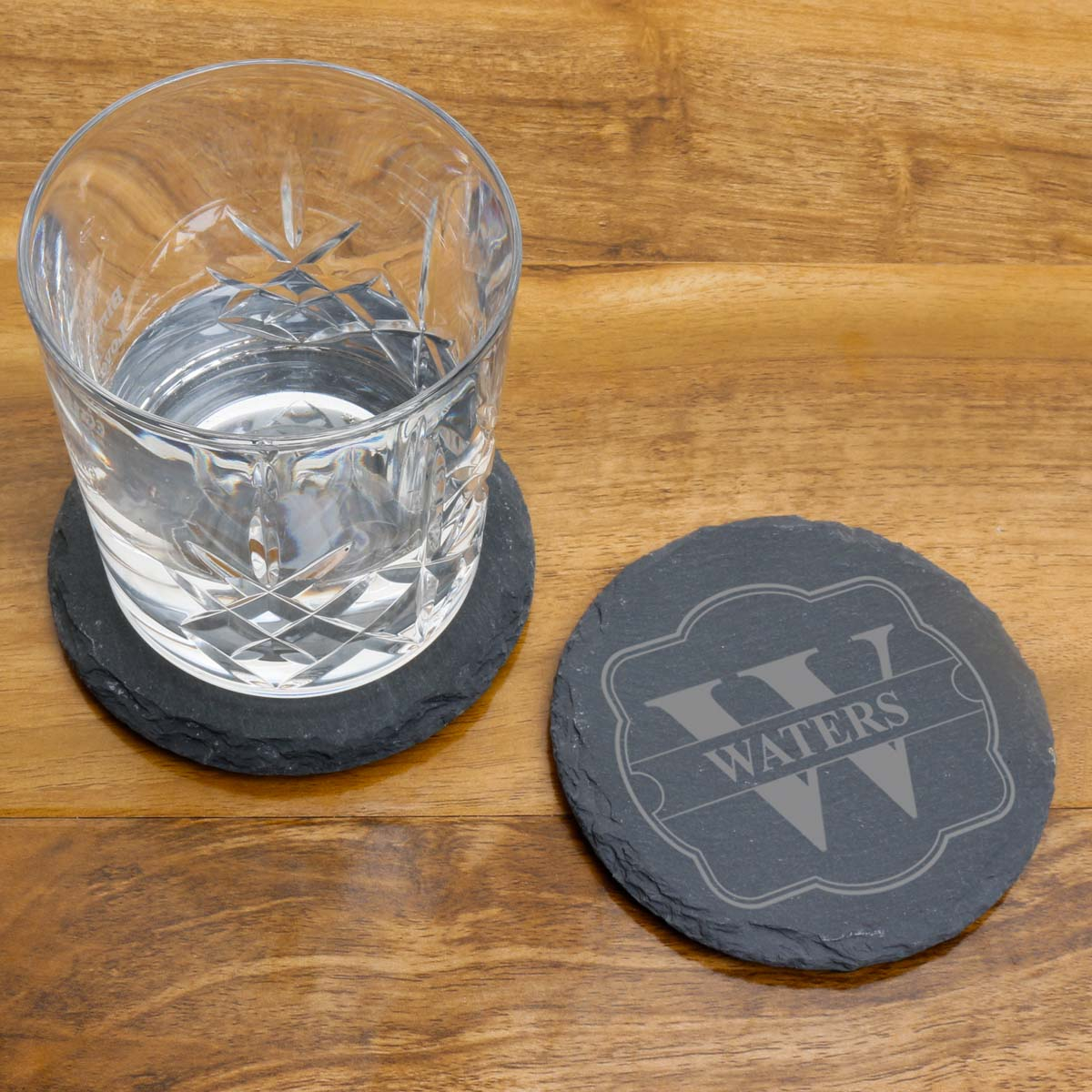 Each coaster is made from natural slate and is engraved with the recipient's family name.