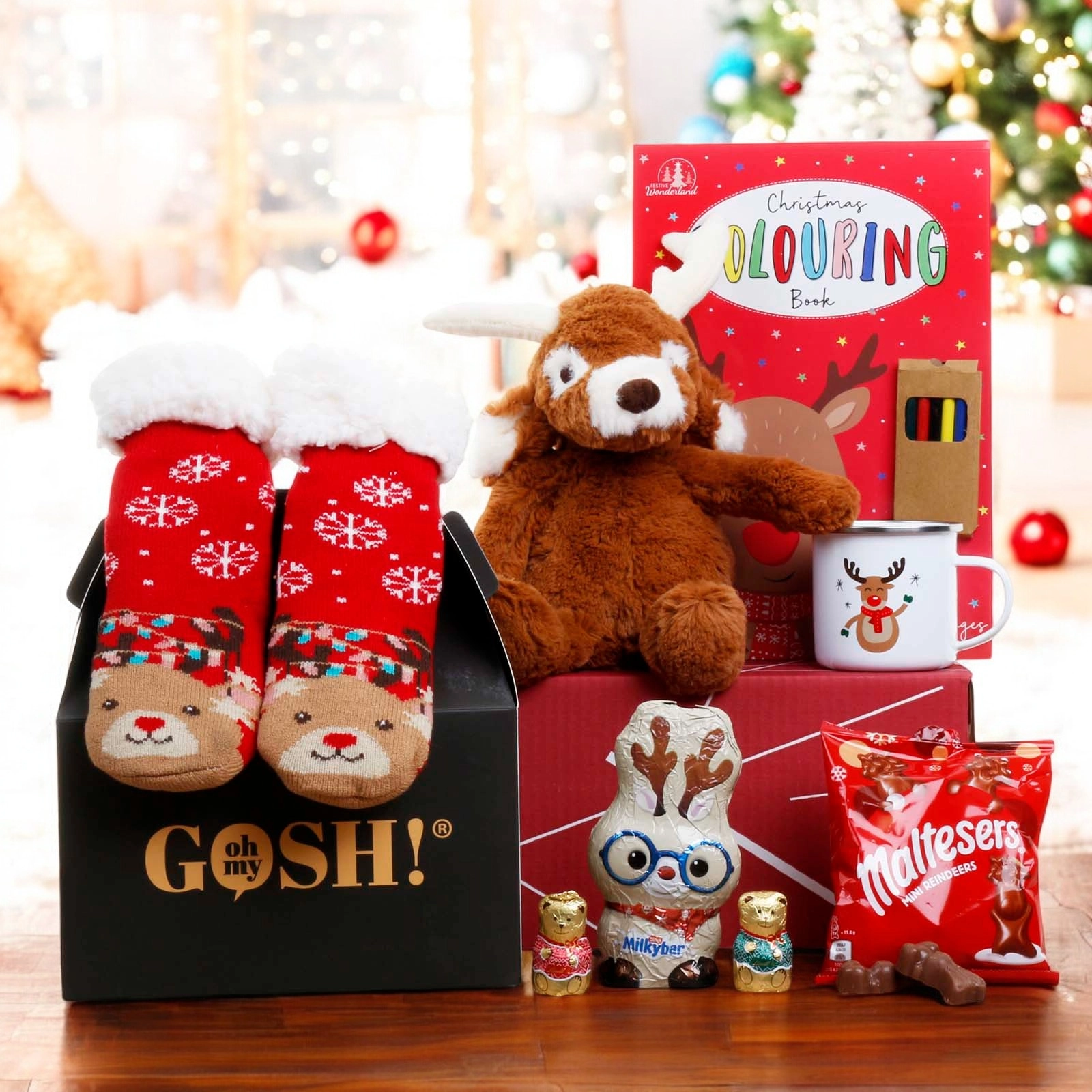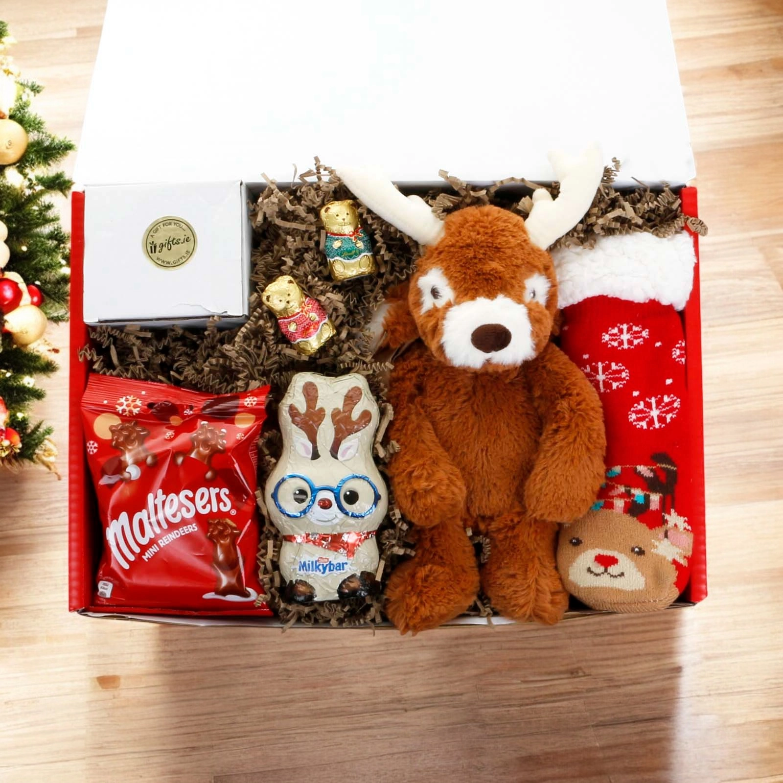 Sweet treats like a Milkybar white chocolate reindeer, a bag of Maltesers chocolate reindeers, and delightful Lindt chocolate teddy bears offer a delicious taste of Christmas. It's a heartwarming and fun-filled gift for children to enjoy during the festive season!