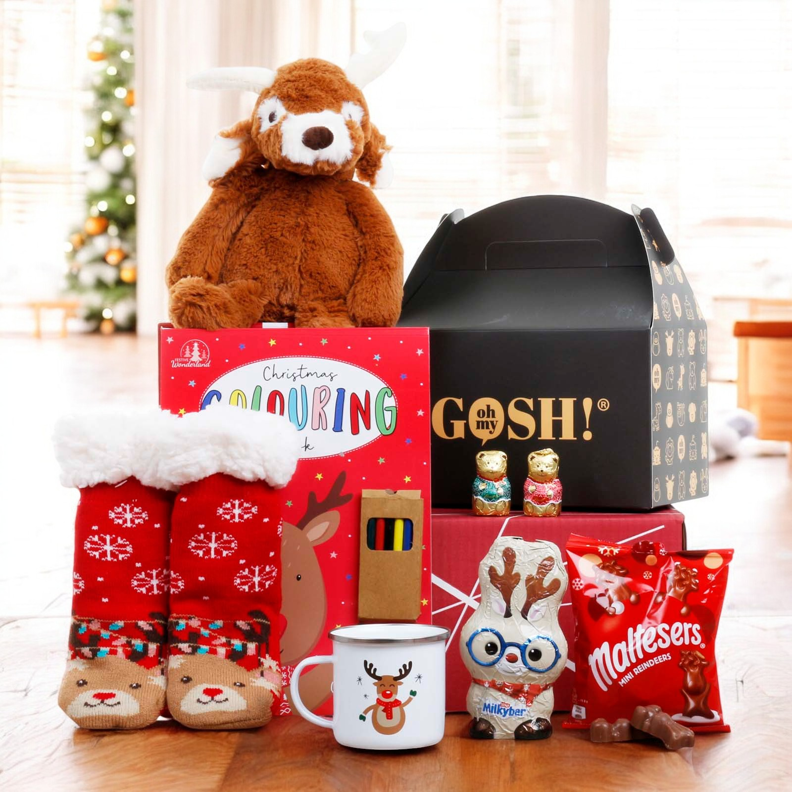 This children’s hamper is a festive bundle of joy, perfect for bringing Christmas cheer! It includes a soft and cuddly Gosh Reindeer toy, ideal for cosy snuggles, along with fluffy Christmas socks to keep little feet warm during the festive season.