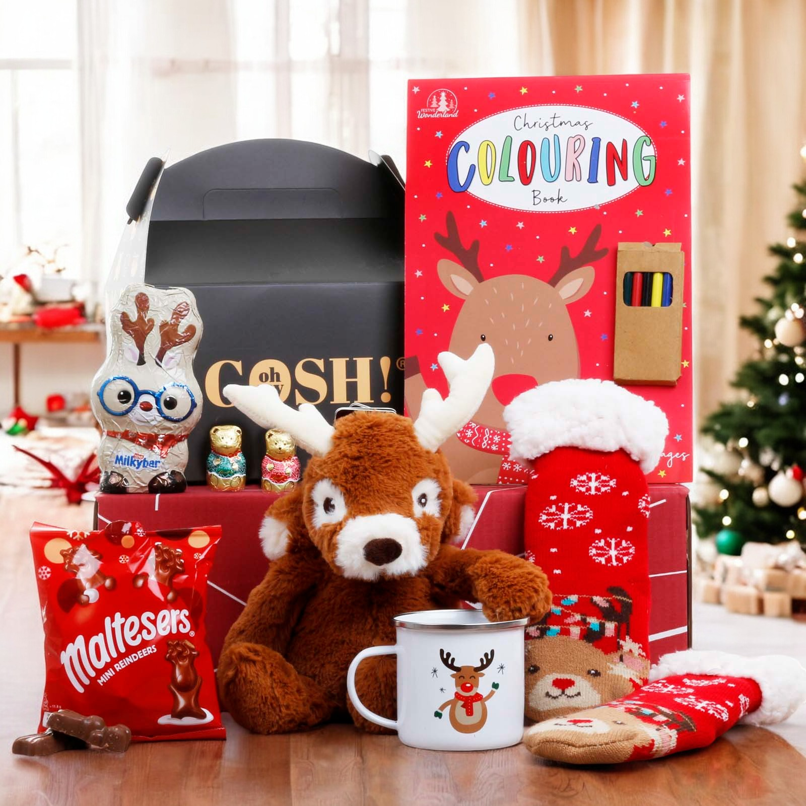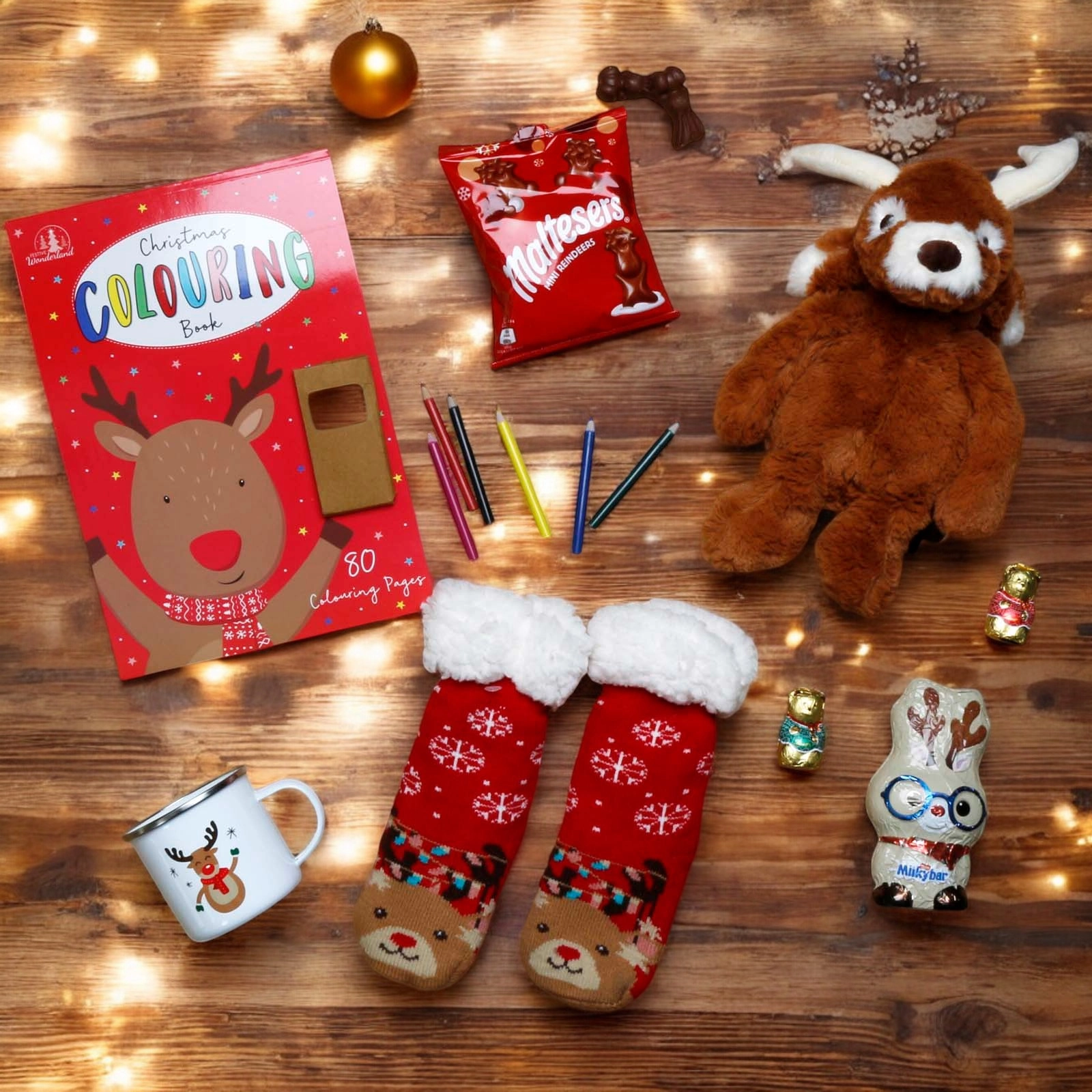 The charming reindeer enamel mug adds a touch of holiday magic to every sip, while the reindeer-themed colouring book & crayons sparks creativity and keeps kids entertained.