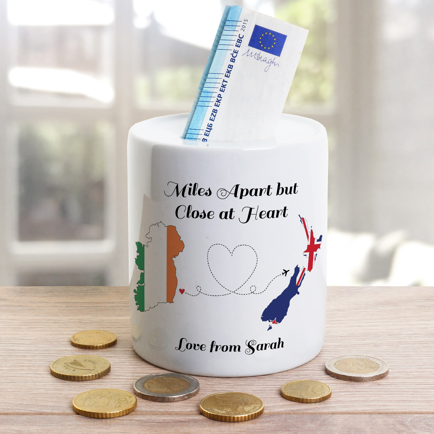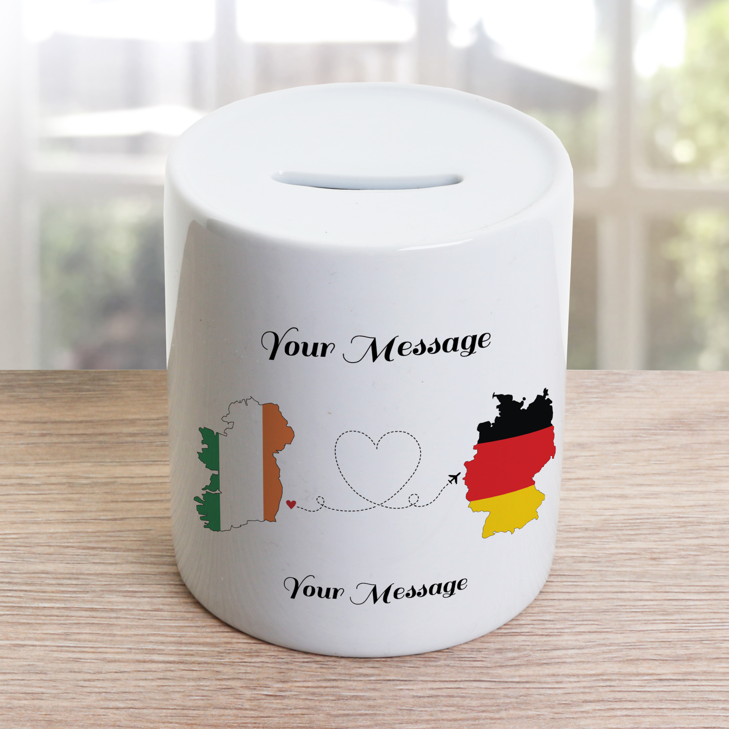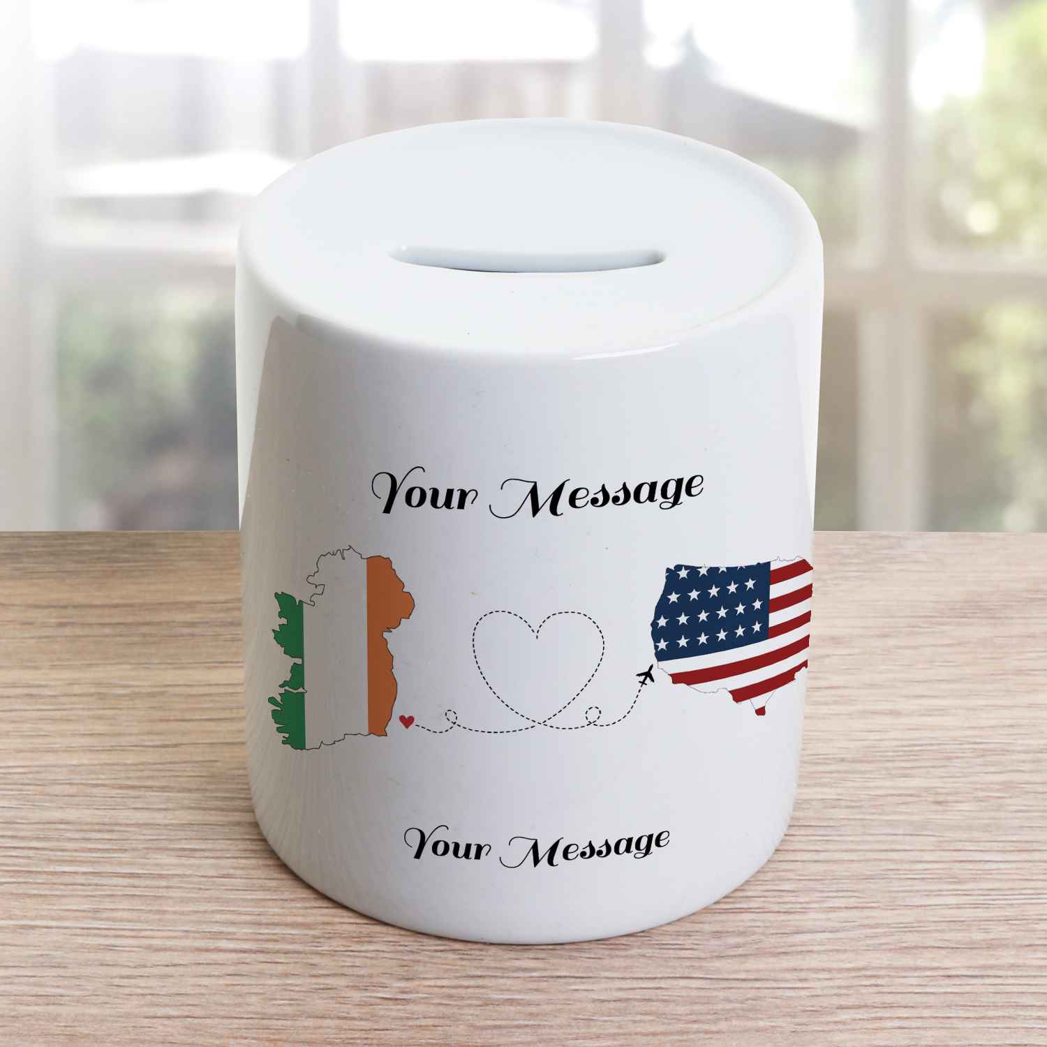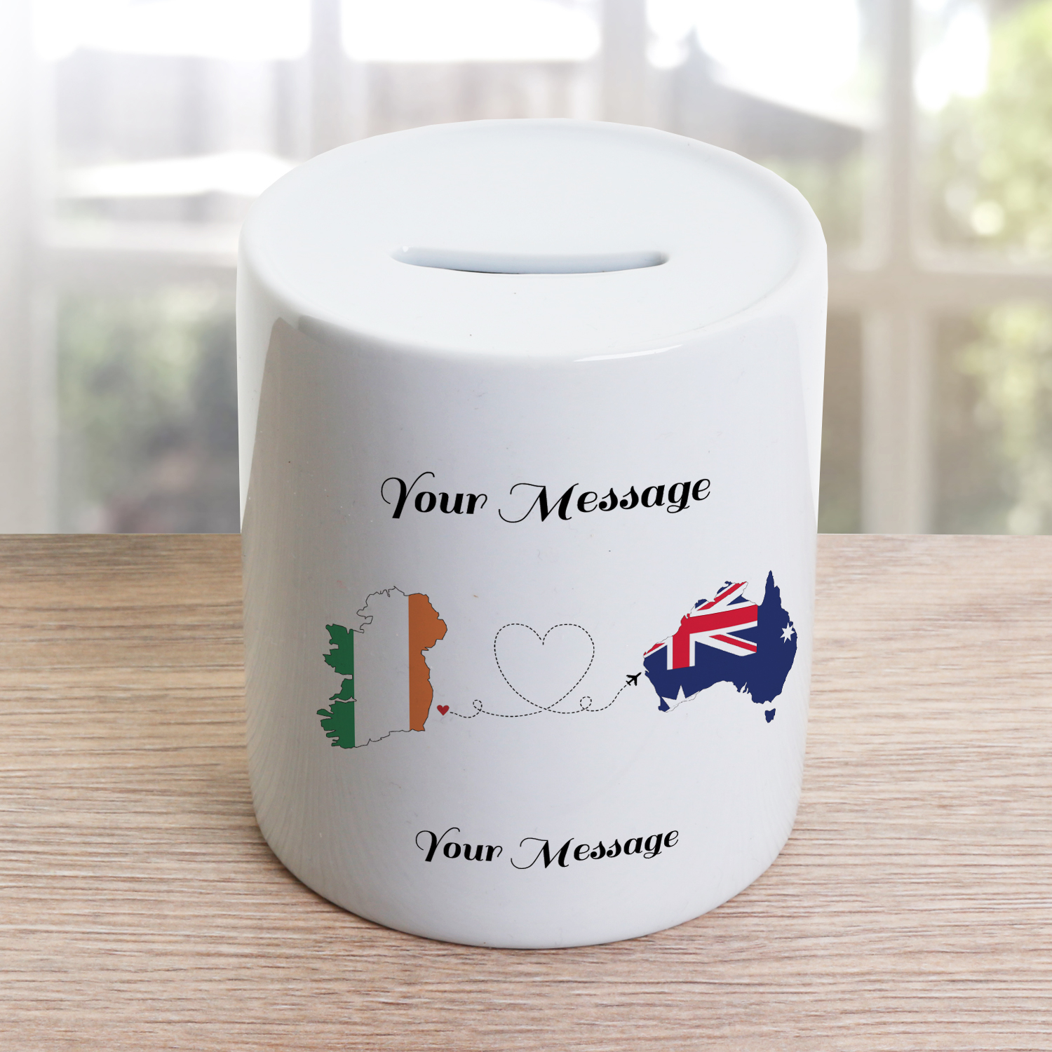This cute money jar holds a plaque depicting an image of hearts being sent from one country to another. Ireland is the primary country and a choice of twelve other countries can be selected; these are;