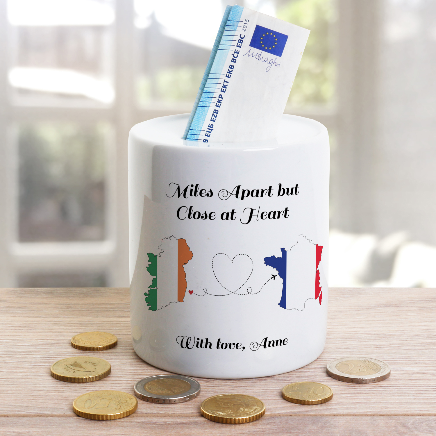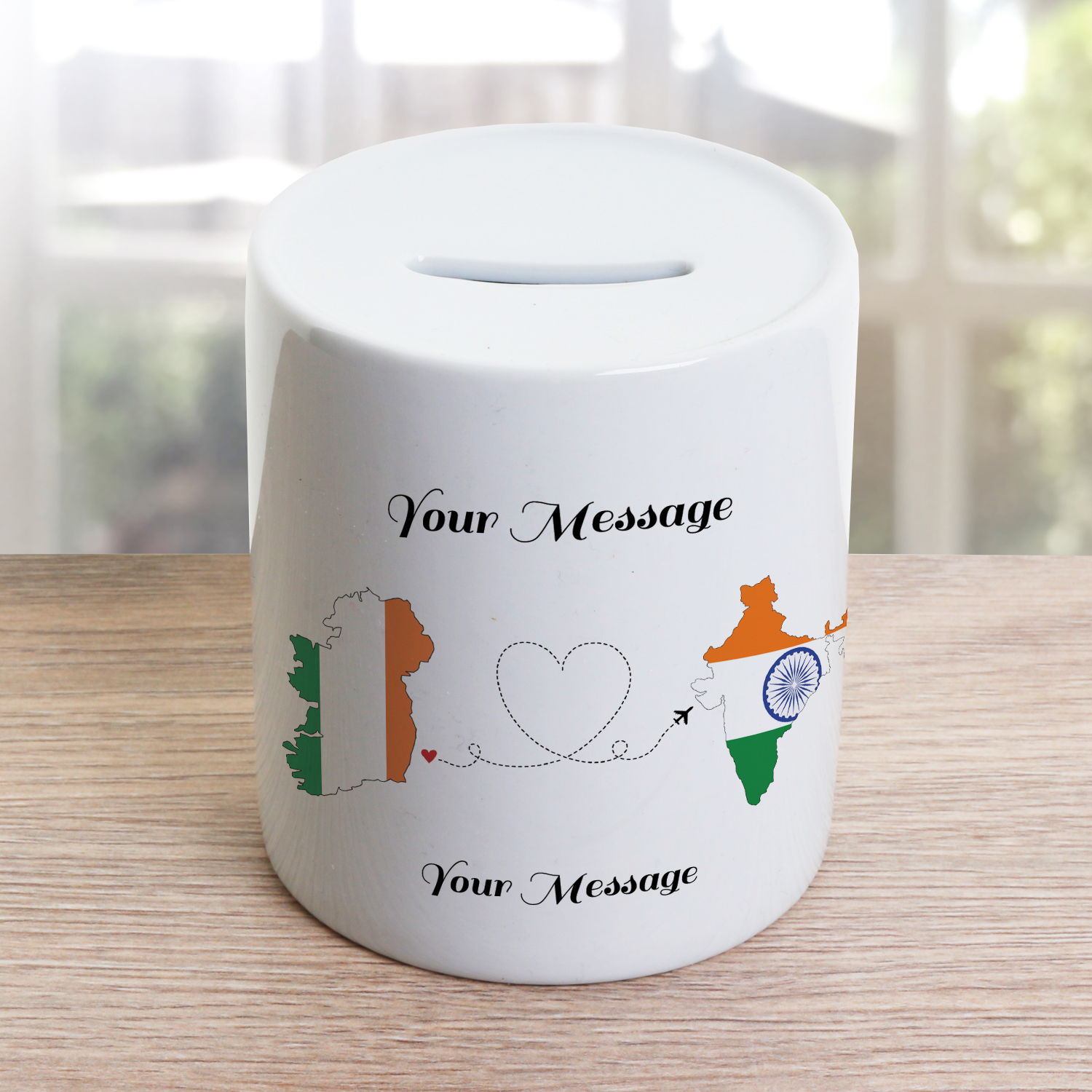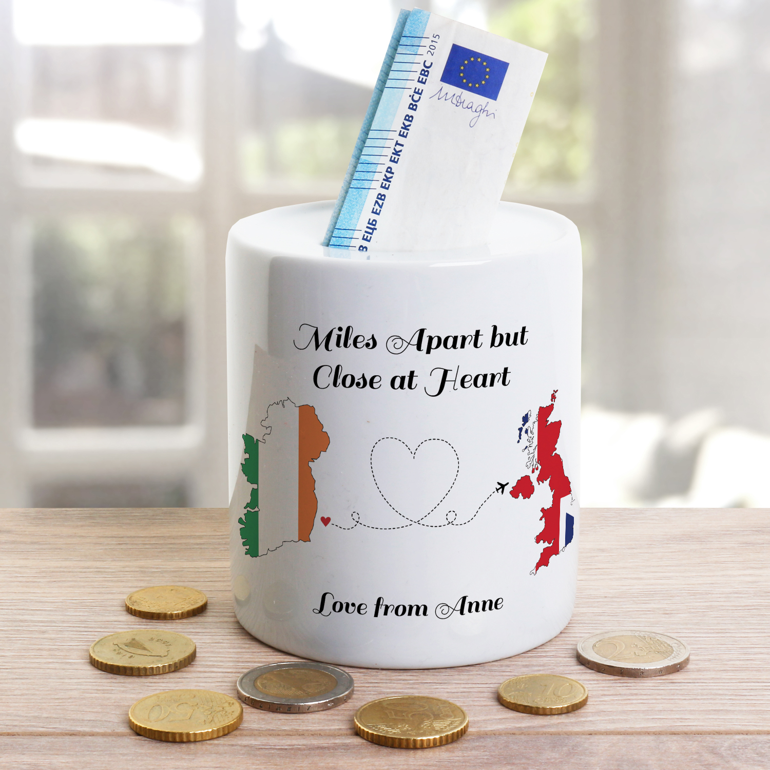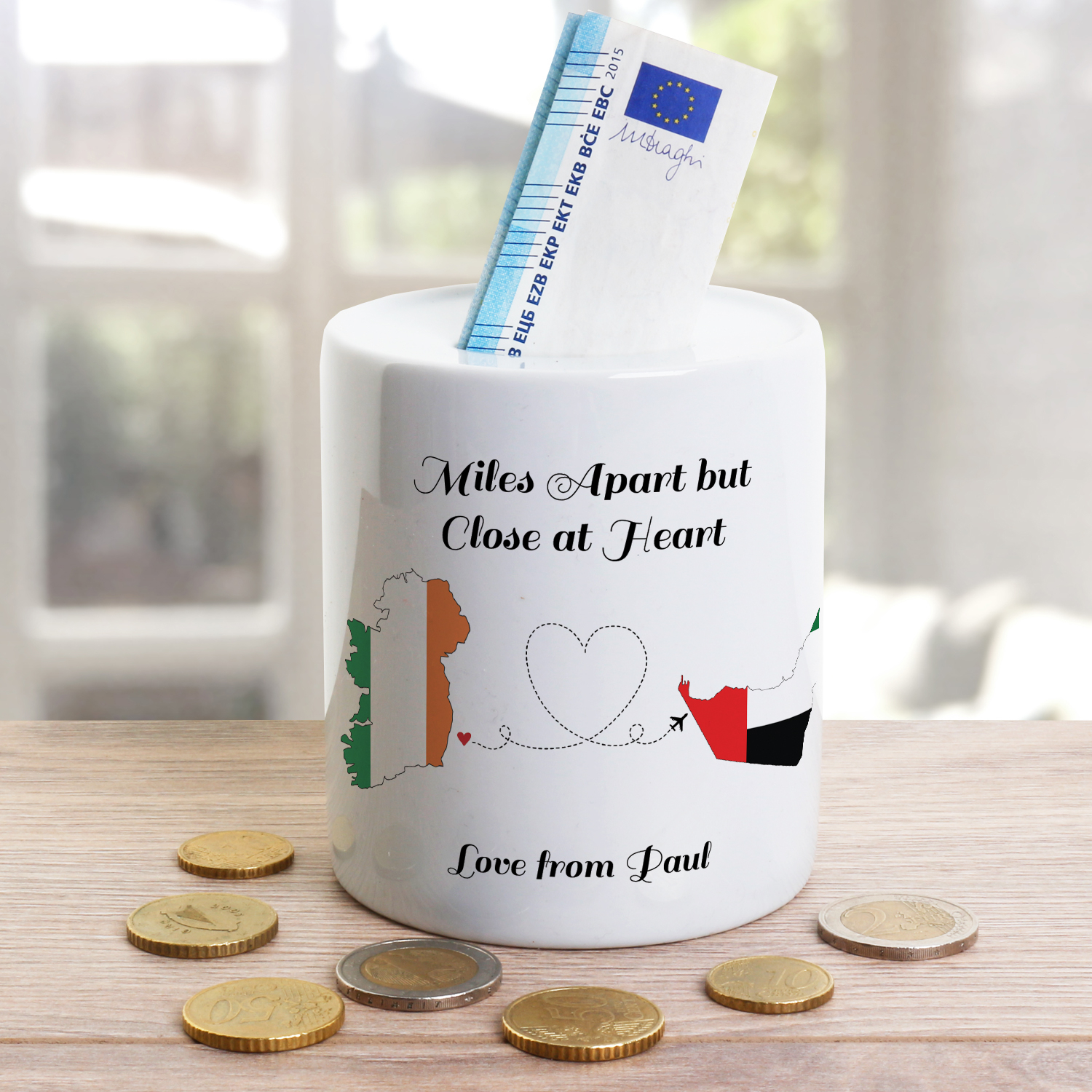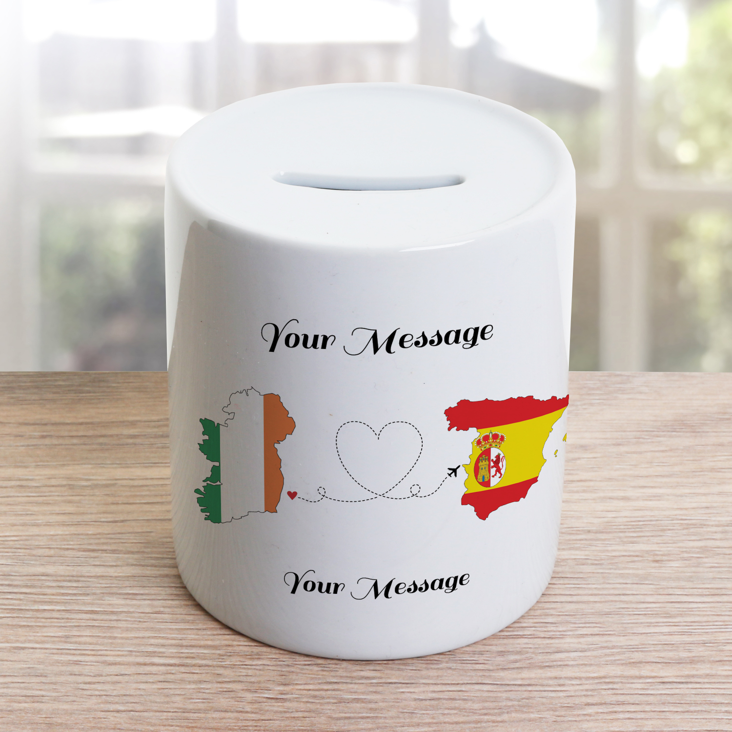 This cute money jar holds a plaque depicting an image of hearts being sent from one country to another. Ireland is the primary country and a choice of twelve other countries can be selected; these are;