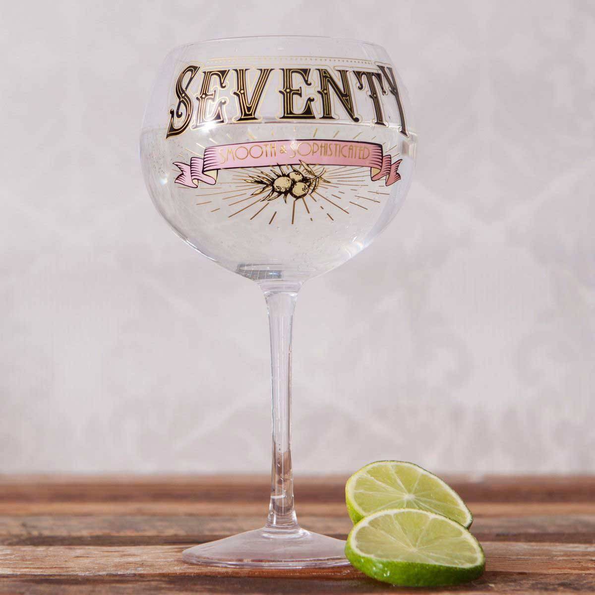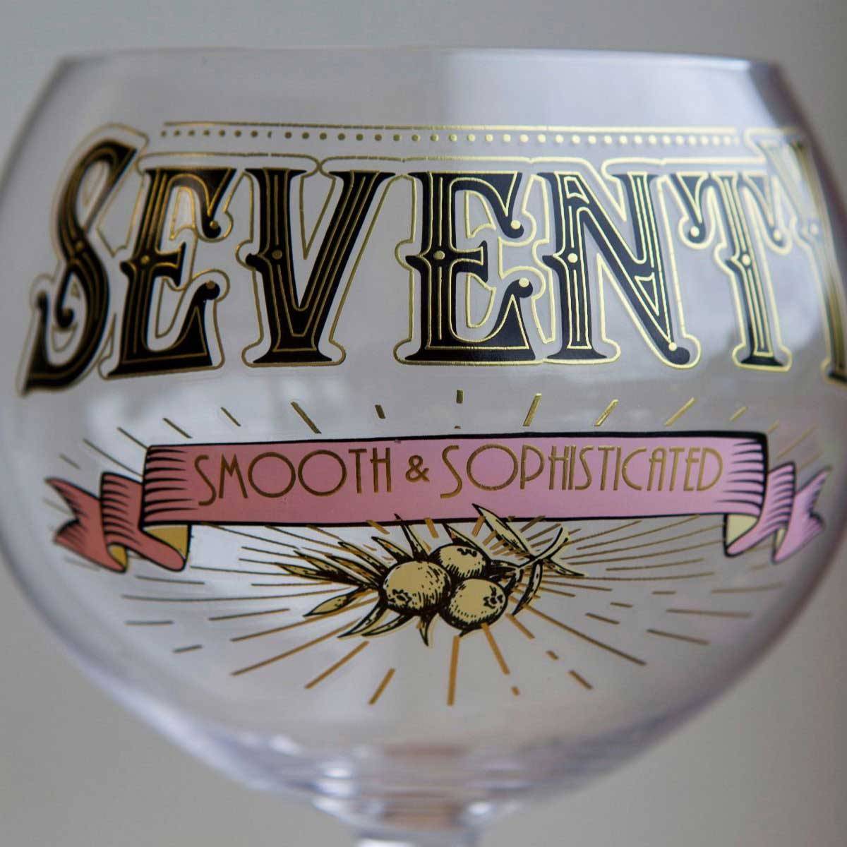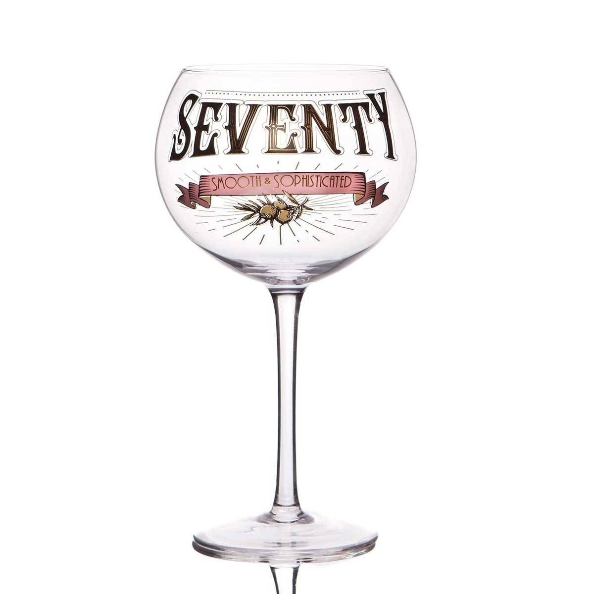 Celebrate a special 70th birthday in style with this gorgeous decorative gin glass. This glitzy glass is decorated with beautiful text that reads “Seventy – Smooth & Sophisticated” and glamorous print detail in black, gold, pink and ivory. Packaged in a stylish gift box, this prohibition style glass makes the perfect gift for a sophisticated gin fanatic on their Seventieth birthday.