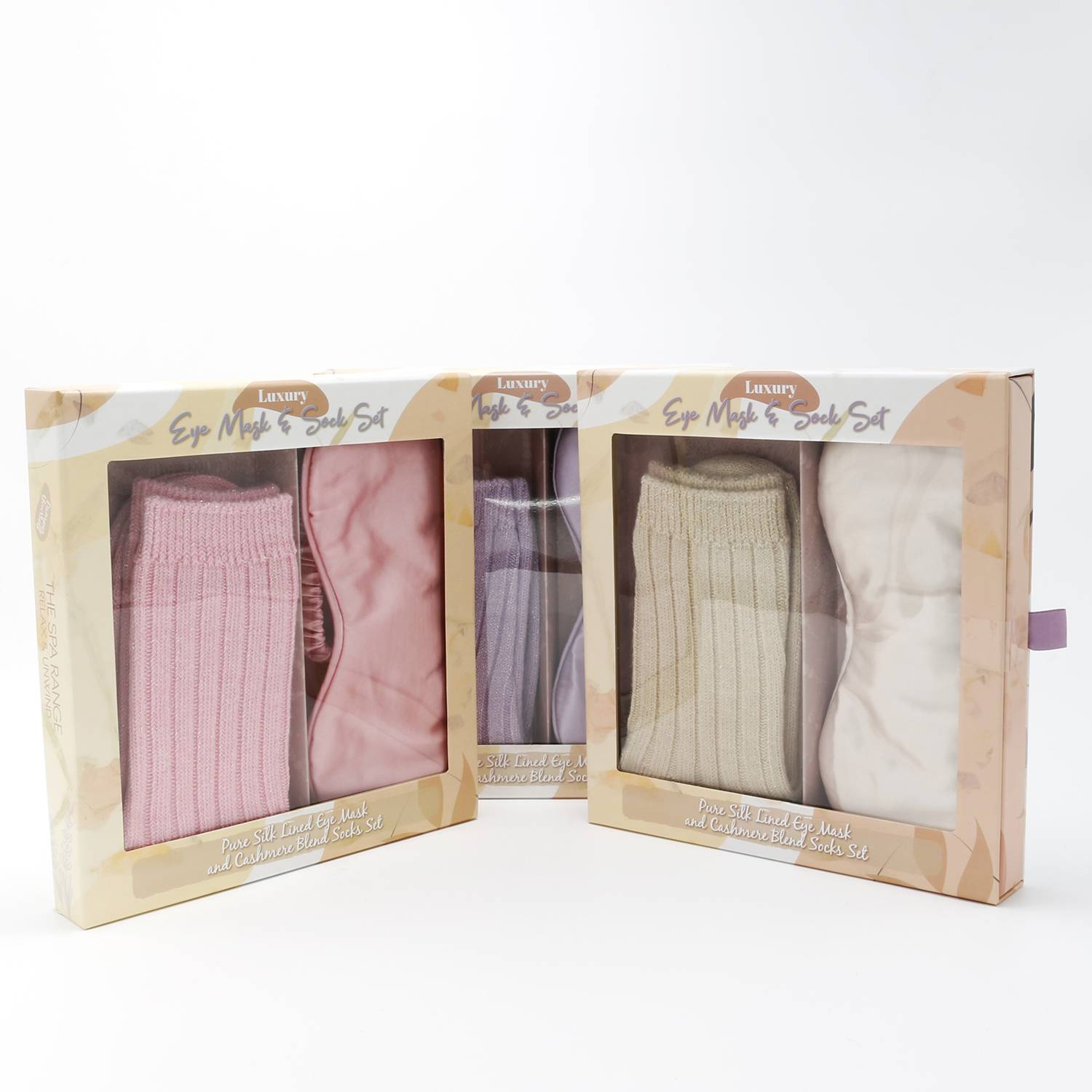 Pure silk lined eye mask and cashmere blend socks set in a champagne colour.