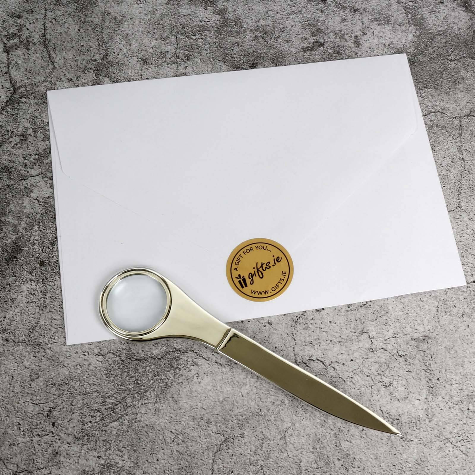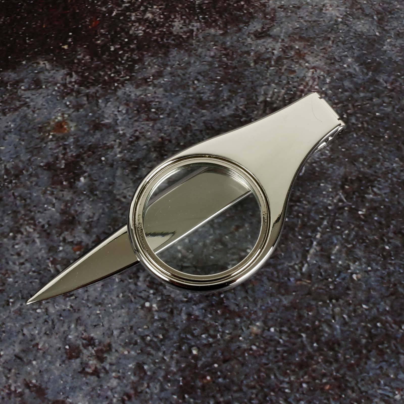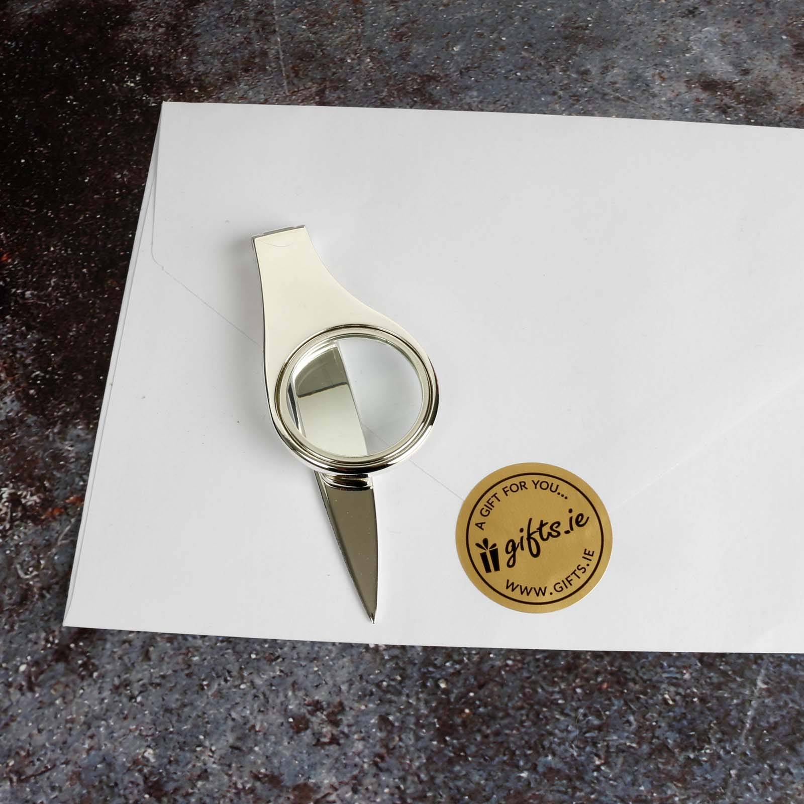 This stylish letter opener features a folding letter opener with a magnifying glass, a highly practical tool for everyday office use.