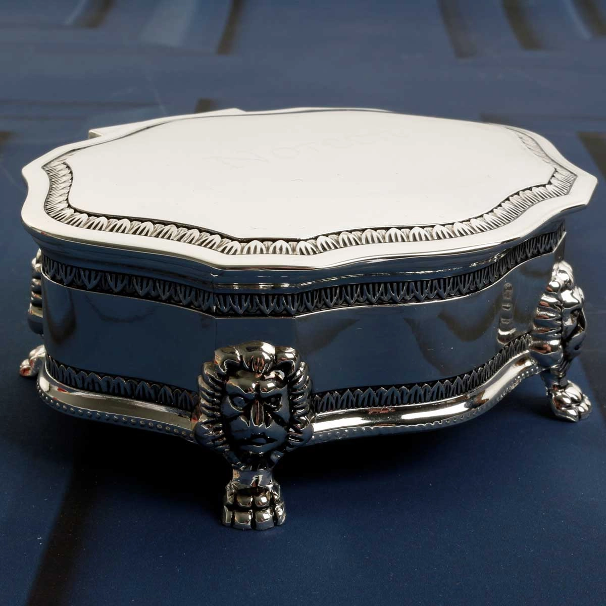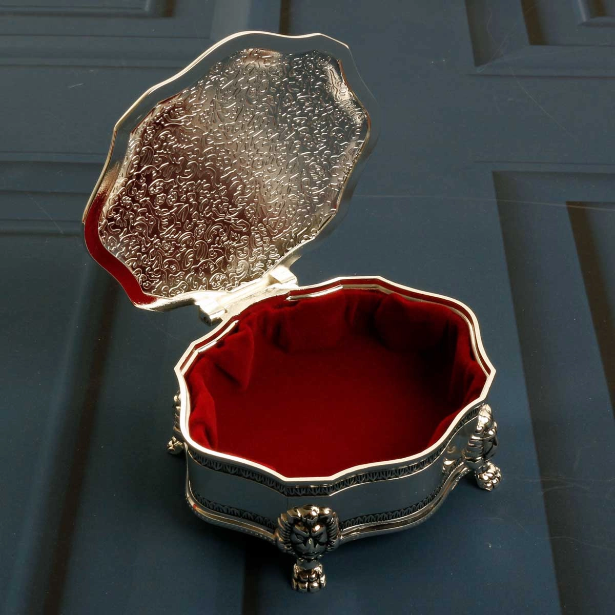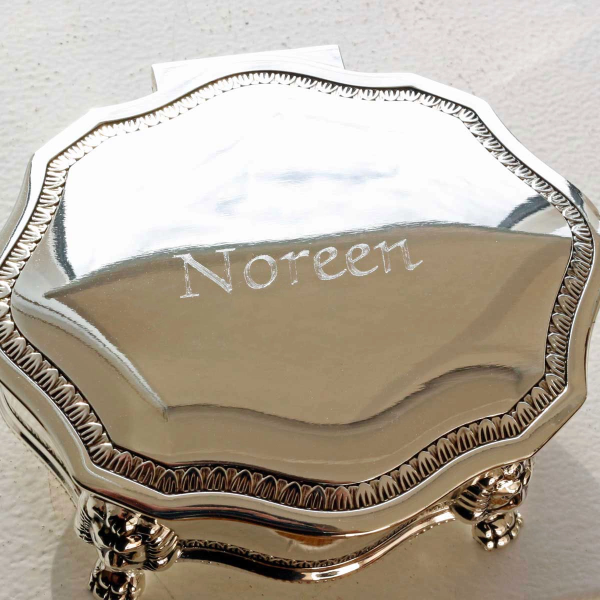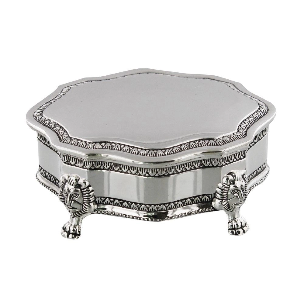 This silver scallop edged trinket box is embellished with an art deco pattern that will bring an elegant and stylish touch to any home.