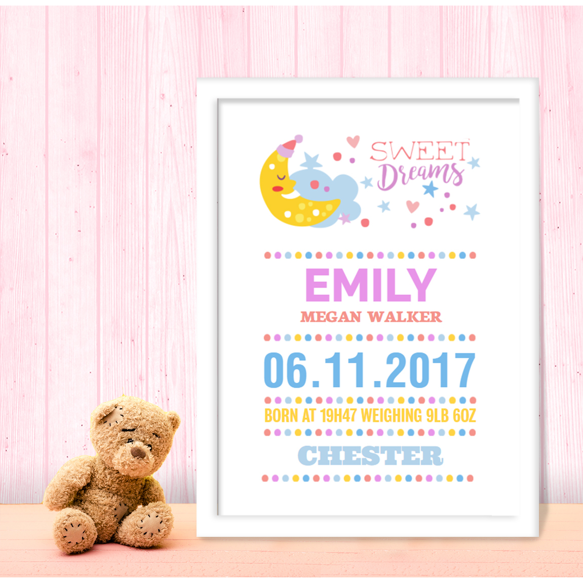 A beautiful gift for any new baby that will look fantastic in their nursury! The print contains Baby's date of birth, full name, time of birth,  weight and place of birth.