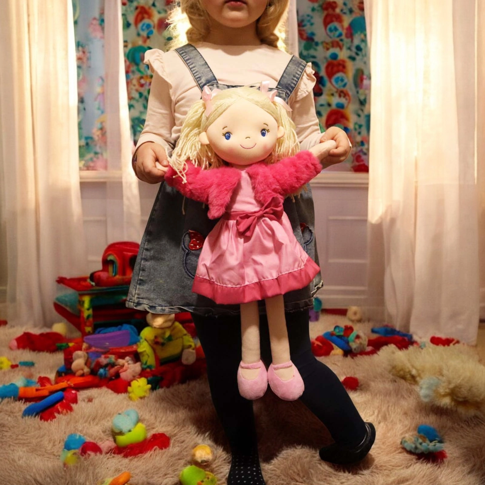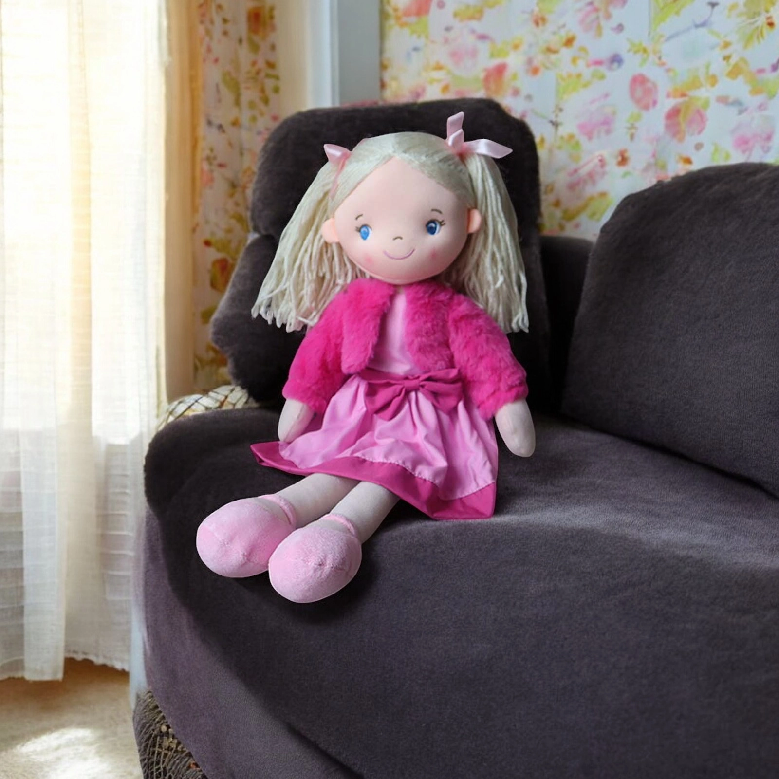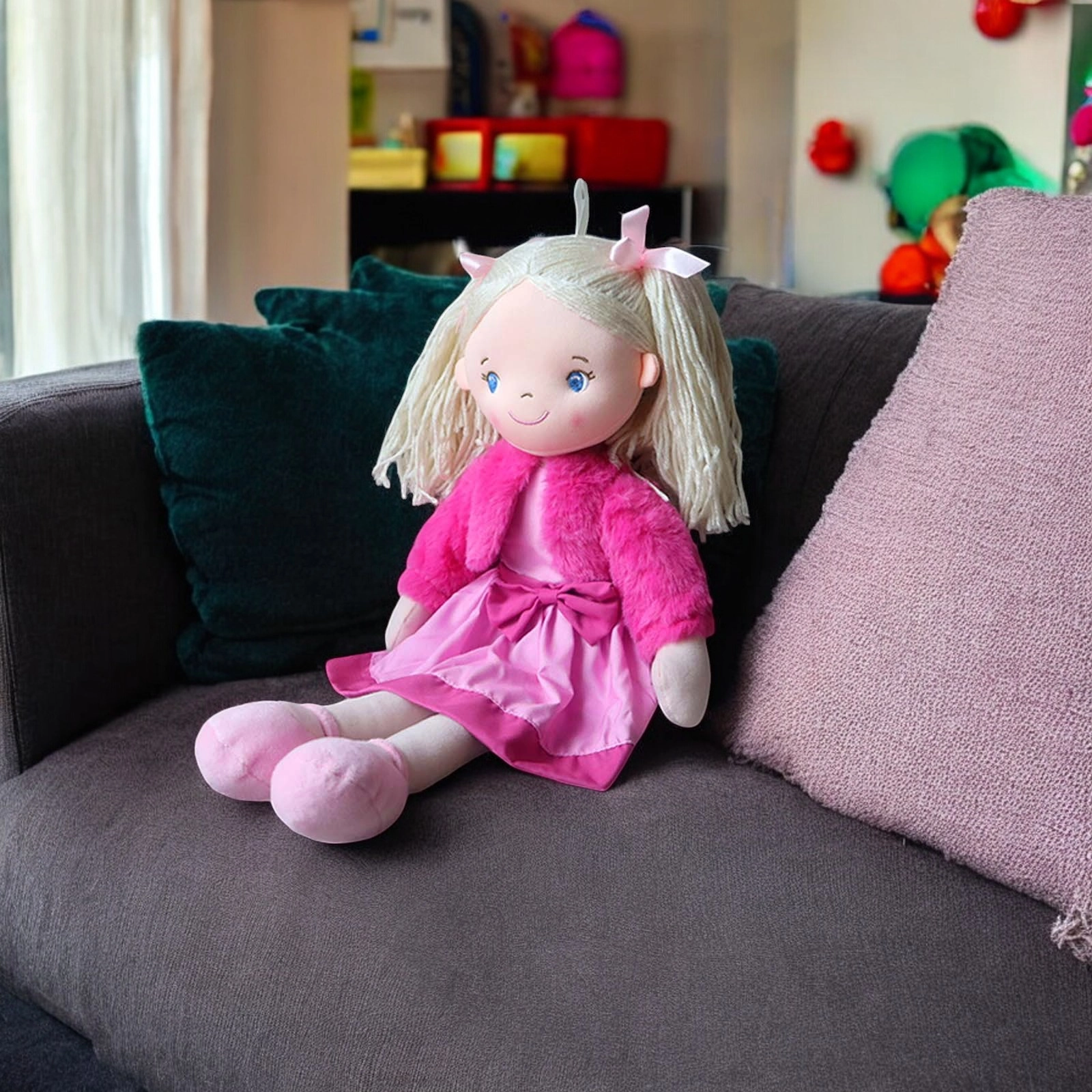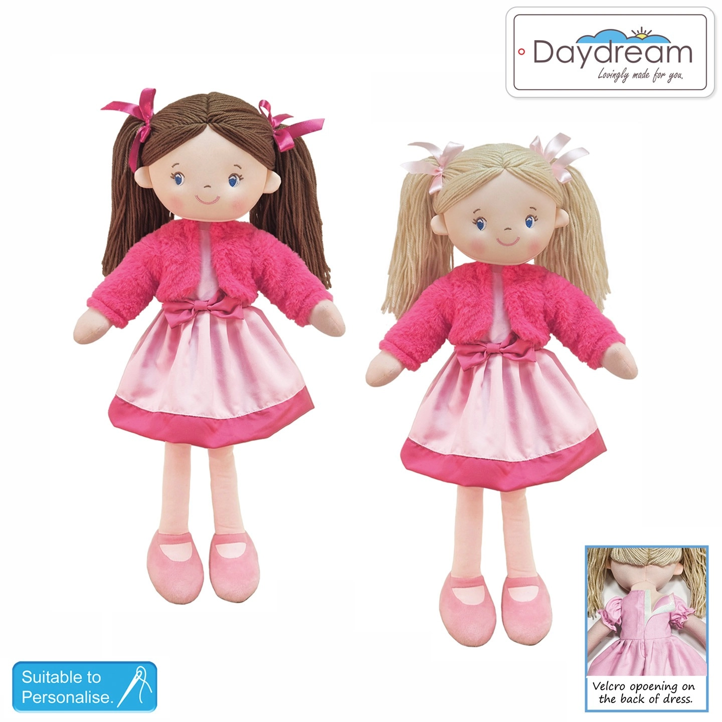 She comes in a Pink dress with a Velcro opening at the back, the jacket can also be easily removed.