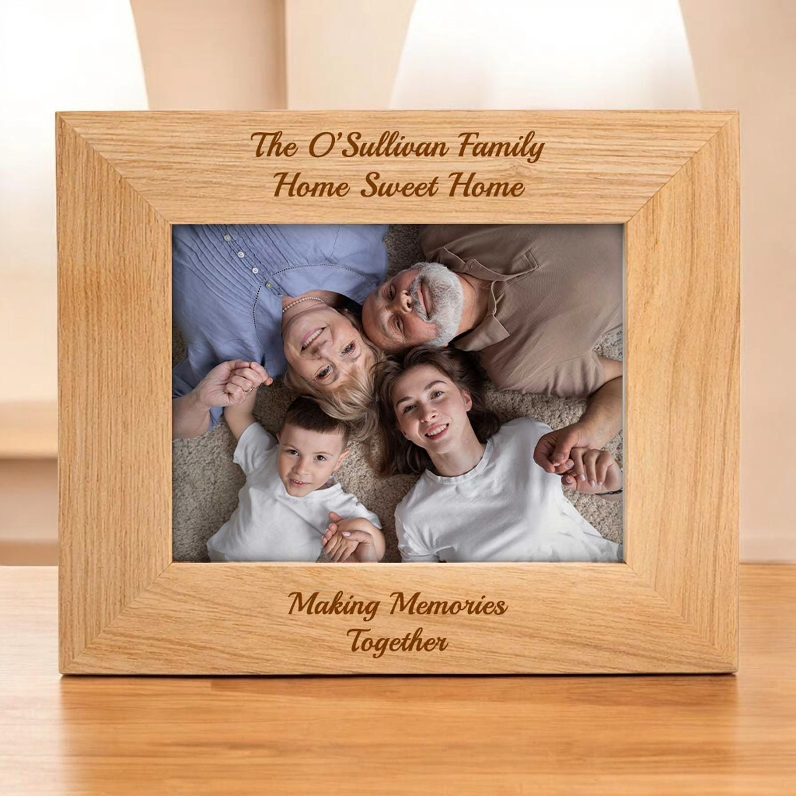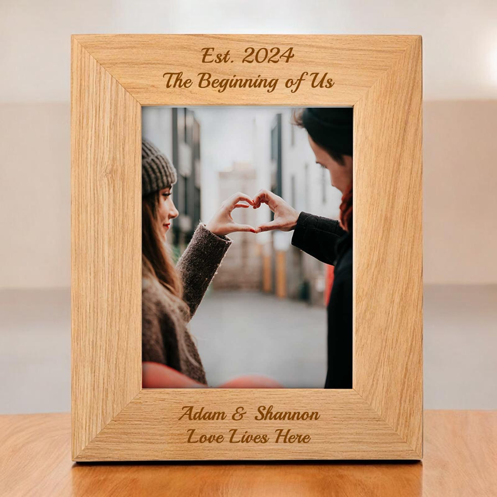 This solid oak effect personalised picture frame is the perfect way to display your cherished memories. Made from high-quality materials, making it a stylish and elegant addition to any room. The frame can be personalised with your own message or text, making it a truly unique and special gift for a loved one. With a sturdy construction and easy-to-use design, this picture frame is the perfect way to protect and display your favourite photographs for years to come.