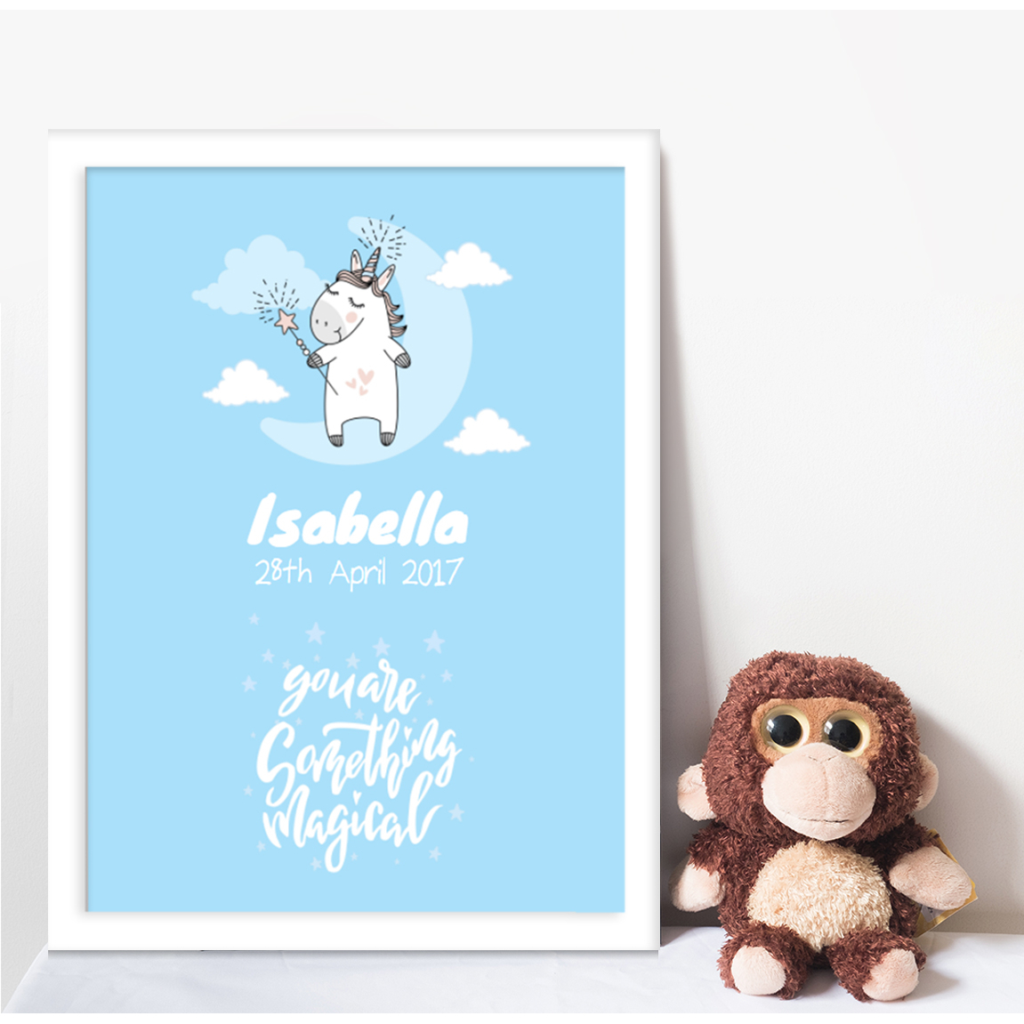 A beautiful gift for any new baby that will look fantastic in their nursury! The print contains Baby's date of birth, full name, time of birth, weight and place of birth.