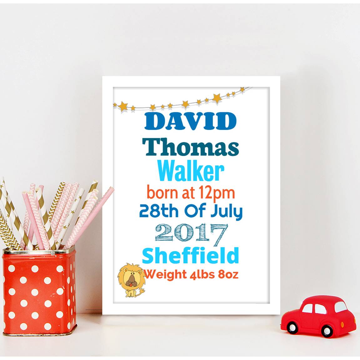 A beautiful gift for any new baby that will look fantastic in their nursury! The print contains Baby's date of birth, full name, time of birth,  weight and place of birth.