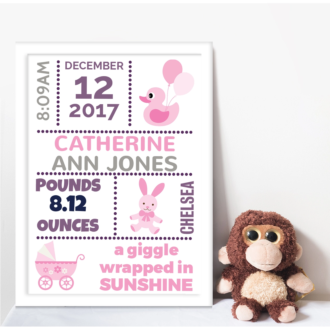 A beautiful gift for any new baby that will look fantastic in their nursury! The print contains Baby's date of birth, full name, time of birth,  weight and place of birth.