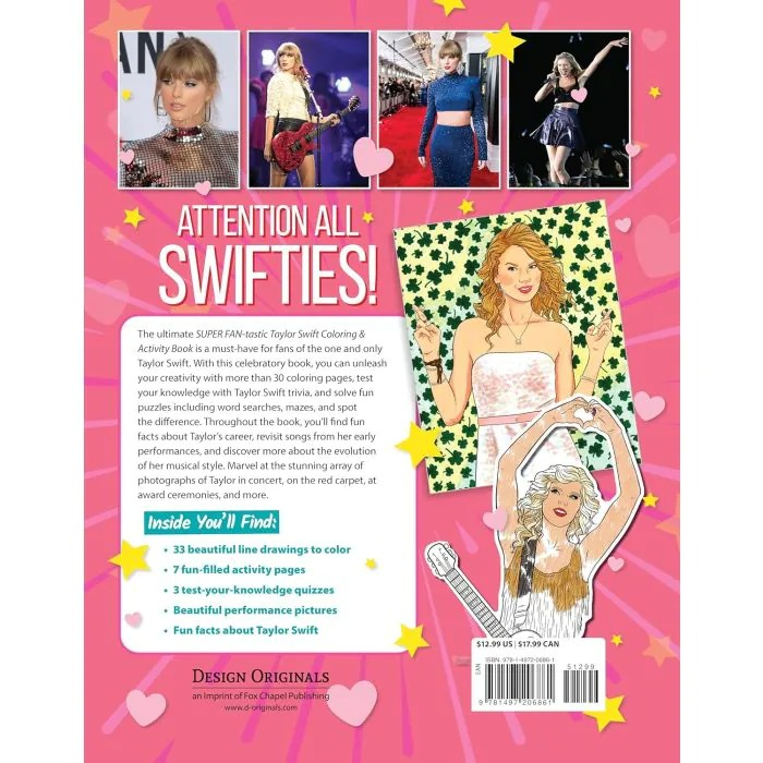 Taylor Swift is a superstar, a global sensation, and the greatest singer-songwriter of her generation! There's no better way for Swifties to celebrate all Taylor's amazing achievements and her dynamic personality than with the SUPER FAN-tastic Taylor Swift Coloring & Activity Book!