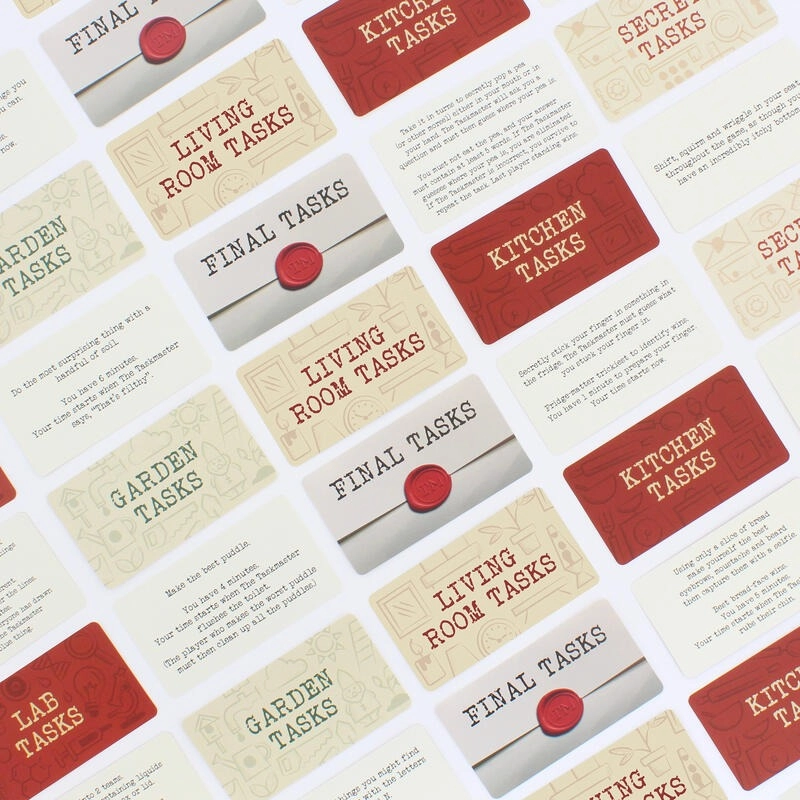 - Set up the game board by placing task cards into designated ‘rooms’.